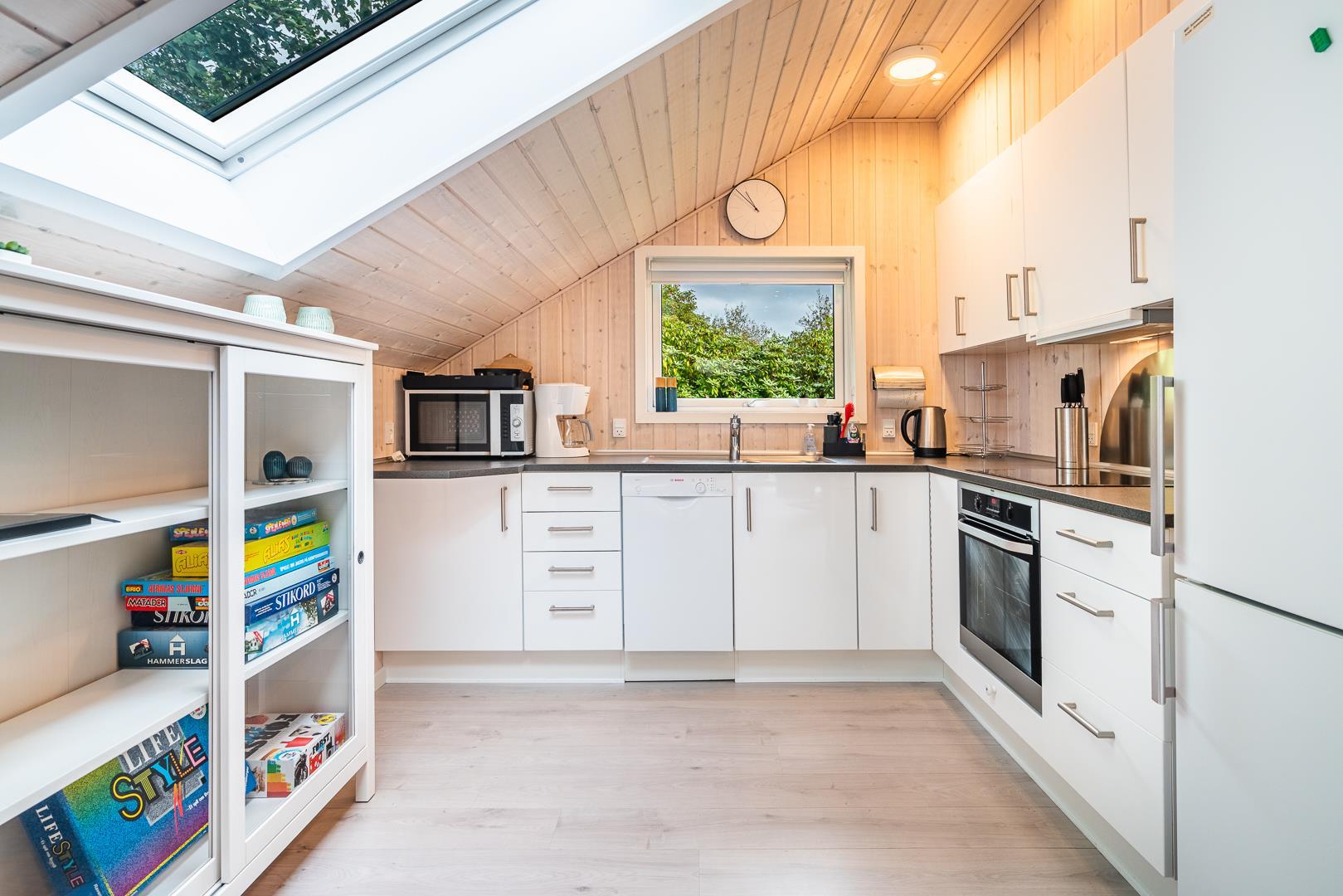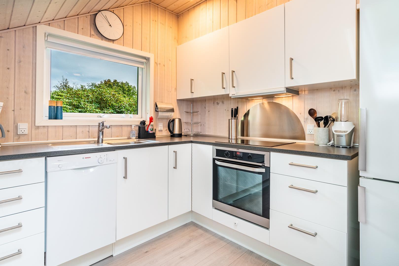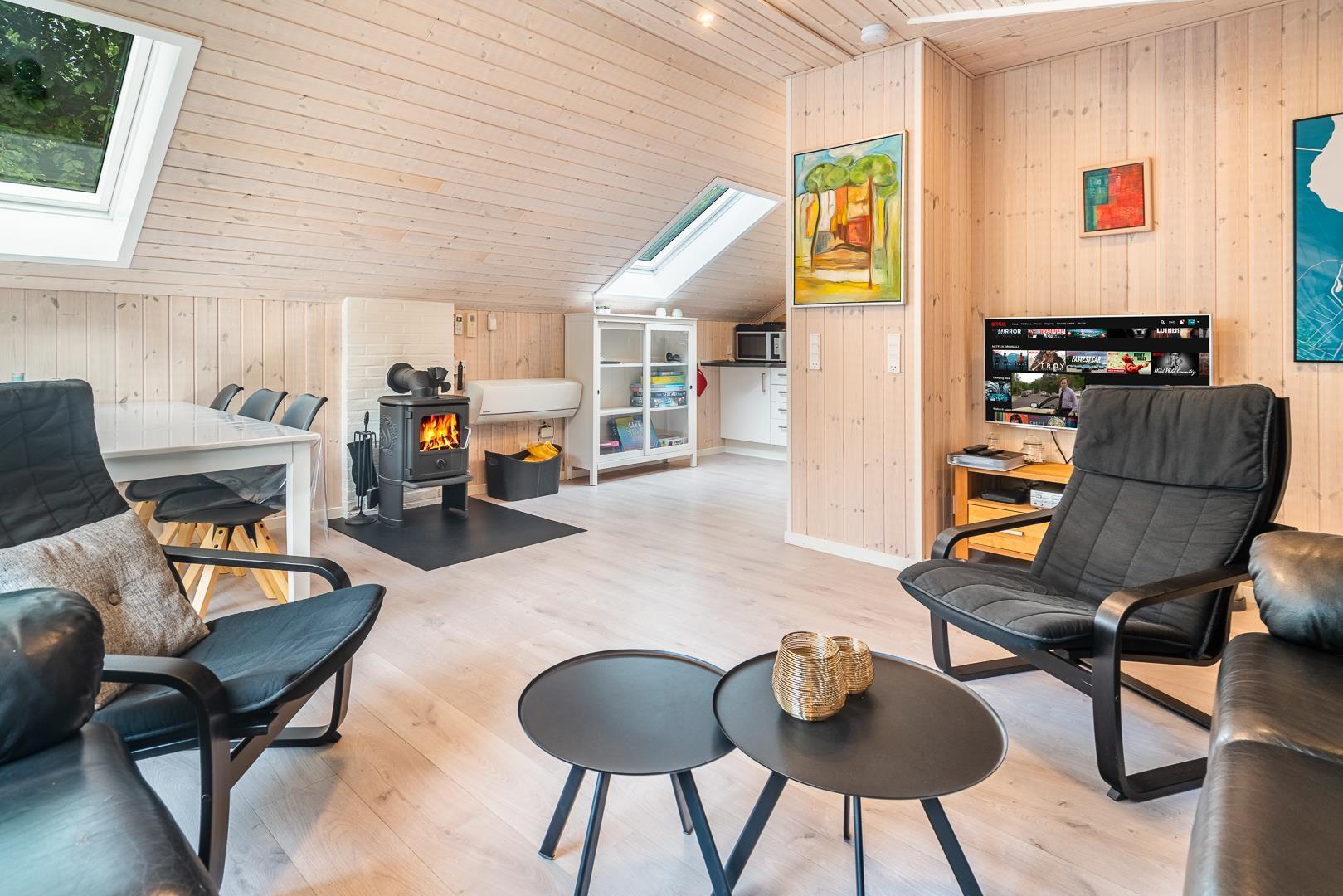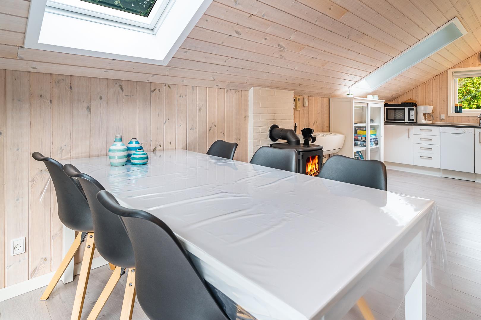 Das helle, liebevoll eingerichtete Ferienhaus verbindet typisch dänische Gemütlichkeit mit modernem Komfort. Im Wohnzimmer sorgen Kaminofen und Wärmepumpe für wohlige Wärme zu jeder Jahreszeit. Die offene Küche ist komplett ausgestattet, inklusive Spülmaschine, sodass das Aufräumen nach dem Essen schnell erledigt ist.