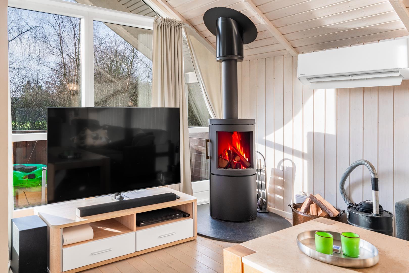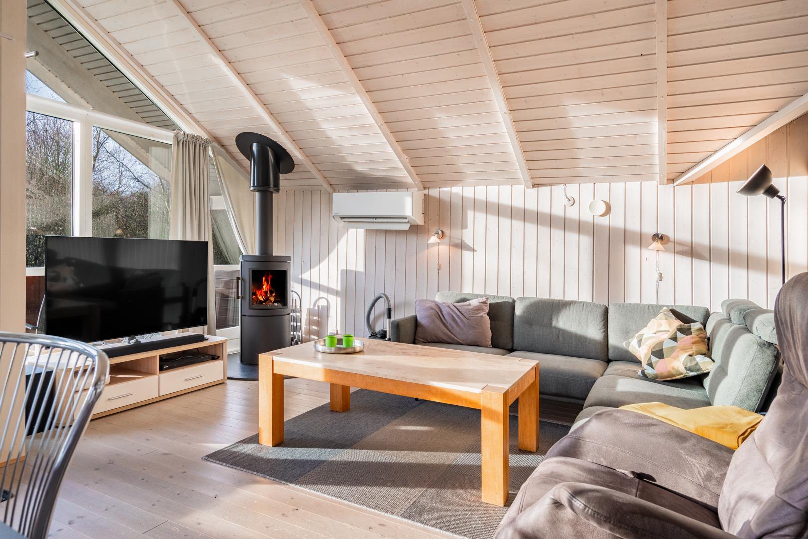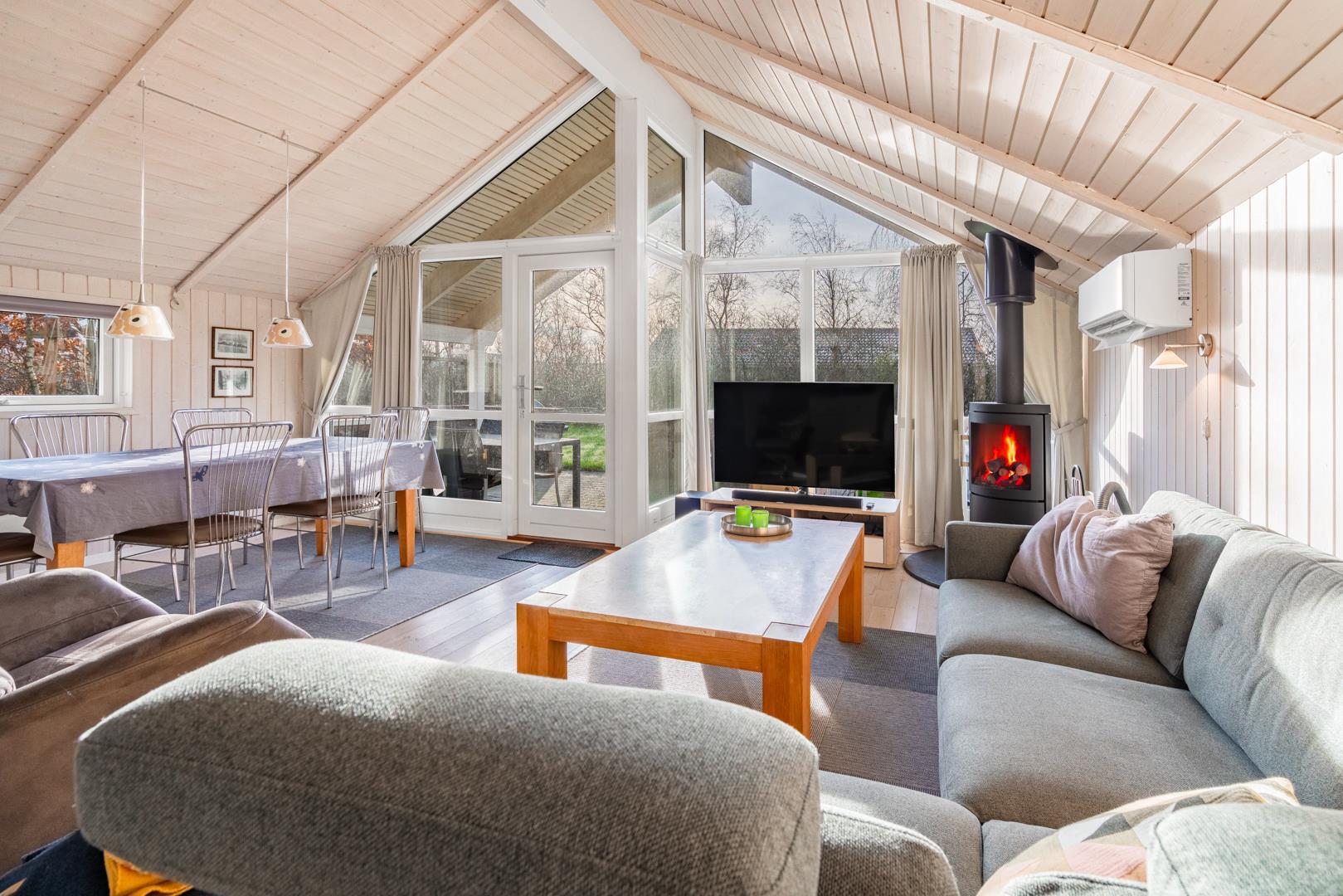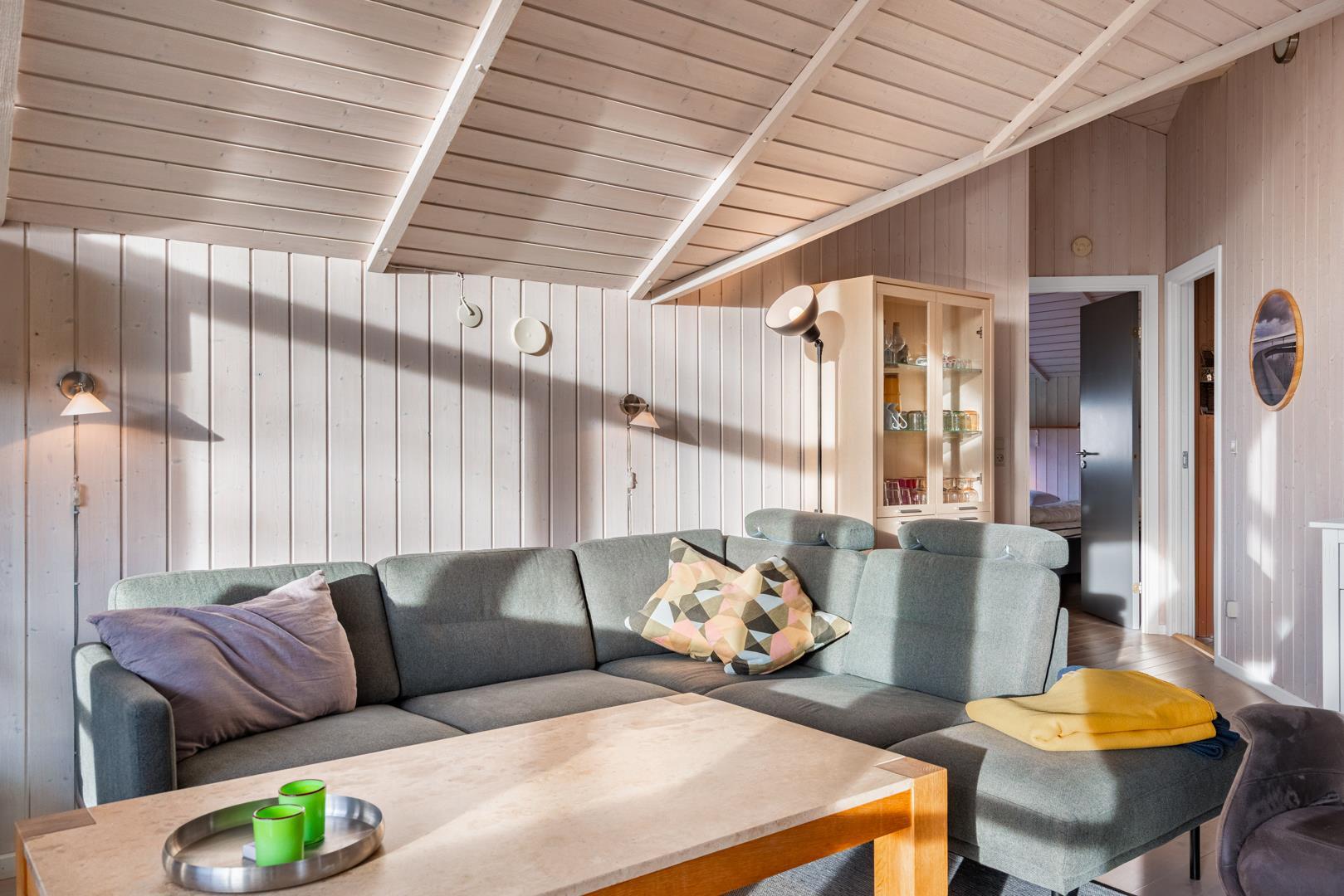 Im hellen Wohnbereich mit großen Fenstern fühlt ihr euch sofort wie zu Hause. Macht es euch auf dem Sofa gemütlich, genießt den knisternden Kamin oder die angenehme Wärme der Wärmepumpe. Die modern ausgestattete Küche mit Spülmaschine, Waschmaschine und Trockner macht euren Urlaub besonders komfortabel – ihr habt mehr Zeit für das, was wirklich zählt: Erholung.