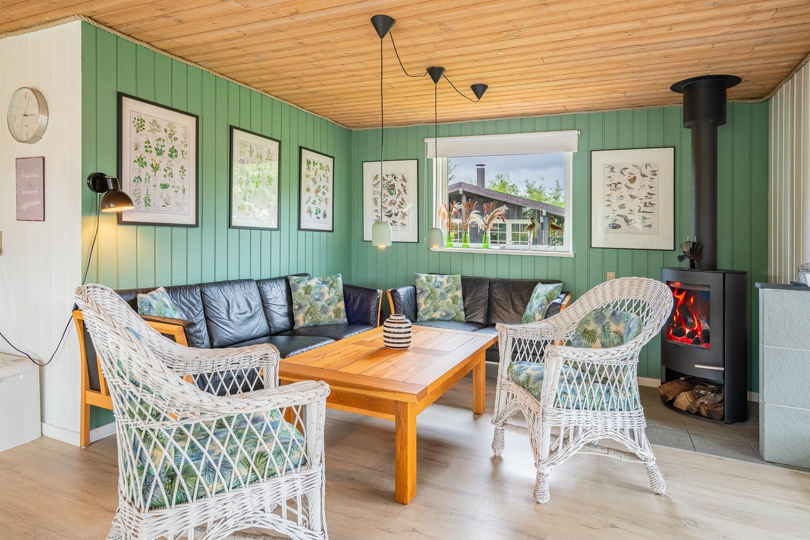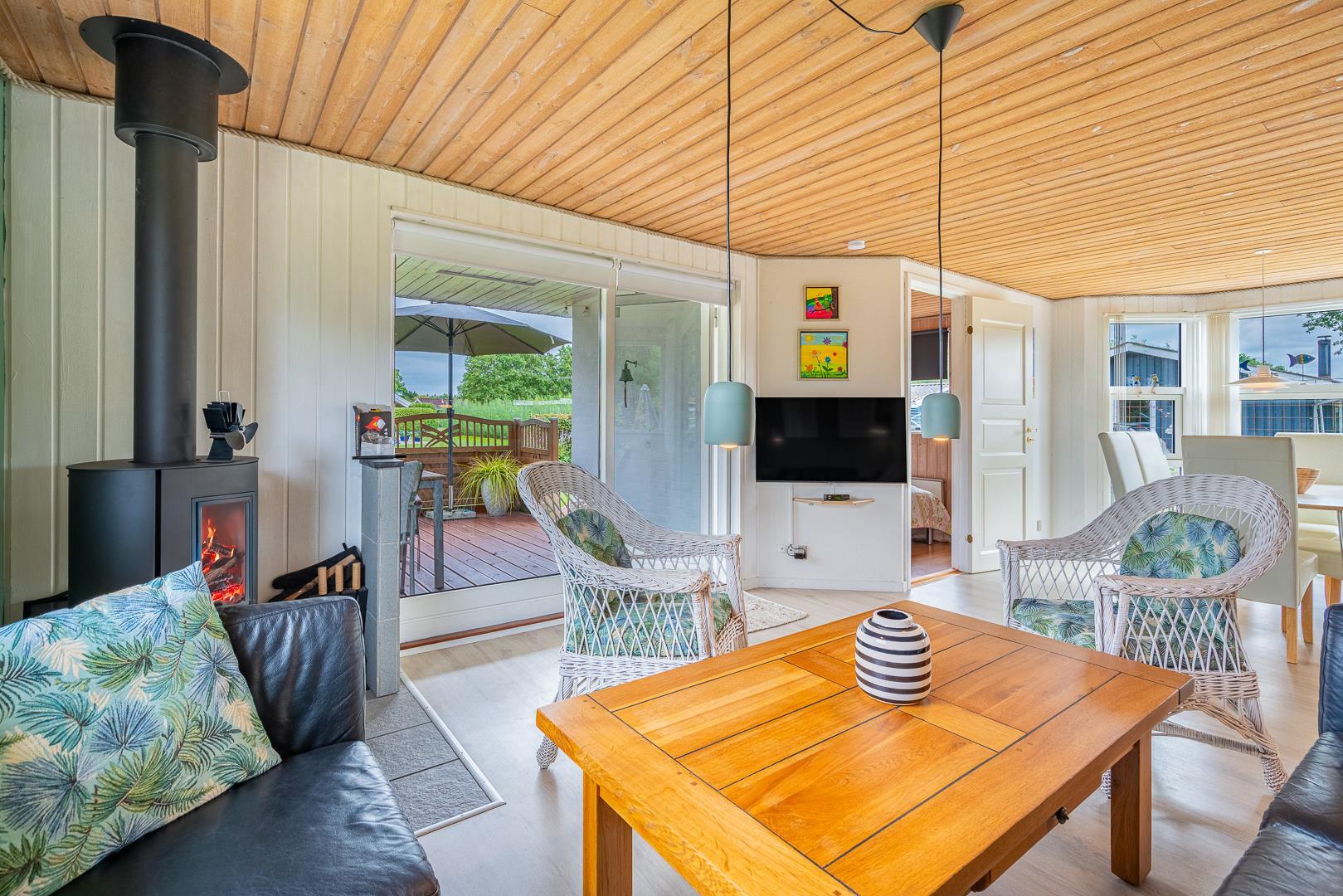 Im hellen Wohnbereich sorgen Kamin und Wärmepumpe für angenehme Temperaturen zu jeder Jahreszeit. Hier könnt ihr es euch mit einem guten Buch gemütlich machen oder gemeinsam einen Film über Chromecast schauen.