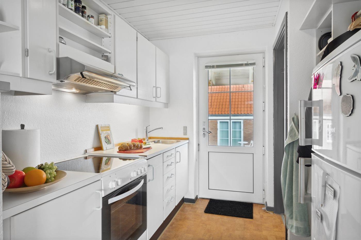 Die Küche ist mit Kühlschrank ausgestattet. Außerdem gibt es 4 Keramik-Kochfelder, Umluftofen.