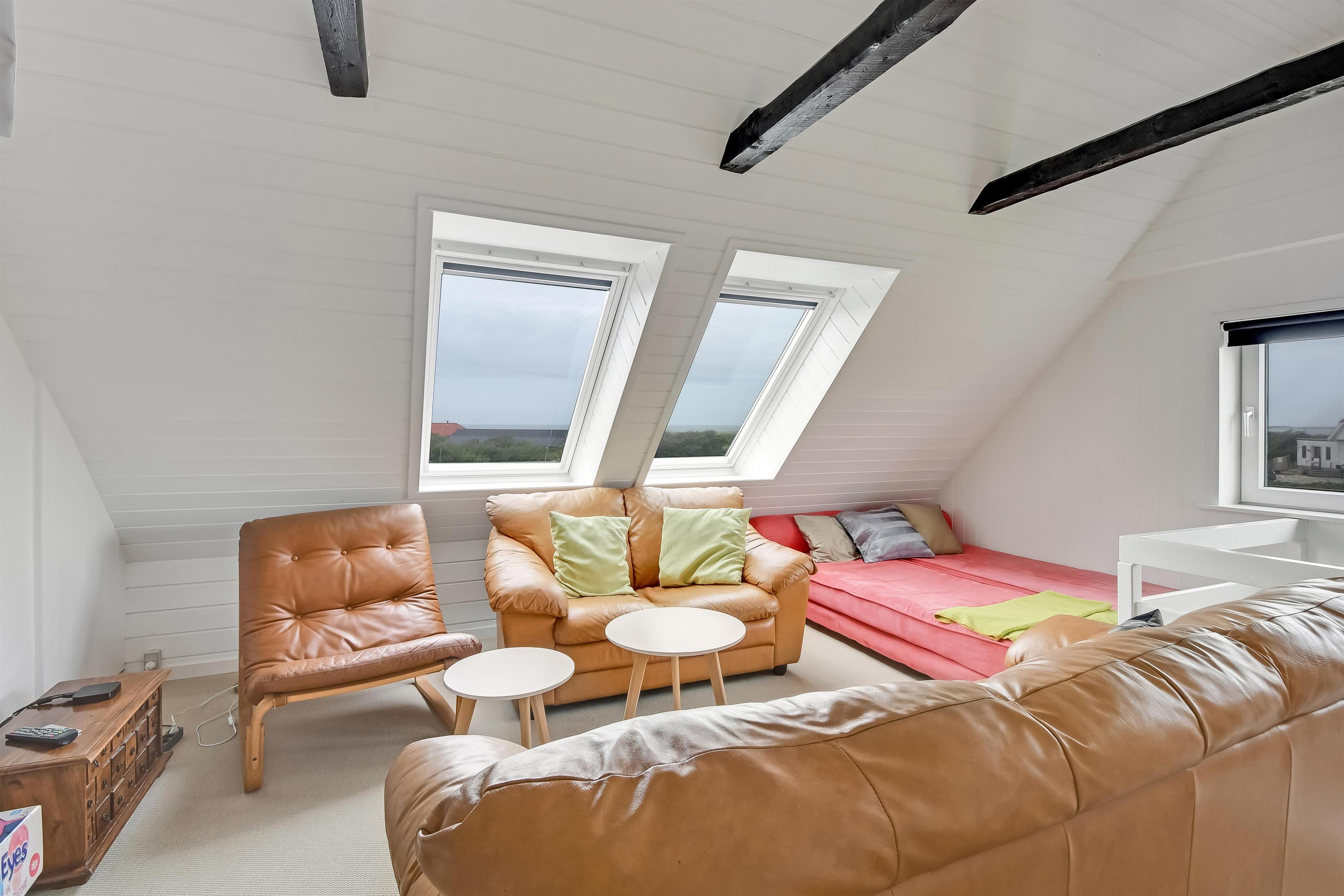 1. Stock. Treppenaufgang zum 1. Stock, wo Sie ein extra Wohnraum mit Ledermöbeln, TV mit deutsche Programme und mit der Möglichkeit, TV / Radio / Apps über Chromecast oder Apple-TV zu streamen, erwartet. Wenn Sie ein Mobiltelefon oder ein anderes Gerät bei sich haben, können Sie mit Ihrem Abonnement streamen. Hier haben Sie auch einen fantastischen Blick zur Nordsee, dem Gebiet und zum Ferring See. Im 1. Stock finden Sie auch den 2. Schlafraum mit 1 DB und 2 einzelnen Sofas im Wohnraum. Nichtraucher-Haus. Haustiere nicht erlaubt.
