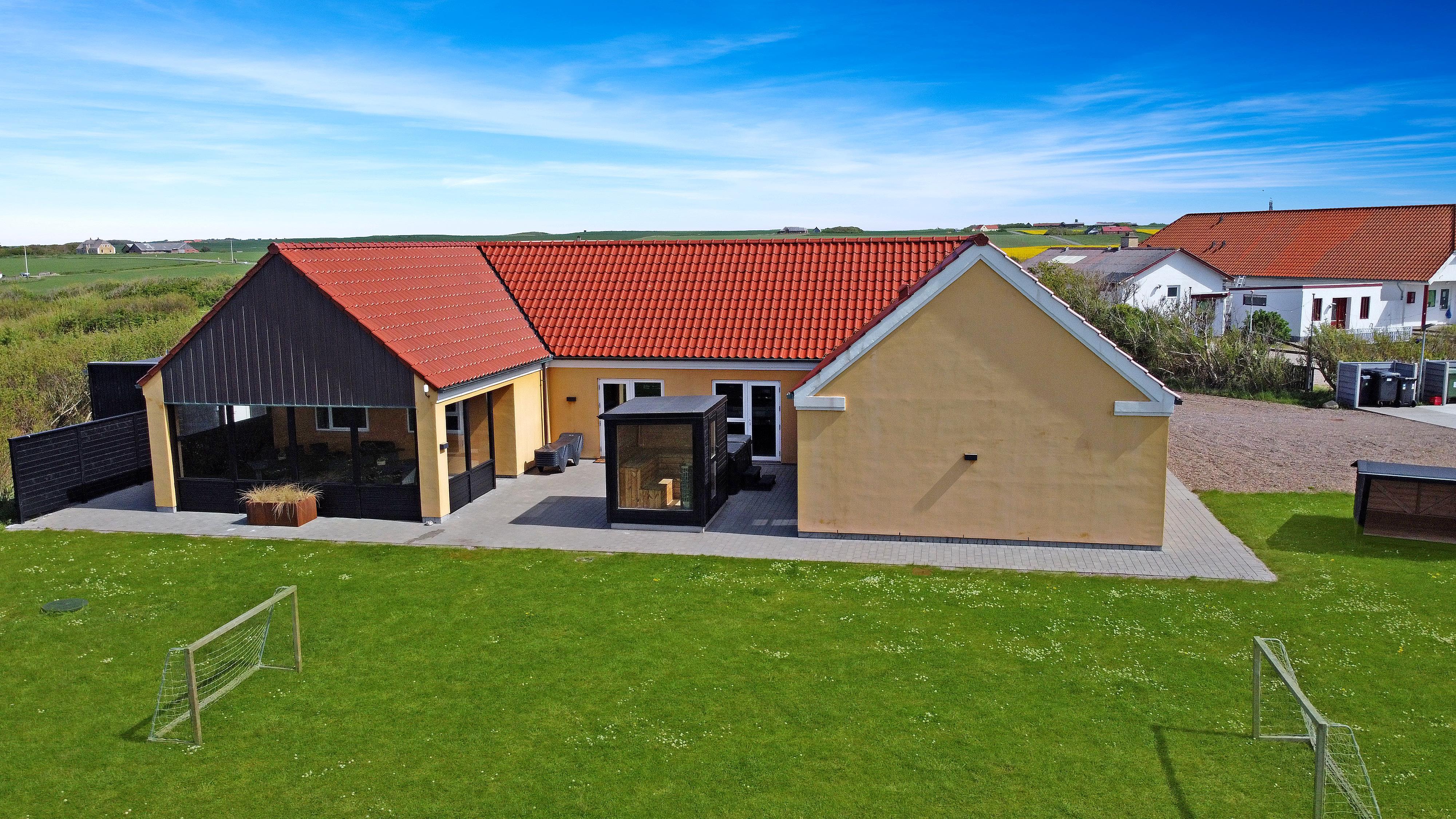 Großes, fantastisch gelegenes, neu gebautes Luxushaus. Das Haus wurde von Bovbjerg Klint erbaut und bietet Meerblick auf die Nordsee. Unter anderem, Whirlpool im Freien und eine Sauna im Freien, kostenloses WLAN und ein Aktivitätsraum mit Dart, Bob, Tischfussball und TV. Ein Haus mit Platz für maximal 14 Personen. Egal, ob zwei Familien zusammen reisen oder Kollegen, es gibt viel Platz für eine ruhige Zeit, einen Platz in der Sonne oder Wettbewerbe im Aktivitätsraum.
