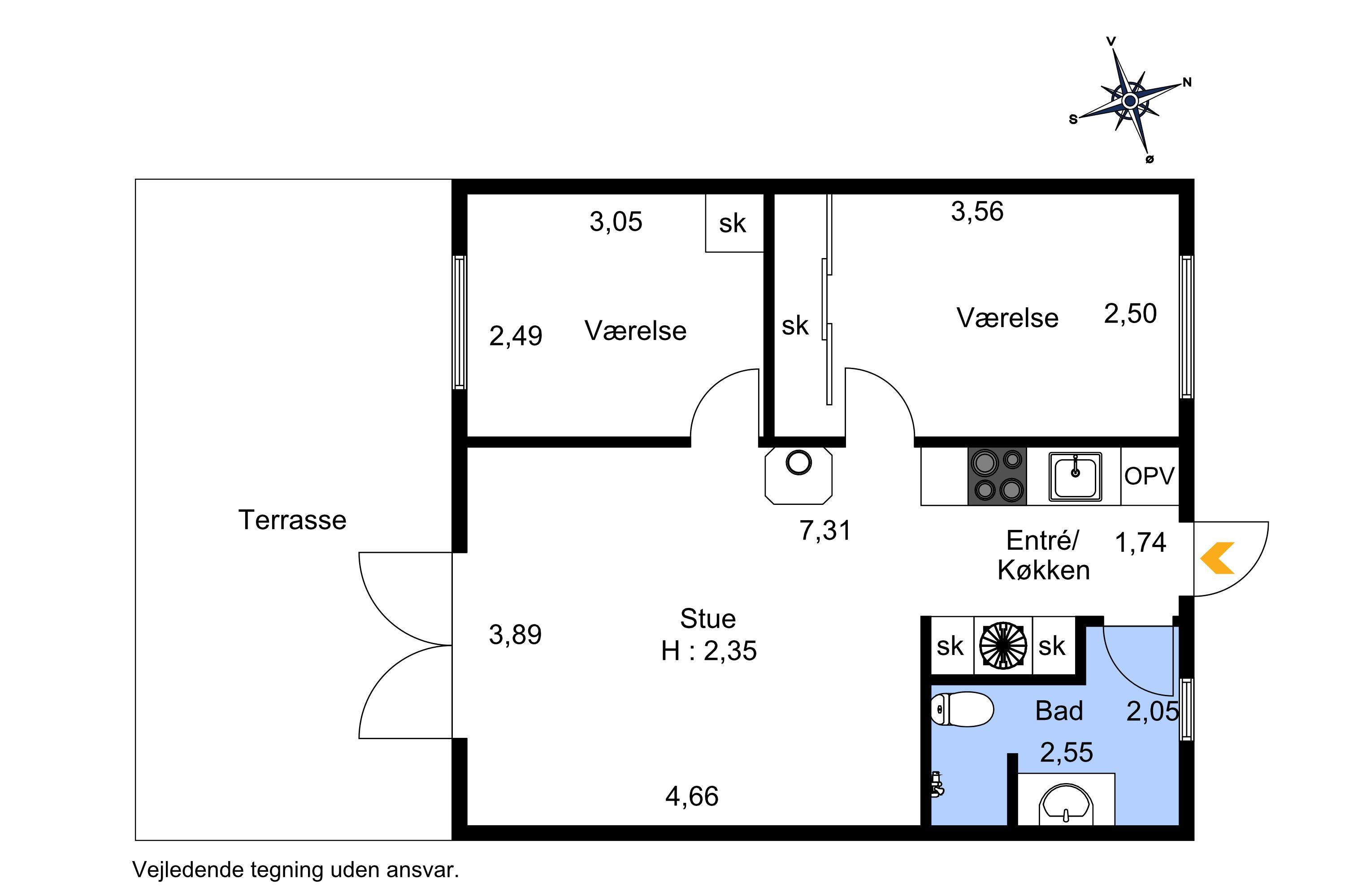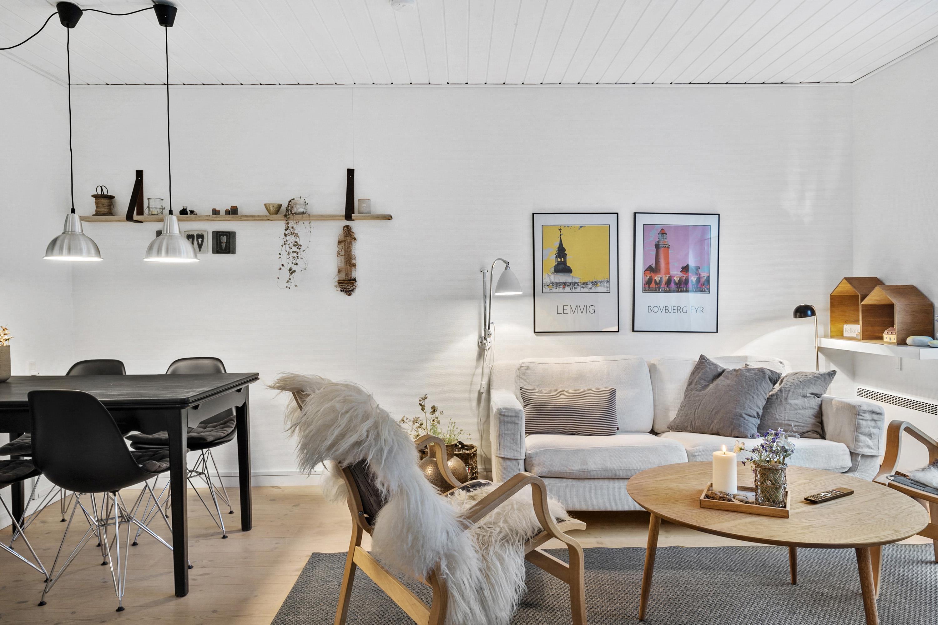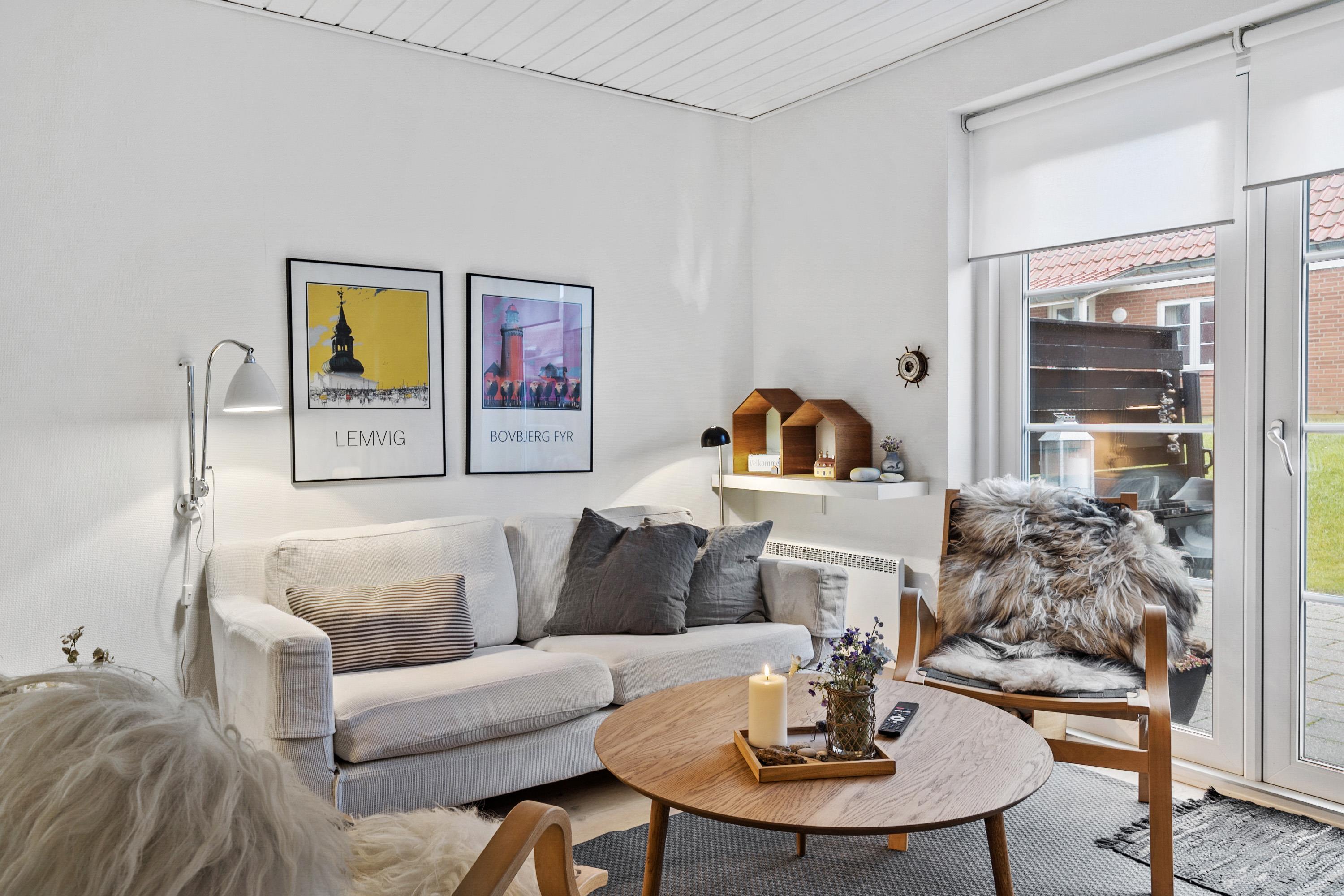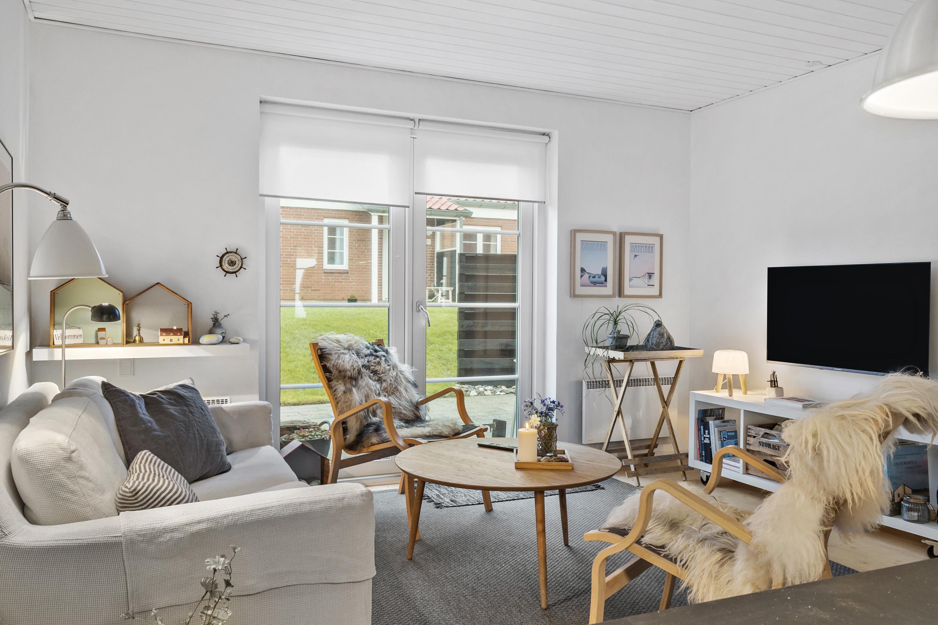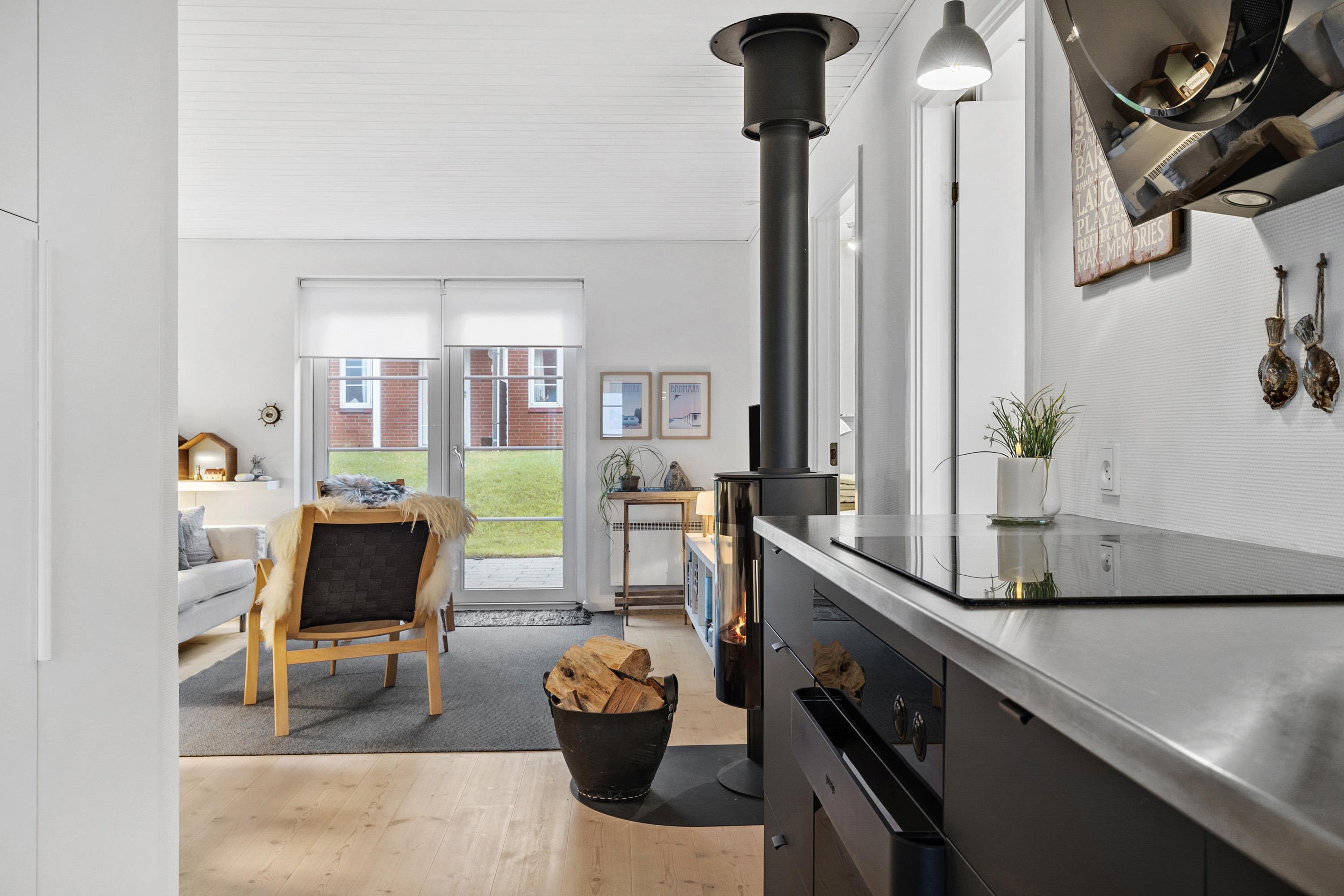 Praktisch eingerichtet mit zwei Schlafzimmern (1DS, 1DS) sowie einem kombinierten Wohn- und Küchenbereich. Das Wohnzimmer ist gemütlich möbliert und verfügt über ein großes Fenster, das für viel Tageslicht sorgt. Zudem gibt es einen Fernseher mit dänischen und skandinavischen Sendern, Chromecast, einen DVD-Player sowie einen stimmungsvollen Kaminofen.
