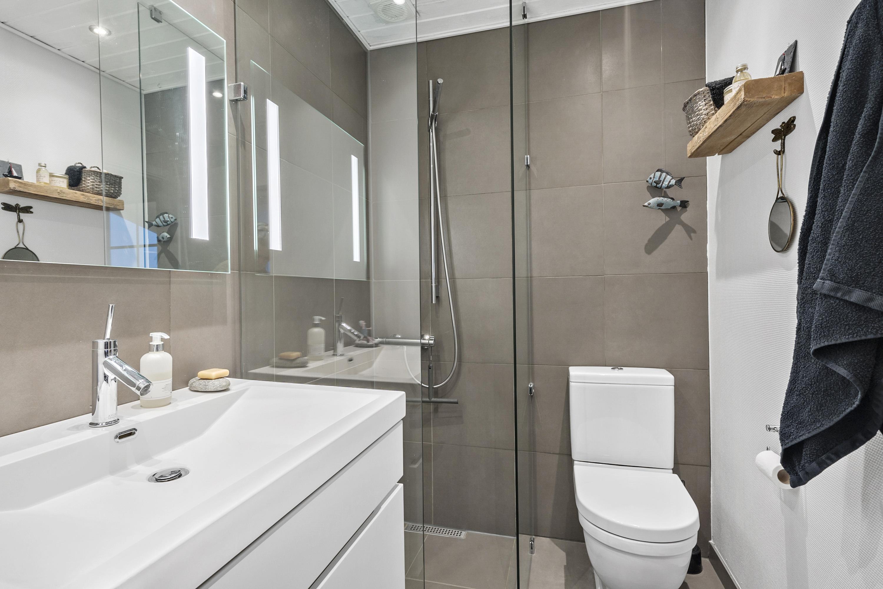 Die neue Küchenzeile ist mit Keramikkochfeldern, einer Dunstabzugshaube, einem Einbaubackofen, einem Kühlschrank mit separatem Gefrierfach (ca. 20L) sowie einer Spülmaschine ausgestattet. Das Badezimmer wurde neu renoviert und verfügt über eine Dusche, ein WC, ein Waschbecken und einen gefliesten Boden.