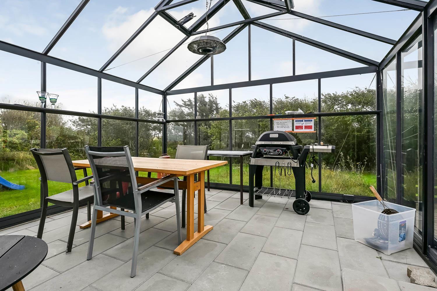 Das 5.000 m² große Grundstück bietet viel Platz, und der Garten ist dank der üppigen Bepflanzung gut vor Wind geschützt und angenehm uneinsehbar. Von der Terrasse aus haben Sie direkten Zugang zu dem großen, schönen Orangerie-Gewächshaus, das mit komfortablen Loungemöbeln sowie einem Esstisch und Stühlen eingerichtet ist. Hier können Sie geschützt im Innenbereich sitzen und die herrliche Aussicht auf die umliegenden Felder und die ruhige Landschaft genießen – ideal zum Entspannen und für gemütliche Mahlzeiten bei jedem Wetter.