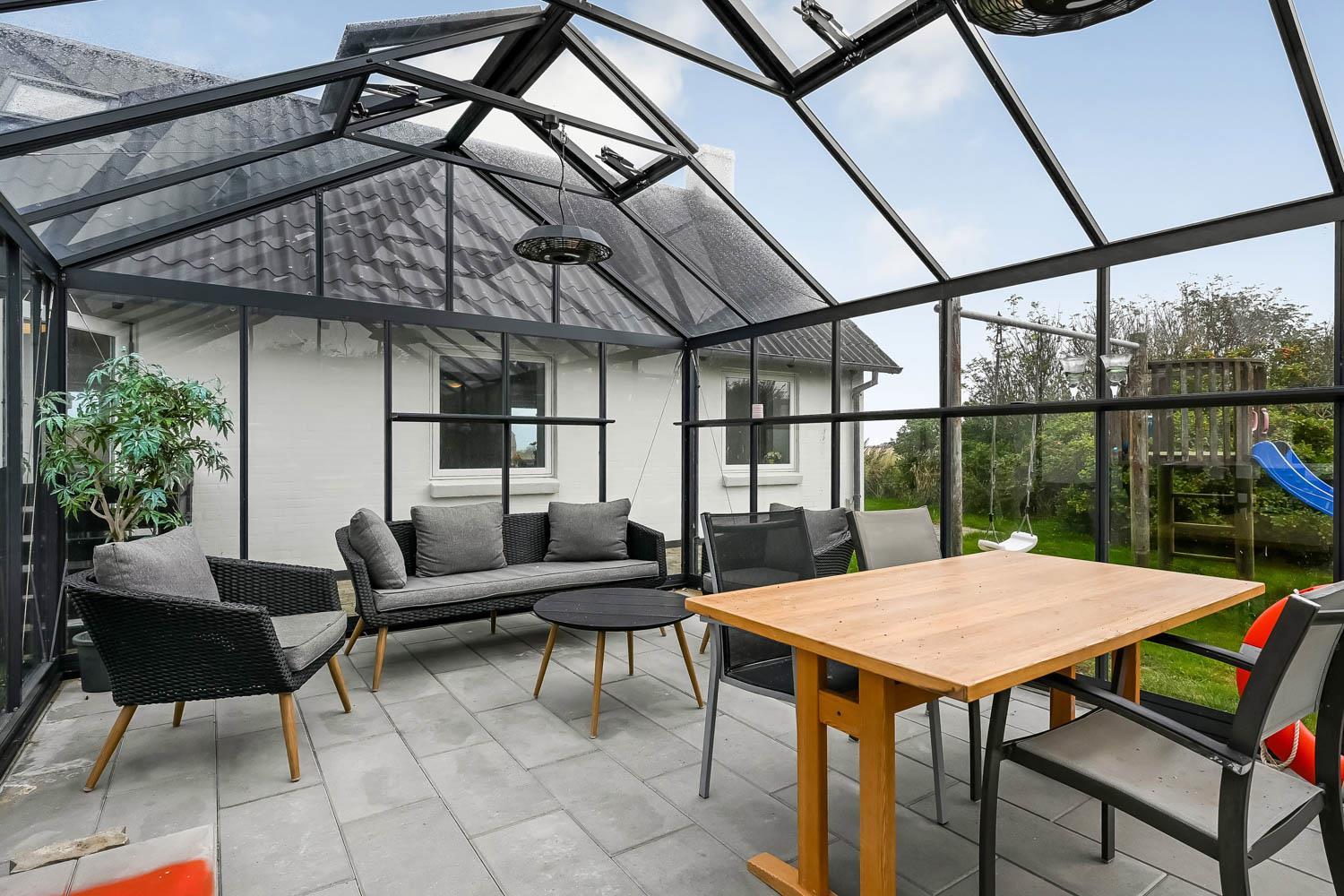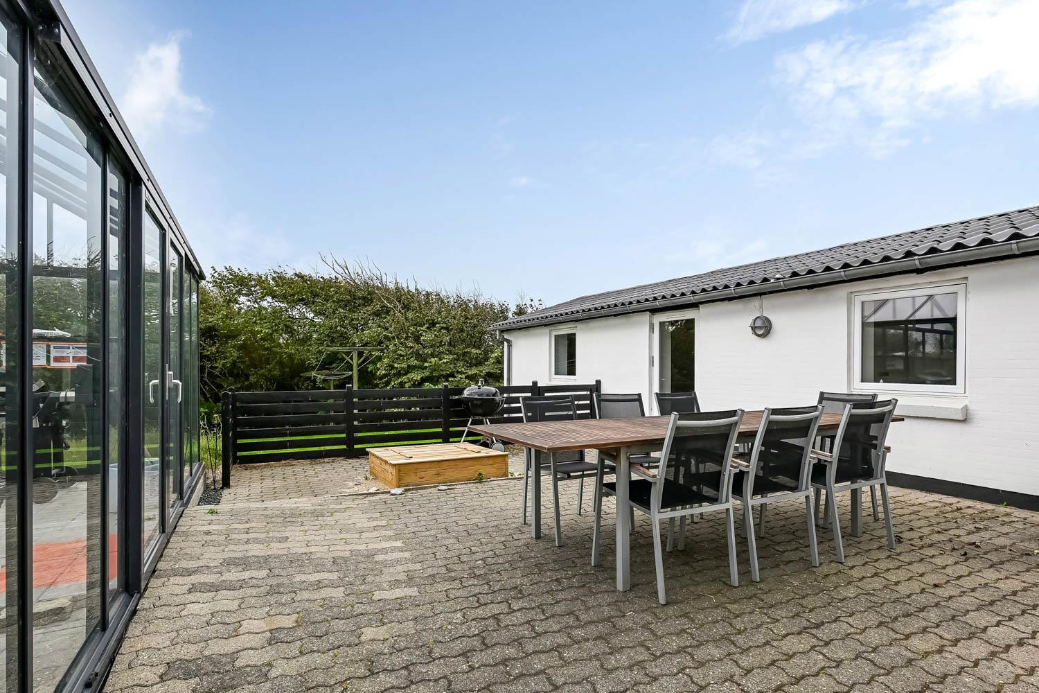 Die Terrasse ist mit einem Geländer eingezäunt, sodass weder Hunde noch Kinder unbeaufsichtigt hinauslaufen können. Es stehen Gartenmöbel, Sonnenliegen und ein Grill zur Verfügung. Im Garten befinden sich außerdem ein Sandkasten sowie ein Spielturm mit Schaukeln und Rutsche. Rund um das Haus sind Pflastersteine verlegt. Das Haus liegt in der Nähe des Jens-Søndergård-Museums und nicht weit vom Leuchtturm Bovbjerg Fyr entfernt. Genießen Sie einen wunderbaren Spaziergang oder Lauf auf dem Weg entlang der Steilküste von Bovbjerg Klint mit einzigartigem Blick auf die Nordsee. Erleben Sie, wie die Nordsee jeden Tag eine neue Geschichte erzählt. Viele Sehenswürdigkeiten und Ausflugsziele sind innerhalb von maximal 30 Minuten erreichbar. Besuchen Sie auch den Fischerort Thyborøn oder die gemütliche Handelsstadt Lemvig mit zahlreichen Fachgeschäften. In den Sommermonaten können die wichtigsten Einkäufe auf dem Campingplatz Bovbjerg erledigt werden.