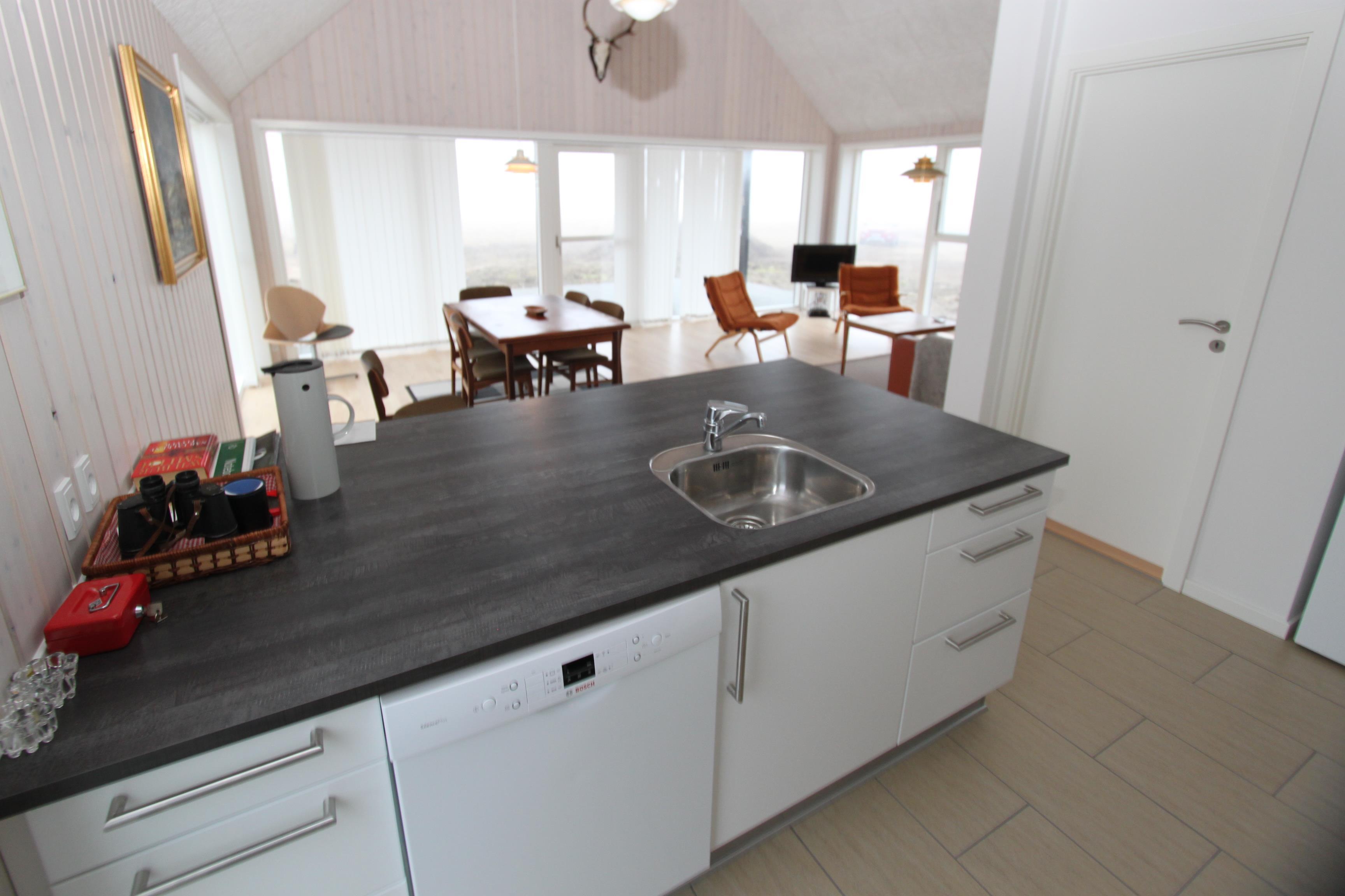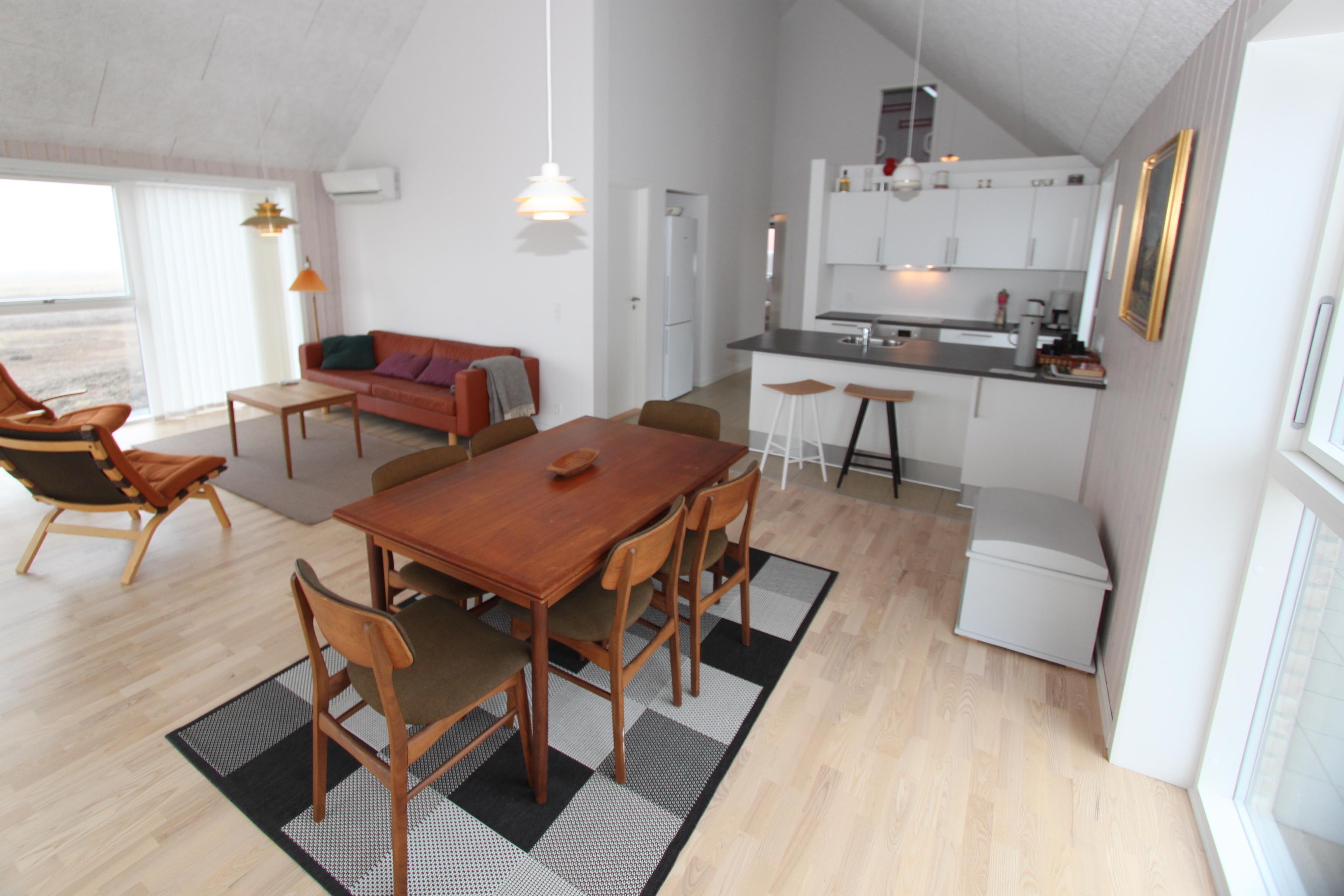 Das neu gebaute Ferienhaus liegt optimal auf einem Grundstück direkt an der Nordsee mit einem richtig guten Lichteinfall durch die großen Fenster und offenen Decken. Das Wohnzimmer hat Holzboden und ist schön eingerichtet. Hier gibt es ein Flachbildschirm-TV mit dänischem und deutschem Programm (Satellitenempfang). Offene Küche mit Wohn- und Essbereich, gut ausgestattet, u. a. mit Geschirrspülmaschine. Die Küche dient als Konversationsküche, wo Sie an der Bar sitzen und das Kochen verfolgen können. Es ist eine Wärmepumpe installiert, die das Haus energieeffizient macht. Hauswirtschaftsraum mit Waschmaschine und Wäschetrockner. Badezimmer mit Fußbodenheizung, Dusche und Sauna. 3 Schlafzimmer mit Doppelbetten (DB) und Einzelbetten (EB): 1 DB + 1 DB + 1 EB sowie ein Hems mit 2 weiteren Schlafmöglichkeiten. 1 Haustier ist erlaubt. Nichtraucherhaus.