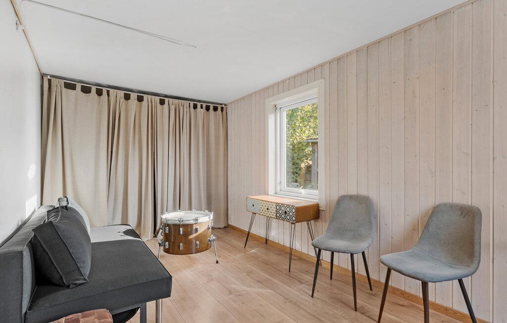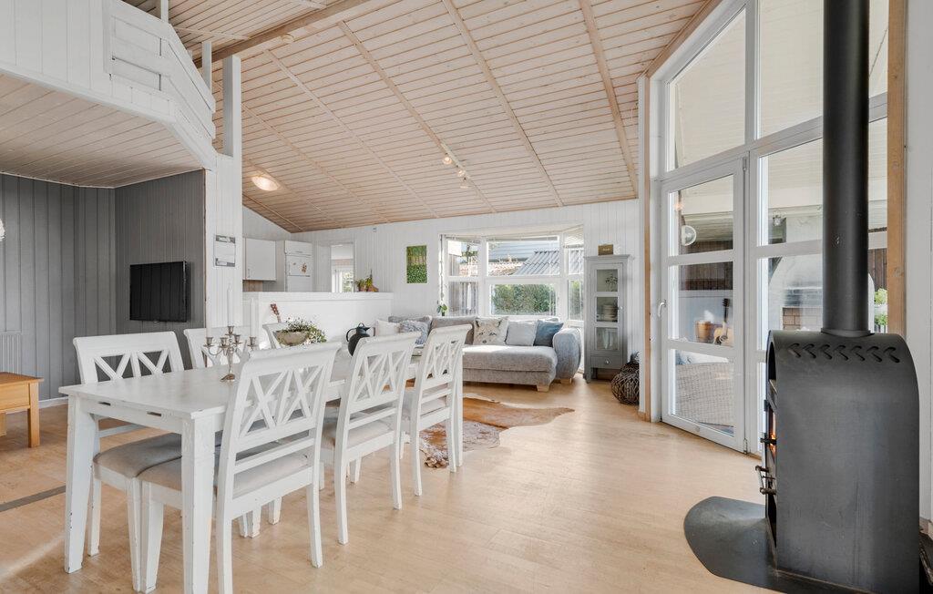 Im Inneren erwartet Sie ein einladender Wohnbereich mit großen Fensterfronten, die viel Licht hereinlassen und gleichzeitig eine wunderbare Aussicht auf den Garten bieten. Machen Sie es sich auf dem bequemen Sofa gemütlich oder genießen Sie ein gemeinsames Abendessen am großen Esstisch vor dem wärmenden Kaminofen.