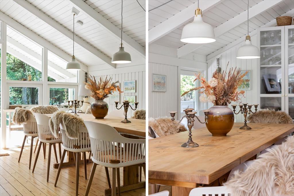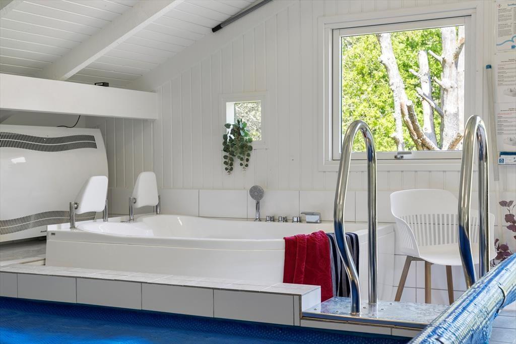 Das Ferienhaus ist hell, einladend und im charmanten nordischen Stil eingerichtet, der eine gemütliche Atmosphäre schafft. Das Herzstück des Hauses ist das großzügige Wohnzimmer, in dem große Fensterpartien die Natur ganz nah heranholen. Hier können Sie es sich auf dem Sofa gemütlich machen, mit der Familie Gesellschaftsspiele spielen oder ein gemeinsames Abendessen am Esstisch genießen. Falls das Wetter einmal nicht mitspielt, können Sie sich vor dem Kamin aufwärmen oder in den hauseigenen Innenpool springen, der ganzjähriges Badevergnügen garantiert. Nach einem langen Tag in der Natur können Sie sich in der Whirlwanne entspannen oder sich in der Sauna aufwärmen – der perfekte Abschluss für einen erholsamen Urlaub.