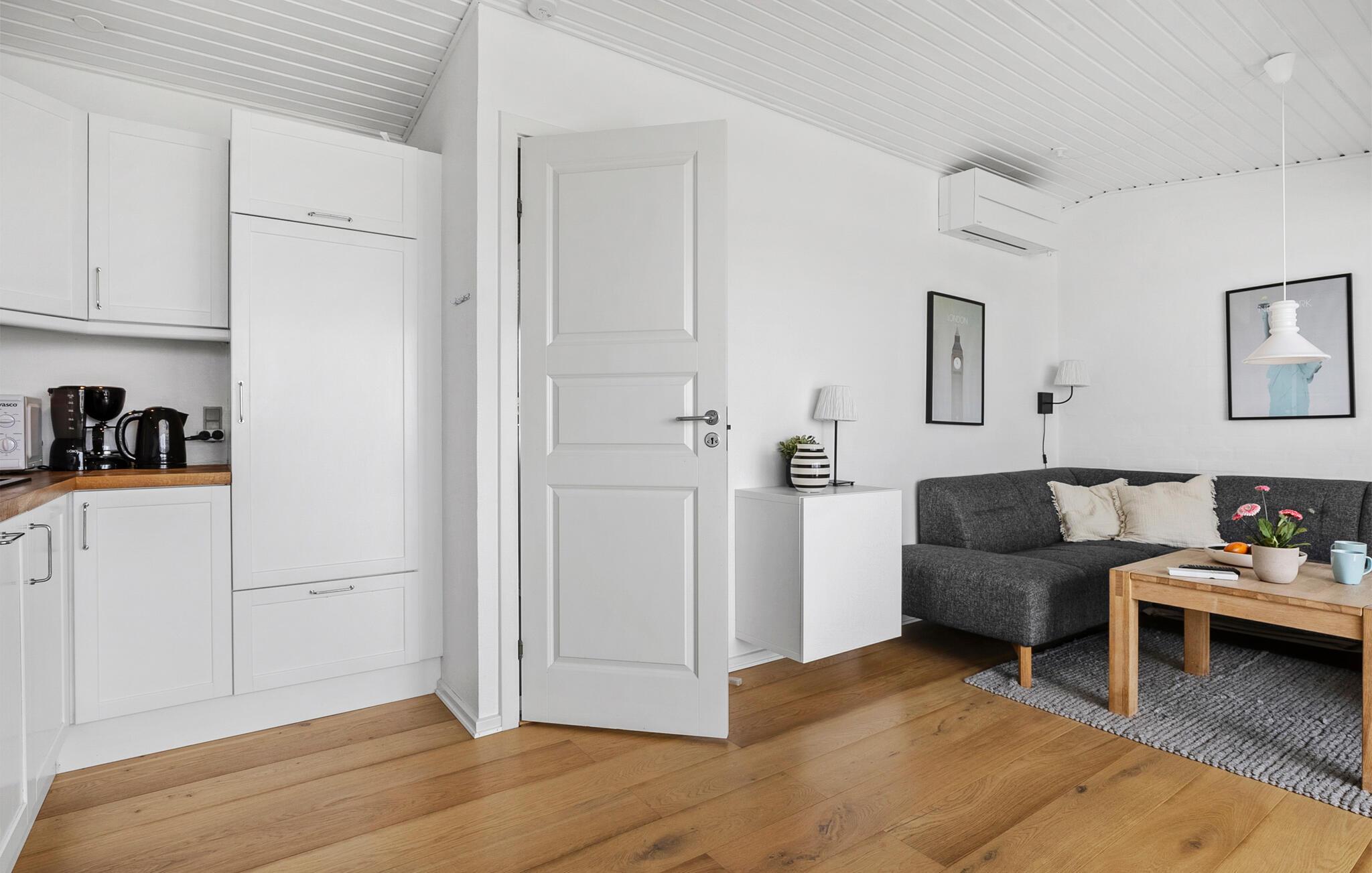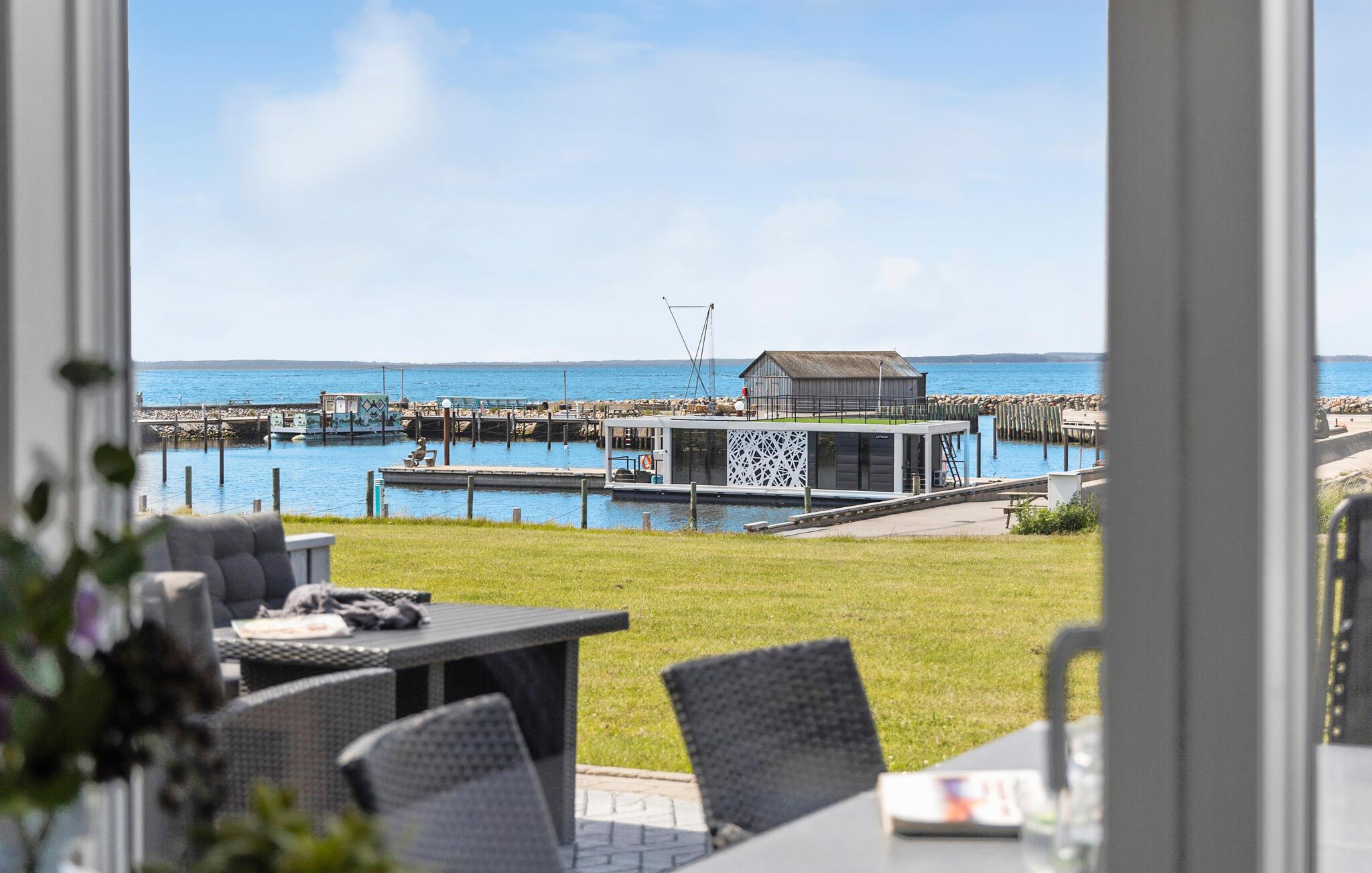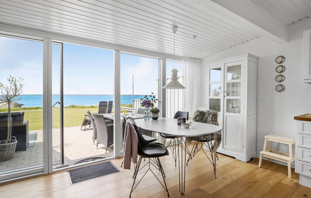 Dieses gepflegte Ferienhaus erwartet Sie mit einer einmaligen Lage direkt am Meer und bietet beste Voraussetzungen für erholsame Tage am Wasser. Freuen Sie sich auf den lichtdurchfluteten Wohnbereich mit großen Fensterfronten, durch die Sie einen ungestörten Blick auf das Meer und den kleinen Hafen genießen. Machen Sie es sich auf dem Sofa bequem oder versammeln Sie sich am Esstisch zu einem Frühstück mit Aussicht. Die kleine, helle Küche ist offen in den Wohnraum integriert. Genießen Sie die wohnliche Atmosphäre und den klaren nordischen Stil.