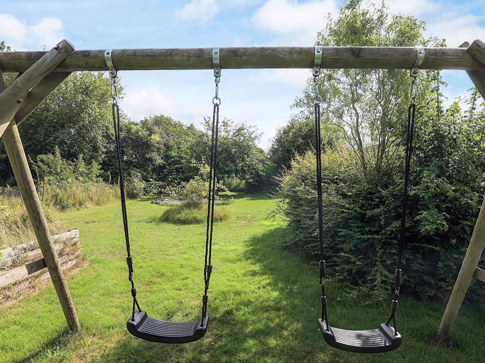Vom Wohnzimmer und Flur aus gelangen Sie auf die großzügige Holzterrasse, die schnell zum Mittelpunkt des Sommerlebens wird. Hier können Sie bis in den Abend grillen und an sonnigen Nachmittagen mit einem Buch entspannen oder einfach den Geräuschen der Natur lauschen. Das umliegende Grundstück ist groß und geschützt und bietet Kindern einen sicheren Rückzugsort zum Spielen. Schaukeln, ein Sandkasten und ein Bodentrampolin (Benutzung auf eigene Gefahr) verleihen dem Garten das Gefühl eines eigenen kleinen Abenteuerparks.