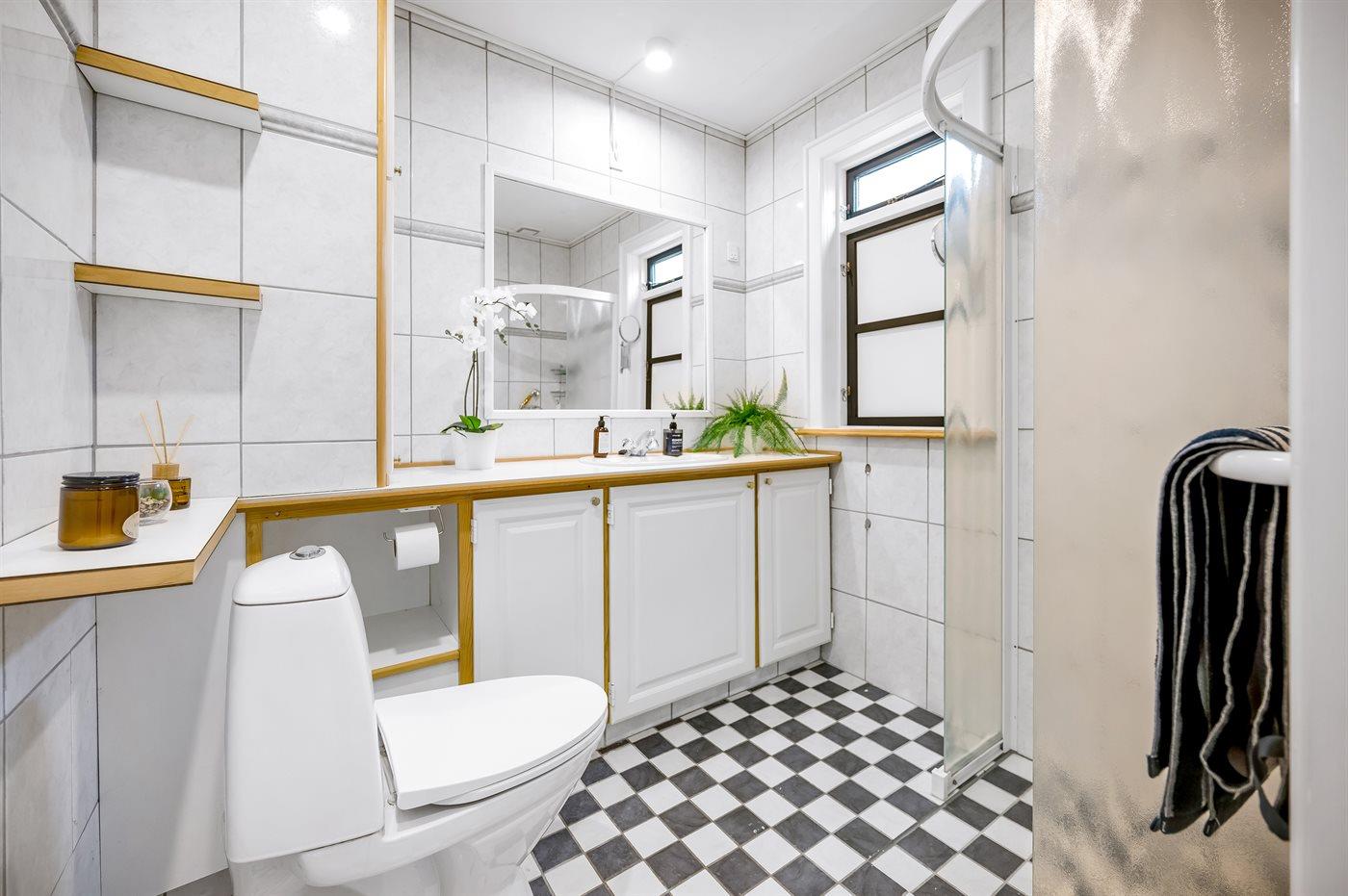 Es gibt 1 Badezimmer mit Duschnische und 2 Toiletten, davon 1 Gästetoilette. Fußbodenheizung in 1 Badezimmer. Fußbodenheizung in der Gästetoilette.