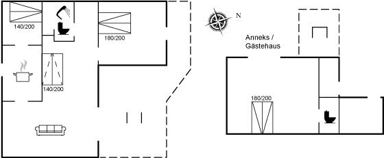 Im Haus gibt es zwei Schlafzimmer mit jeweils zwei Schlafplätzen in Doppelbetten. Im großen Schlafzimmer ist das Bett mit elektrischer Verstellung ausgestattet. Im Wohnzimmer befindet sich eine Schlafcouch mit zwei weiteren Schlafplätzen. Im 30 Quadratmeter großen Gästehaus gibt es ebenfalls ein Doppelbett mit zwei Schlafplätzen sowie eine Toilette. Das Haus eignet sich daher hervorragend für zwei Familien. Im Haupthaus befindet sich ein Badezimmer mit Duschnische und Fußbodenheizung. Beheizt wird das Haus mit Elektroheizkörpern und einem Kaminofen. Das Gästehaus verfügt über eine Elektroheizung.