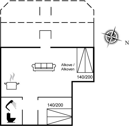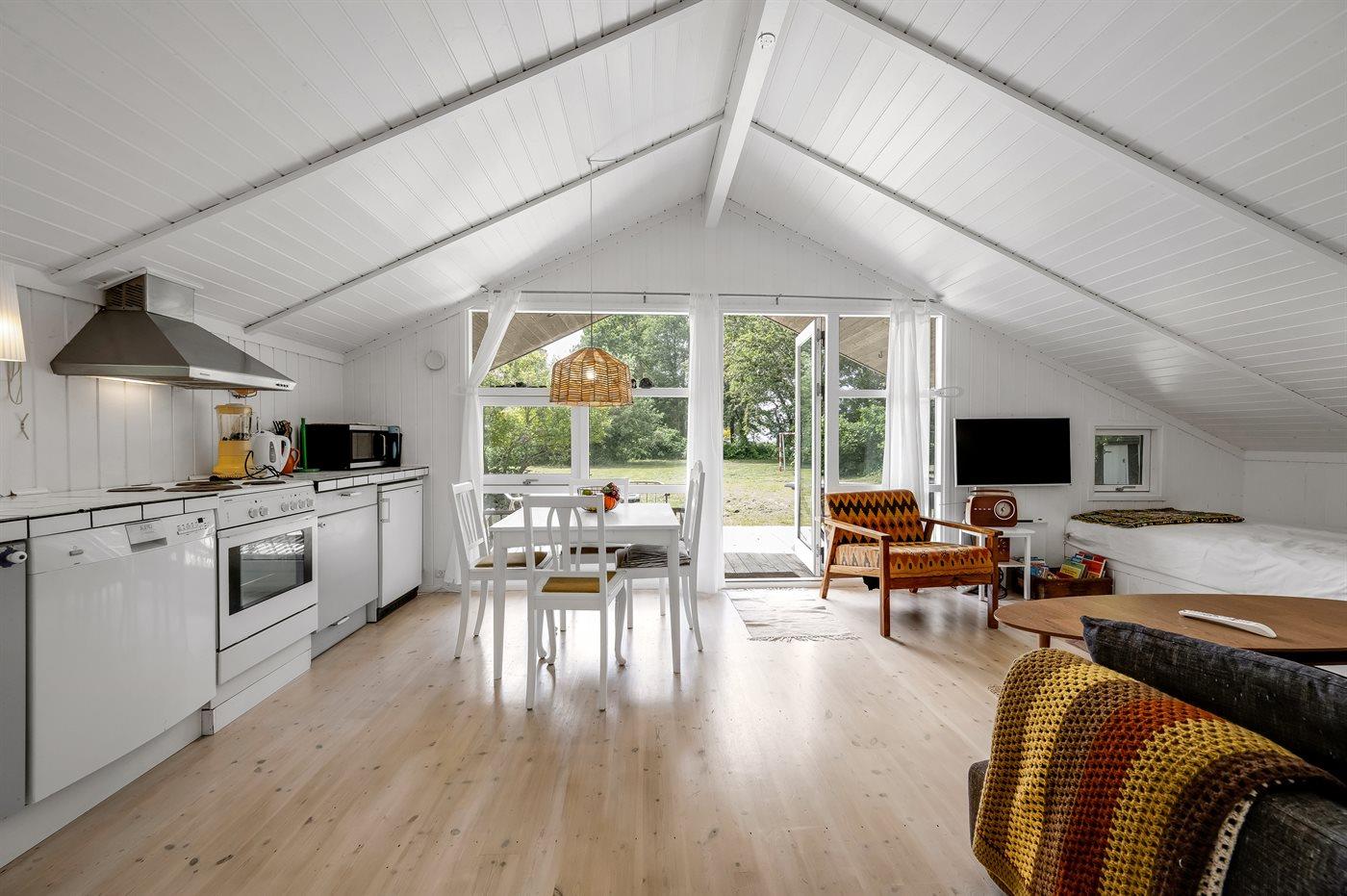 Das Haus ist hell und verfügt über eine Wohnküche, und von hier aus gelangst du auf die überdachte Terrasse und in den Garten. Es gibt ein Schlafzimmer mit Doppelbett sowie ein Alkoven im Wohnzimmer mit zwei Schlafplätzen. Das Badezimmer ist mit Duschnische und Fußbodenheizung ausgestattet.