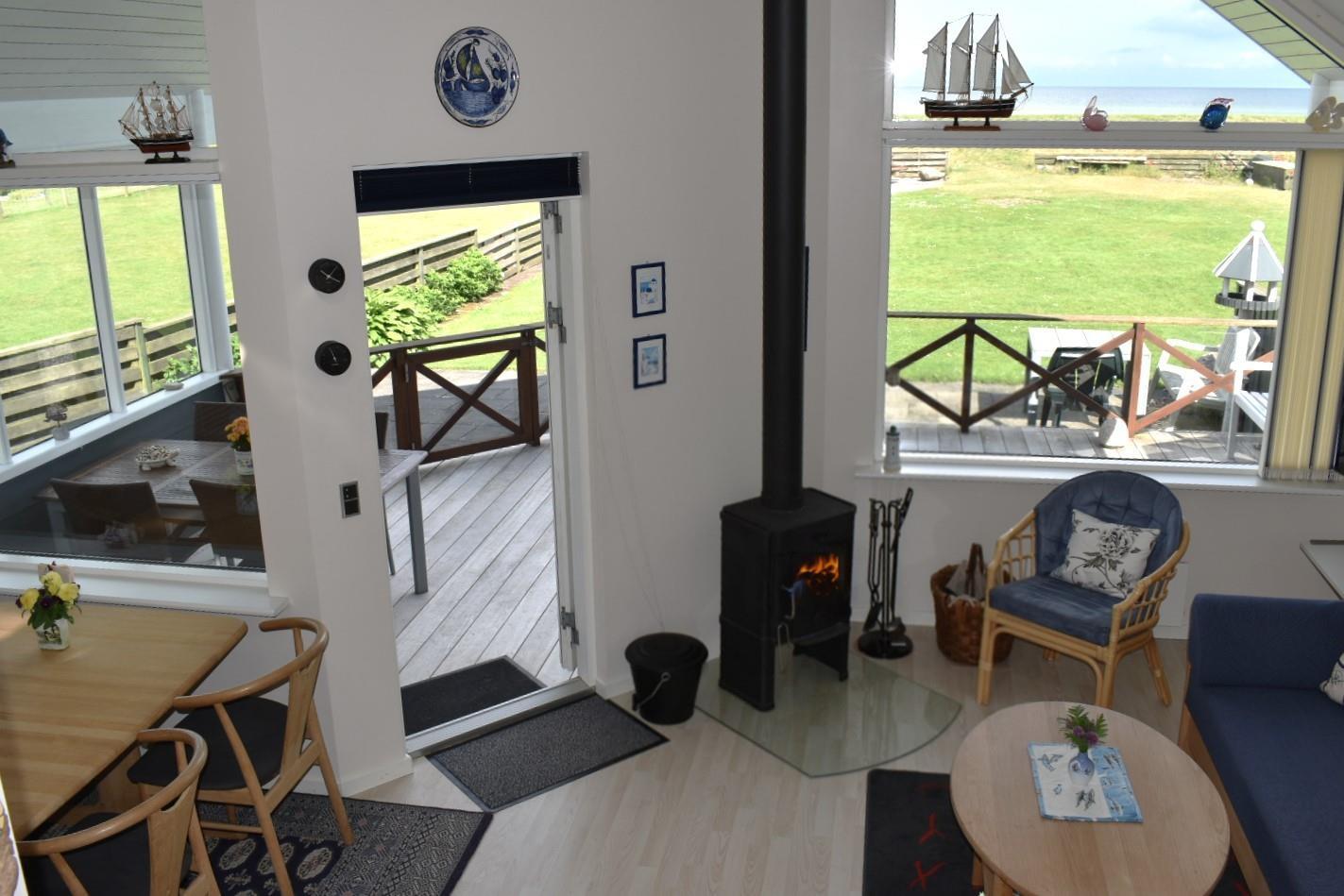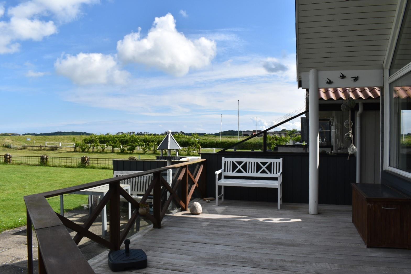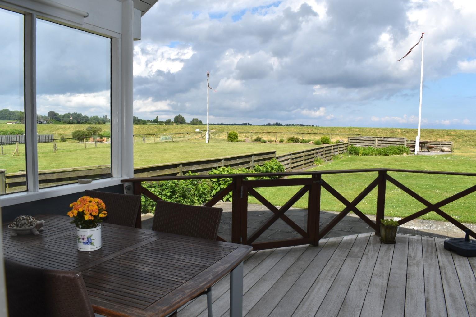 Vom Wohnzimmer aus geht es auf eine teilweise überdachte und geschützte Terrasse mit traumhaftem Blick aufs Wasser – ideal, um das Abendessen oder ein Glas Wein zu genießen. Vor dem Haus gibt es eine abgeschlossene Terrasse, perfekt für den Morgenkaffee in der Sonne. Eine abgeschirmte Außendusche sorgt dafür, dass man den Sand nach einem Strandtag schnell loswird.