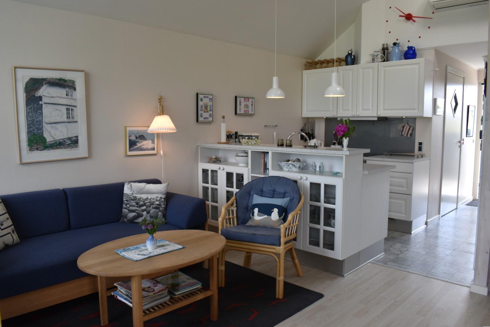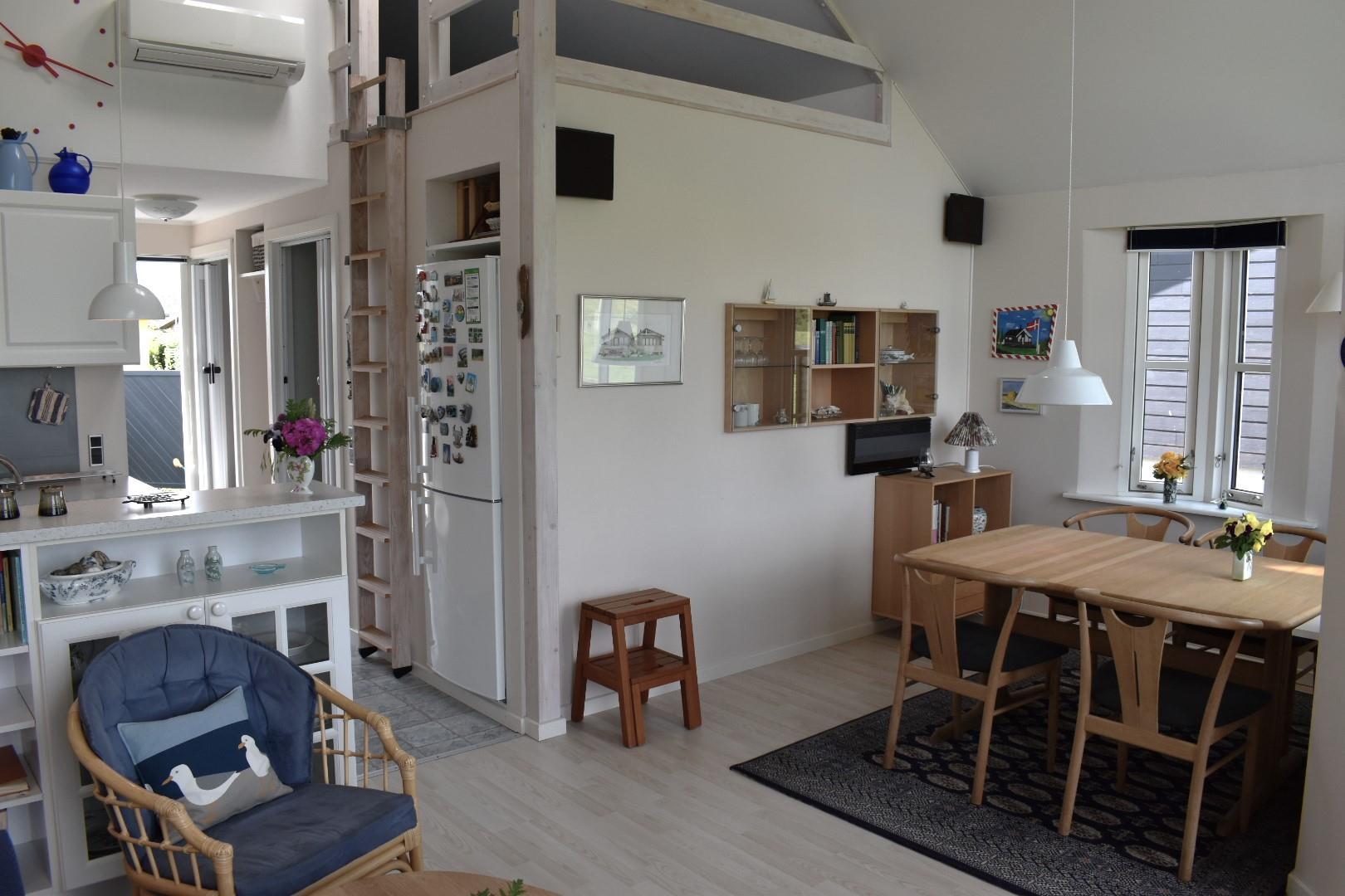 Das Haus ist hell und einladend, mit einem Wohnzimmer mit integrierter Küche. Es bietet Platz für bis zu vier Personen: ein Schlafzimmer mit Doppelbett (160 cm) und ein Zimmer mit zwei Etagenbetten – perfekt für Paare oder Familien. Das Badezimmer ist mit Fußbodenheizung ausgestattet, was für extra Komfort sorgt.
