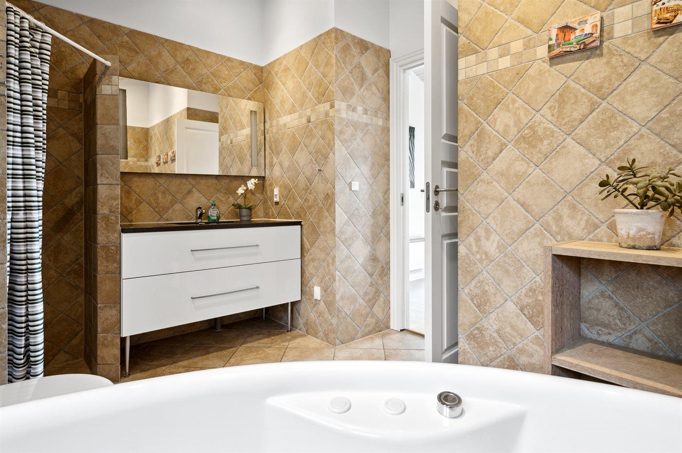 Es gibt 2 Badezimmer mit Duschnische und 2 Toiletten, davon 1 Gästetoilette. Fußbodenheizung in 1 Badezimmer. Fußbodenheizung in der Gästetoilette.