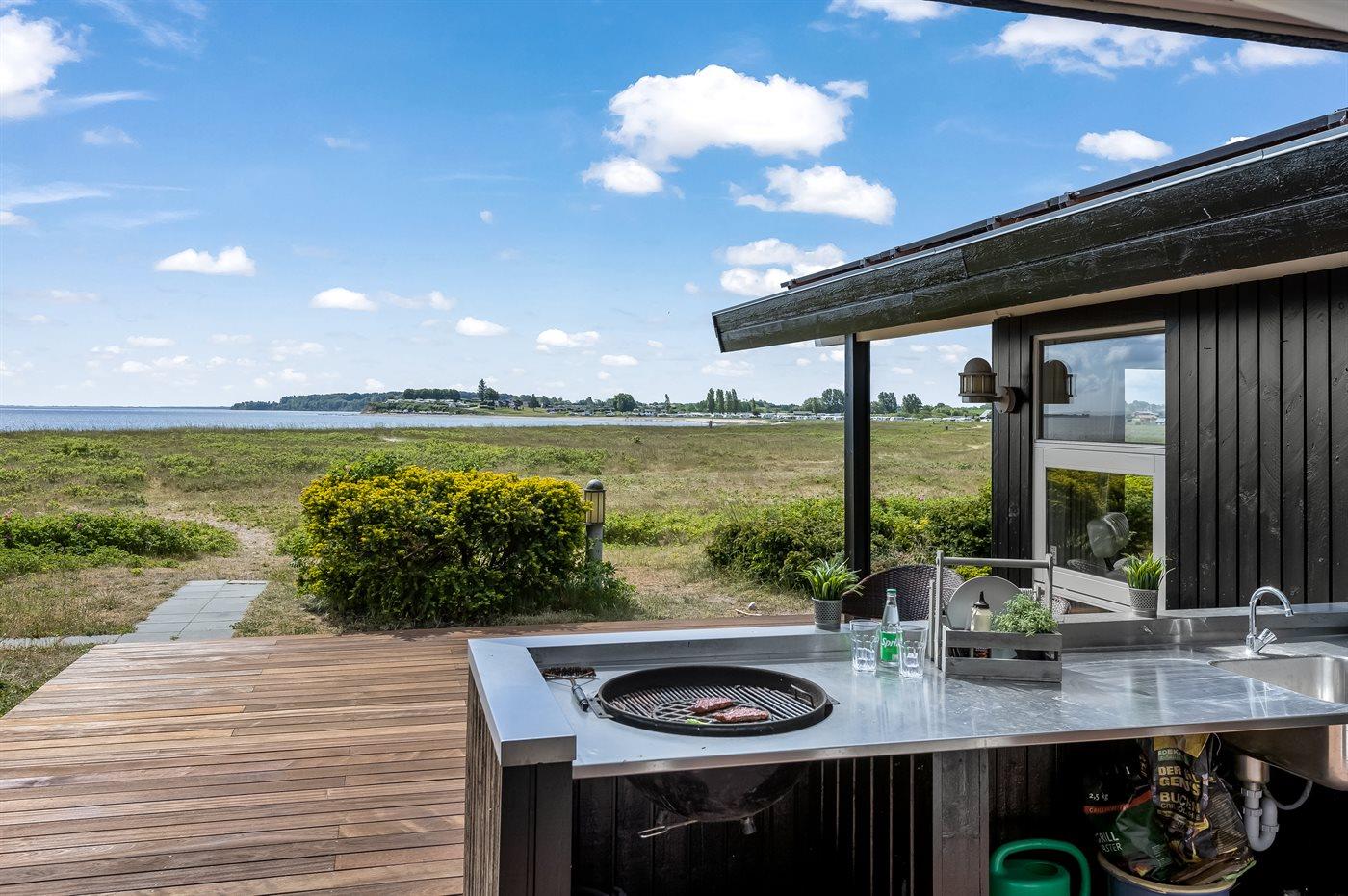 Rund um das Haus findet ihr viele kleine gemütliche Ecken, die zu Entspannung, Geselligkeit und ruhigen Momenten in der Sonne einladen. Hier könnt ihr das Abendessen auf dem Grill zubereiten und das praktische Außenküchenmodul nutzen, um das Kochen noch einfacher und geselliger zu gestalten. Wenn der Tag zur Neige geht, könnt ihr in den Außen-Whirlpool steigen, in dem bis zu sechs Personen gleichzeitig sitzen und den Blick aufs Wasser genießen können – und wenn die Dunkelheit hereinbricht, den Sternenhimmel bestaunen.