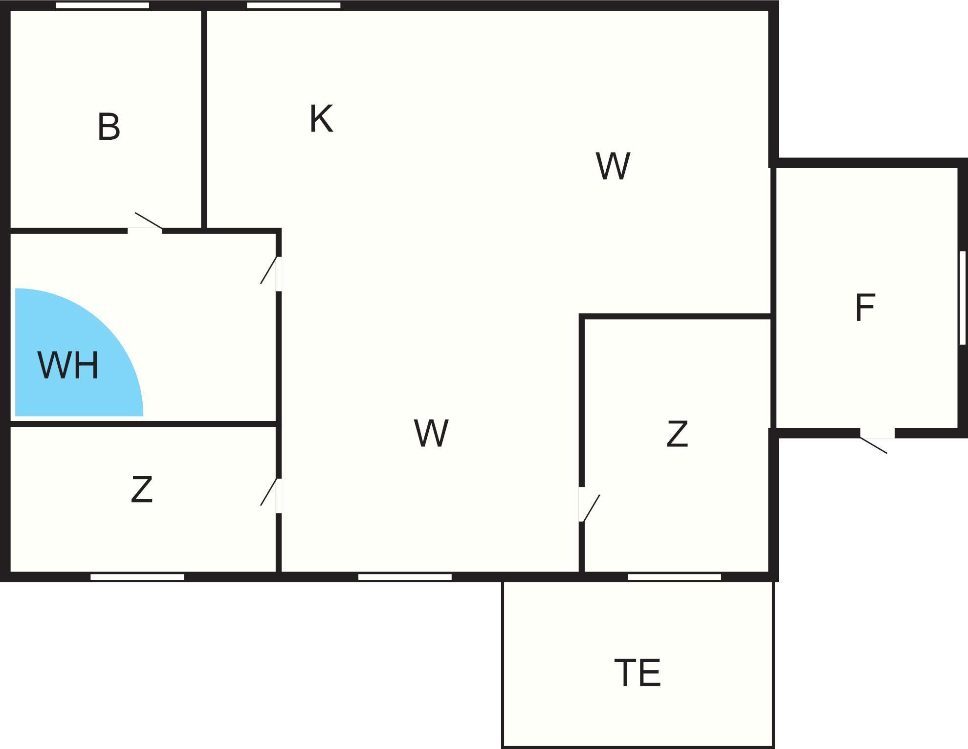 Offene Wohnküche mit Essbereich, Sofa, Fernseher und Billardtisch. Vom Wohnbereich aus hat man Zugang zu beiden Schlafzimmern; eines davon mit einem Doppelbett (kann zu zwei Einzelbetten auseinander geschoben werden), das andere mit zwei Einzelbetten. Vom Wohnzimmer und einem Schlafzimmer gibt es Zugang zu einer Orangerie mit verschiedenen Pflanzen an der Südseite des Gebäudes. Im Eingangsbereich steht zudem ein Etagenbett mit zwei Schlafplätzen für Kinder, wenn diese Bettdecken und Kissen mitbringen.