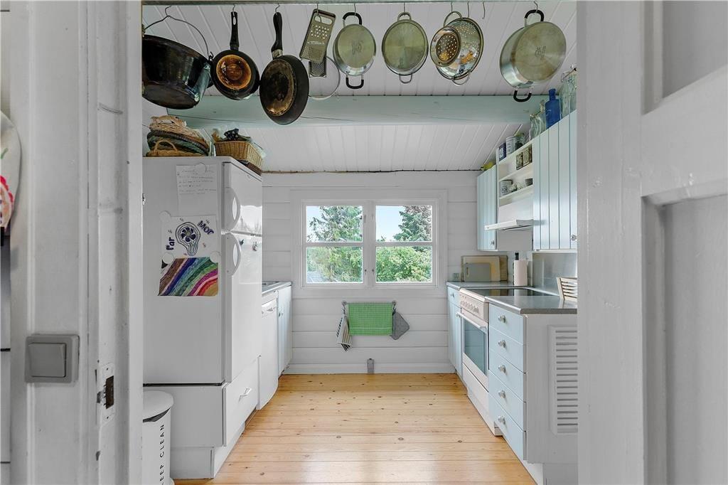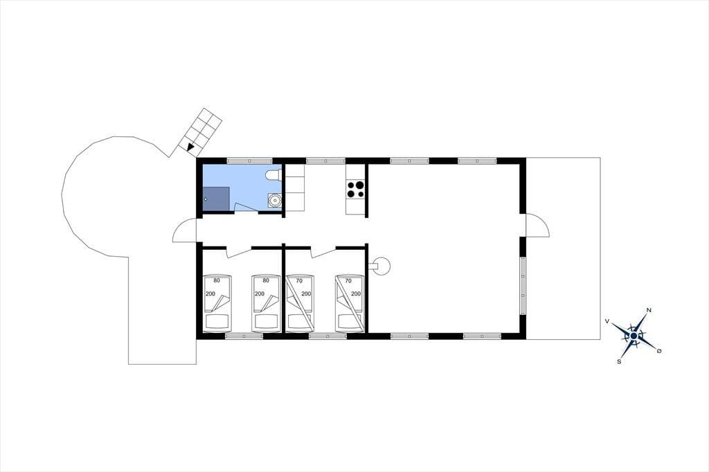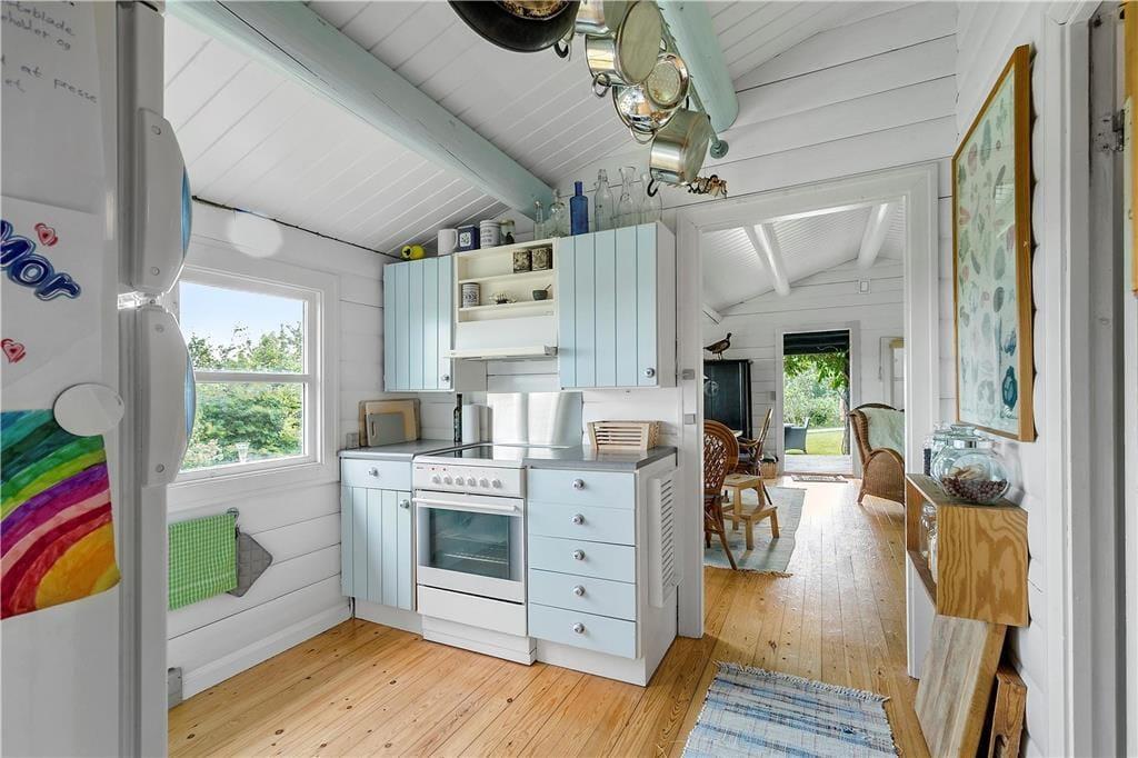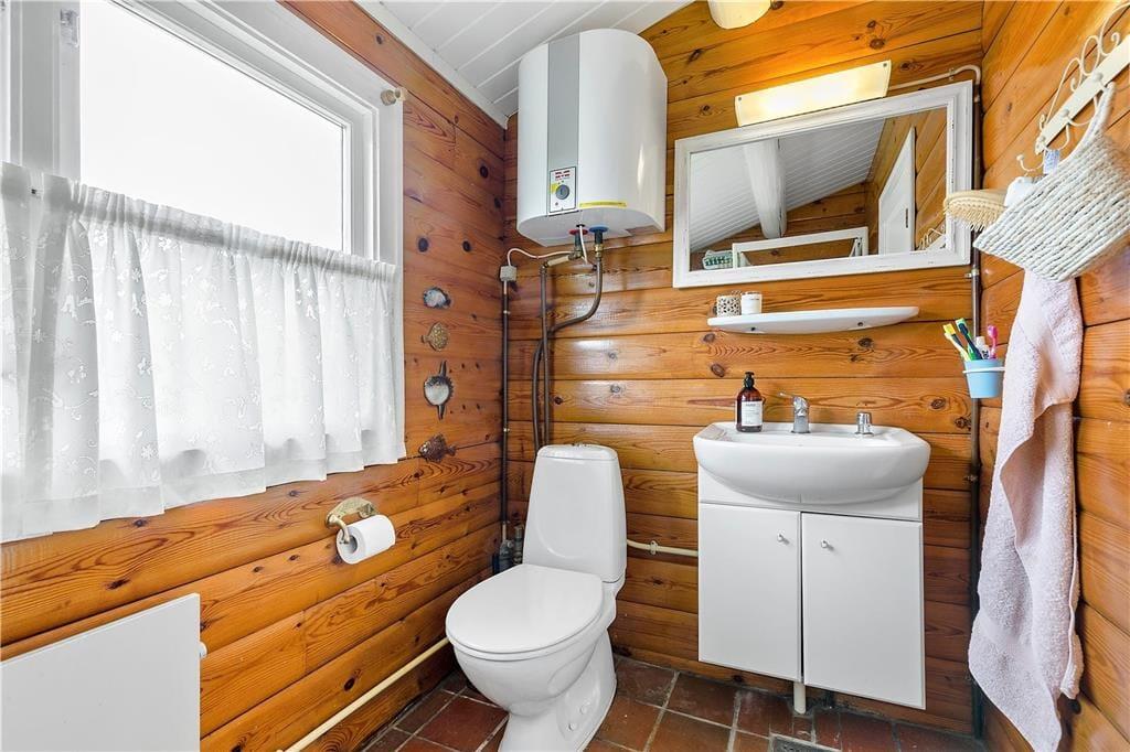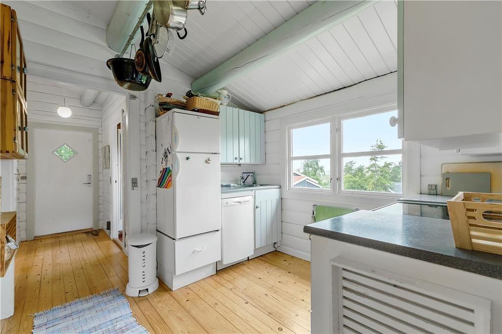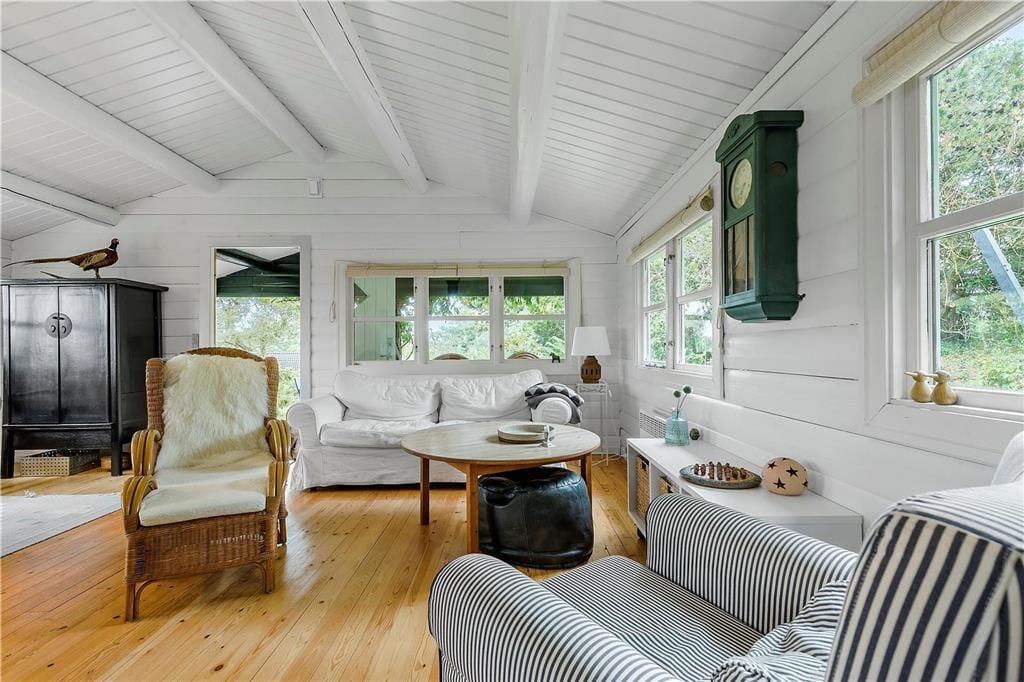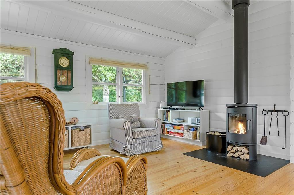 Nicht weit abseits des Wassers erwartet Sie dieses ältere, aber ausgesprochen reizende und gemütliche Ferienhaus. Das Haus beinhaltet einen hellen Wohnraum mit einer gemütlichen Möblierung und einem Kaminofen. Die kleine aber funktionelle Küche ist unter anderem mit einem Geschirrspüler ausgestattet. Die Schlafplätze verteilen sich auf einen Schlafraum mit zwei Etagenbetten und einen Schlafraum mit zwei Einzelbetten. Alternativ zu den Etagenbetten können Sie auch das Sofa im Wohnraum als Schlafgelegenheit nutzen. Das gute Badezimmer beinhaltet eine Duschkabine. Für Unterhaltung und Abwechslung sorgen kostenloses WiFi und Apple-TV.