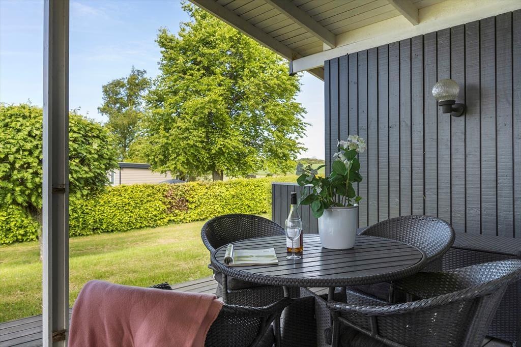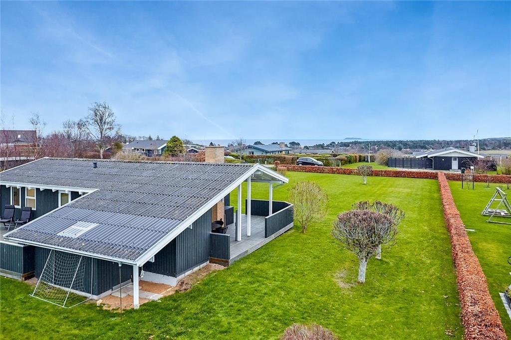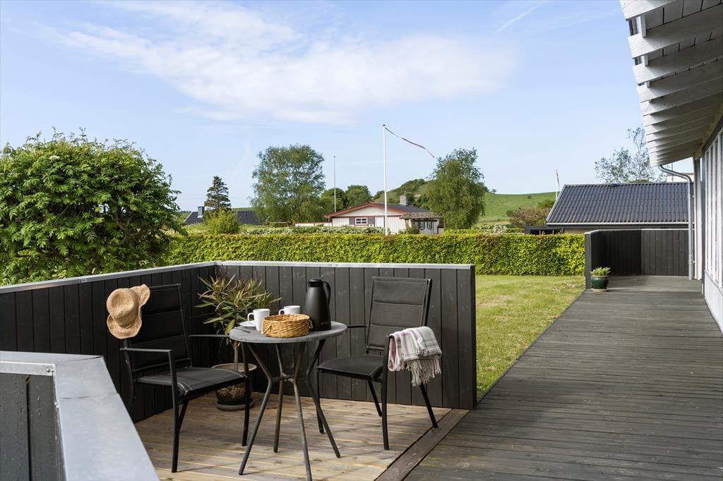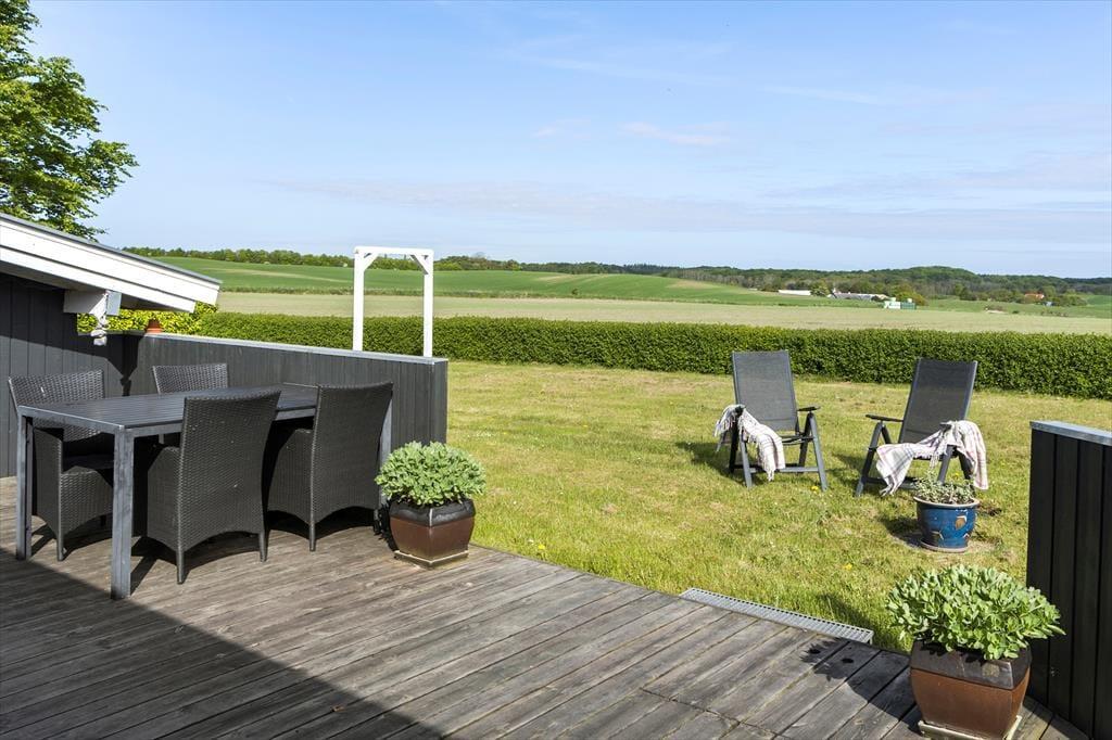 Dein großes, angenehm gepflegtes Ferienhausgrundstück besticht mit viel Platz. Die Rasenfläche animiert Groß und Klein zum gemeinsamen Spielen und Umhertollen. Deine jüngsten Kinder dürfen sich auf eine Sandkiste freuen. An dein Urlaubsdomizil schließen offene und geschlossene Terrassenbereiche. Die Gartenmöbel und der Grill laden zu stimmungsvollen Mahlzeiten in gemütlicher Runde ein, die von der Ruhe der umliegenden Natur geprägt sind. Die Terrasse bietet dir und deinen Lieben eine fantastische Aussicht über die Landschaft. Im Hintergrund siehst du sogar das Meer schimmern.