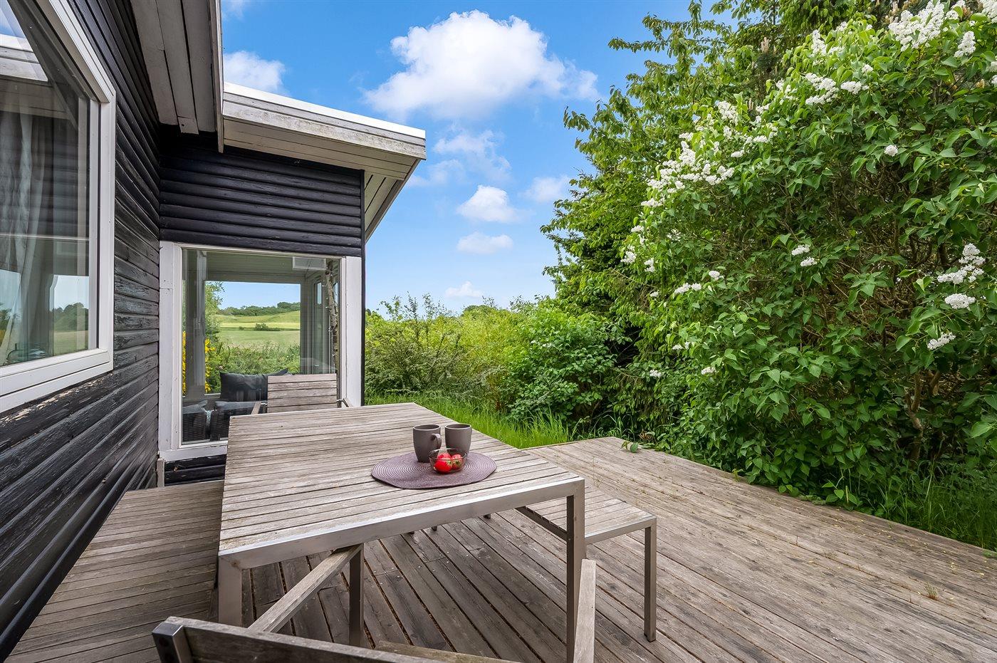 Das Haus verfügt über ein schönes und gut angelegtes Naturgrundstück mit mehreren lauschigen Ecken sowie Spielecken für die jüngsten Feriengäste. Genieße die erste Tasse Kaffee des Tages auf der abgeschirmten Terrasse im Schatten des Feigenbaums, wo du auch an warmen Sommerabenden leckere Mahlzeiten einnehmen kannst, und beende den Tag mit Blick auf die Felder, während die Sonne untergeht.