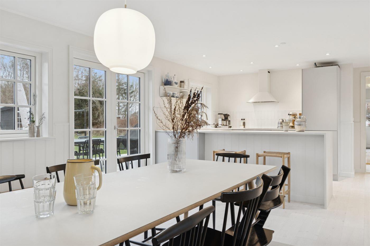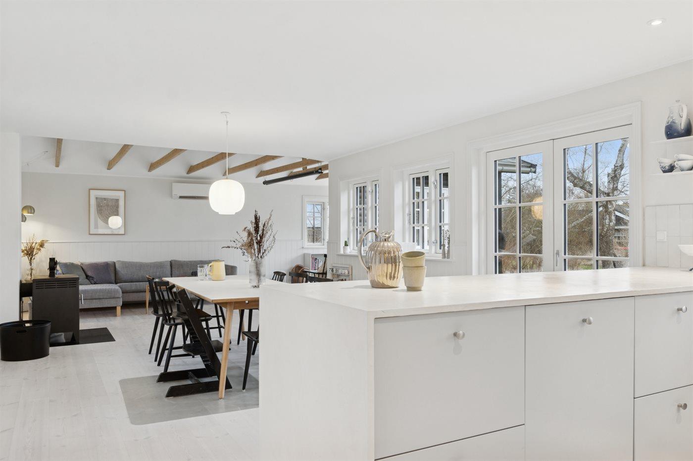 Das Haus wirkt hell und einladend mit einer gepflegten und modernisierten Einrichtung, in der Wohnzimmer und Küche harmonisch ineinander übergehen. Hier wurde auf die Details geachtet, und eine behutsame Modernisierung macht das Haus sowohl funktional als auch gemütlich und einladend, – ohne dass der ursprüngliche Ferienhaus-Charme verloren gegangen ist. Große Fenster lassen viel Licht herein und ermöglichen dir den Blick in den Garten.