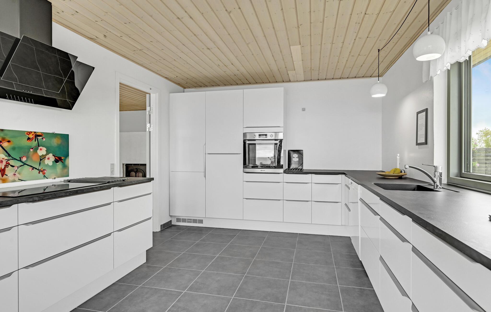 Freuen Sie sich auf einen herrlichen Urlaub in diesem einladenden Ferienhaus am Dråby Strand mit einer modernen, offenen Einrichtung und hellen Farben. Vom Wohnzimmer aus genießen Sie eine fantastische Aussicht durch die großen Fenster. Auch in der gut ausgestatteten Küche können Sie beim Kochen den Blick über die Wellen schweifen lassen. Am Abend lädt die gemütliche Sofaecke dazu ein, die Füße hochzulegen und einen Film zu schauen, während das Feuer im Kaminofen knistert.