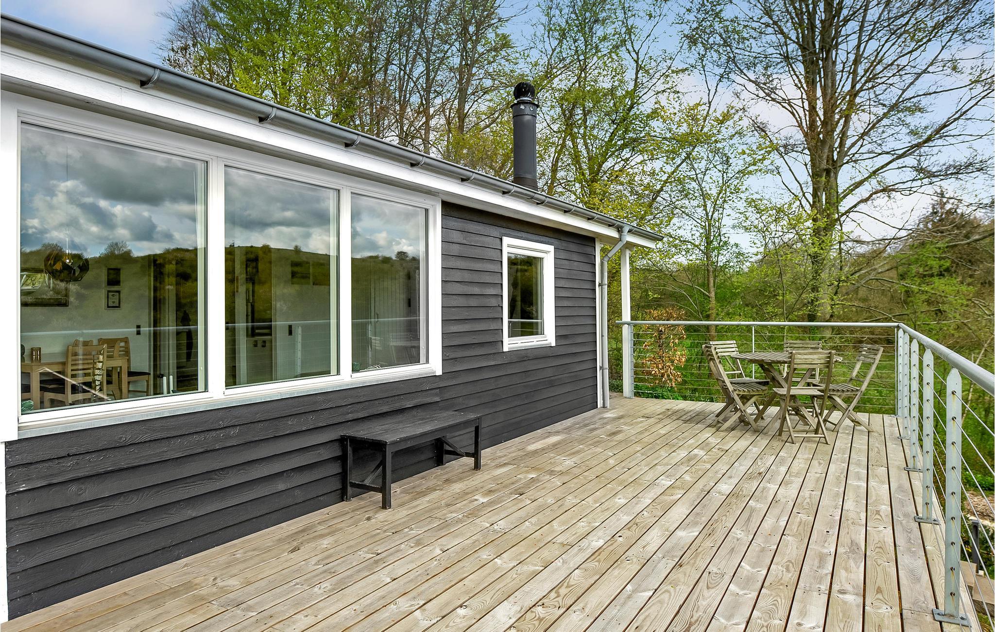 Von der großen Terrasse bietet sich Ihnen ein schöner Blick auf die Landschaft. Entspannen Sie hier bei einem leckeren Abendessen, genießen Sie die Sonne oder erfrischen Sie sich eine Runde im finnischen Holzbad. Für extra Komfort ist die Terrasse mit Sonnenliegen, Gartenmöbeln und Grill ausgestattet.