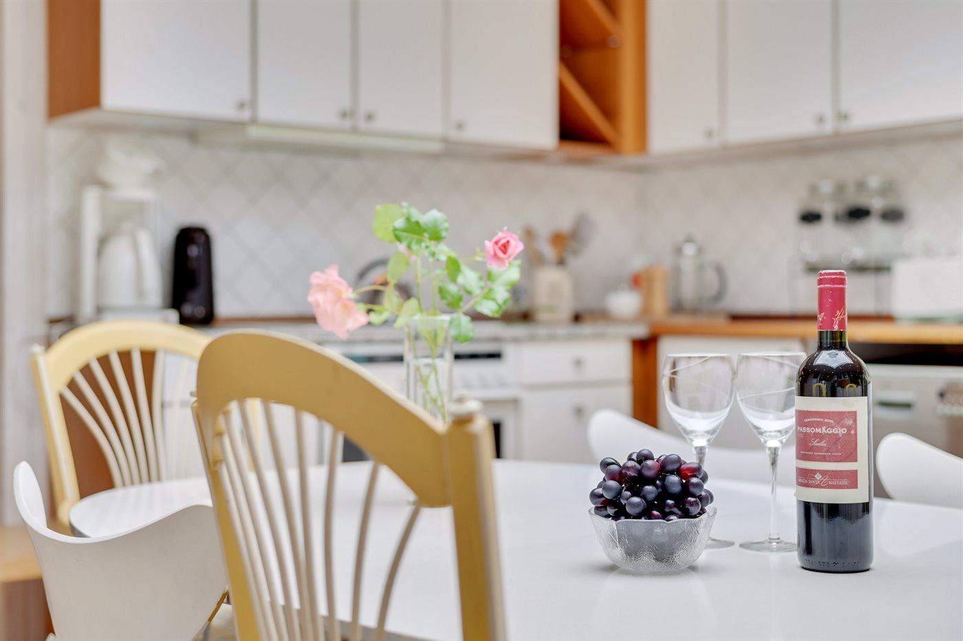 Die Küche ist mit Kühlschrank ausgestattet. Außerdem gibt es 4 Keramik-Kochfelder, Umluftofen, Mikrowelle sowie Geschirrspüler.