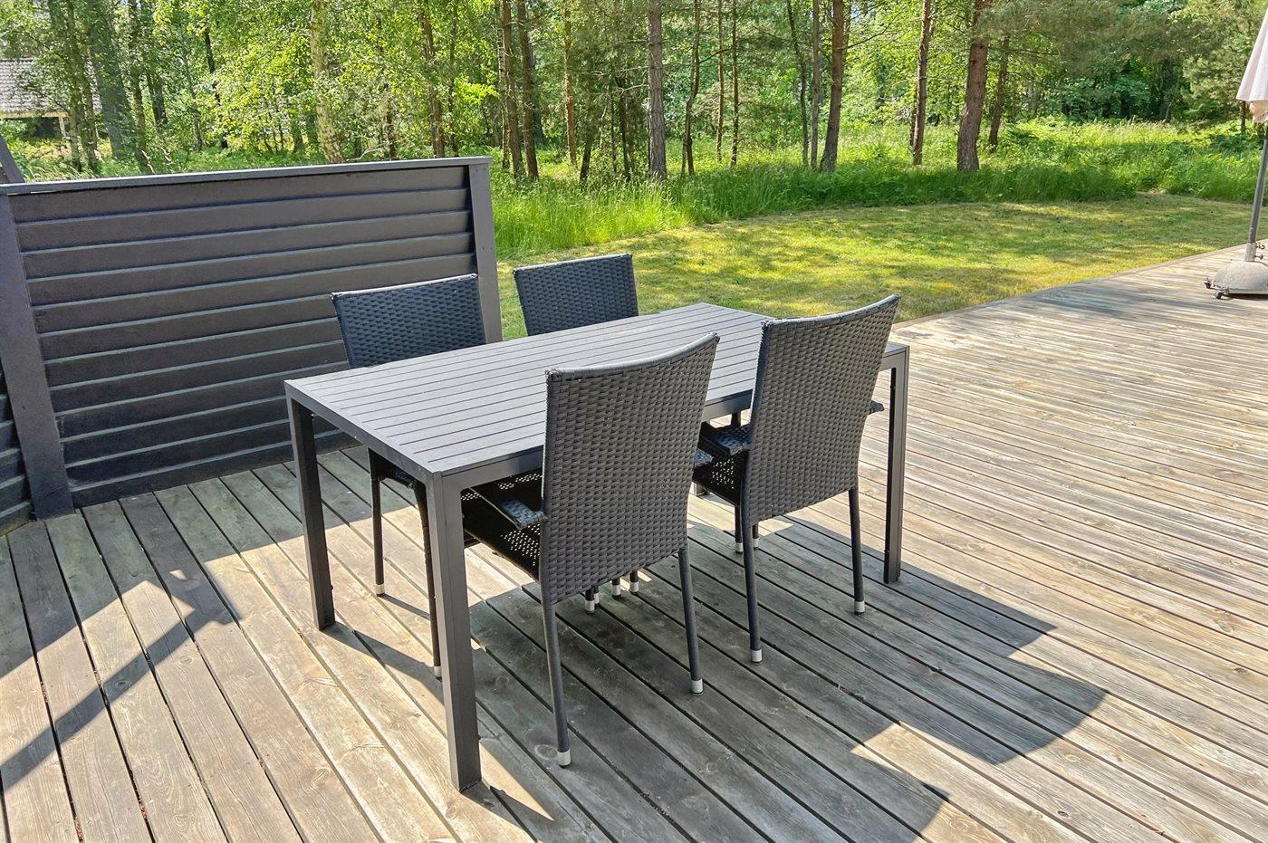 Das Haus liegt völlig ungestört am Ende einer Sackgasse in ruhiger Umgebung – nur 500 Meter vom Meer entfernt. Vor dem Haus befindet sich eine sehr große, teilweise abgeschirmte Terrasse mit Gartenmöbeln und Sonnenliegen – ideal zum Sonnenbaden oder für gemütliche Mahlzeiten im Freien.