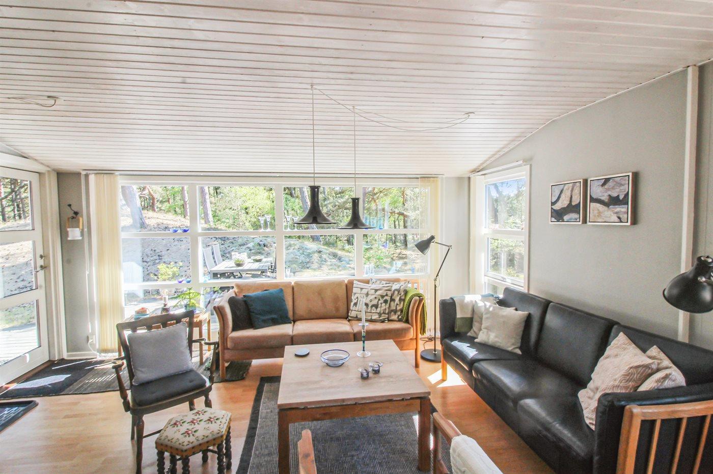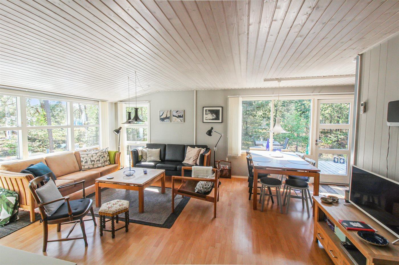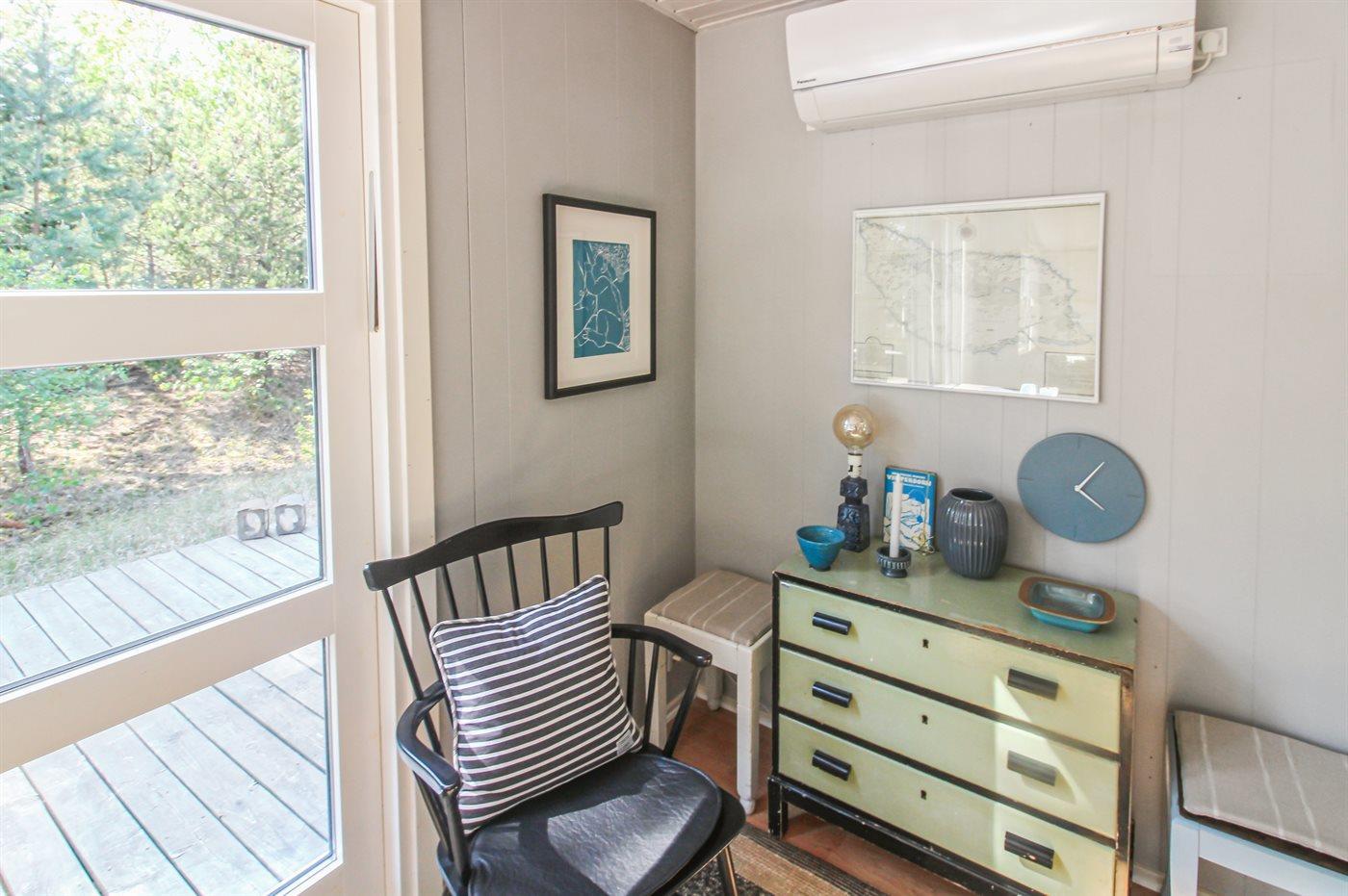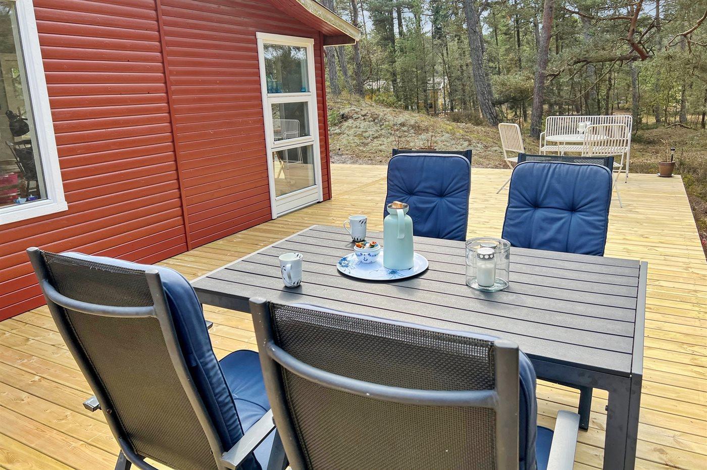 Dieses gepflegte und gemütlich eingerichtete Ferienhaus liegt in ruhiger Umgebung auf einem großen und leicht hügeligen Naturgrundstück mit Kiefern und Heidebewachsung - dicht am Sandstrand von Dueodde. Innen gibt es helle Holzböden, jedoch Klinkerboden im Badezimmer.