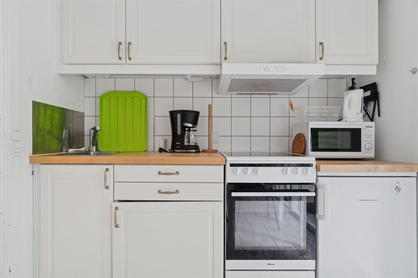Die Küche ist mit Kühlschrank ausgestattet. Außerdem gibt es 4 Keramik-Kochfelder, Umluftofen.