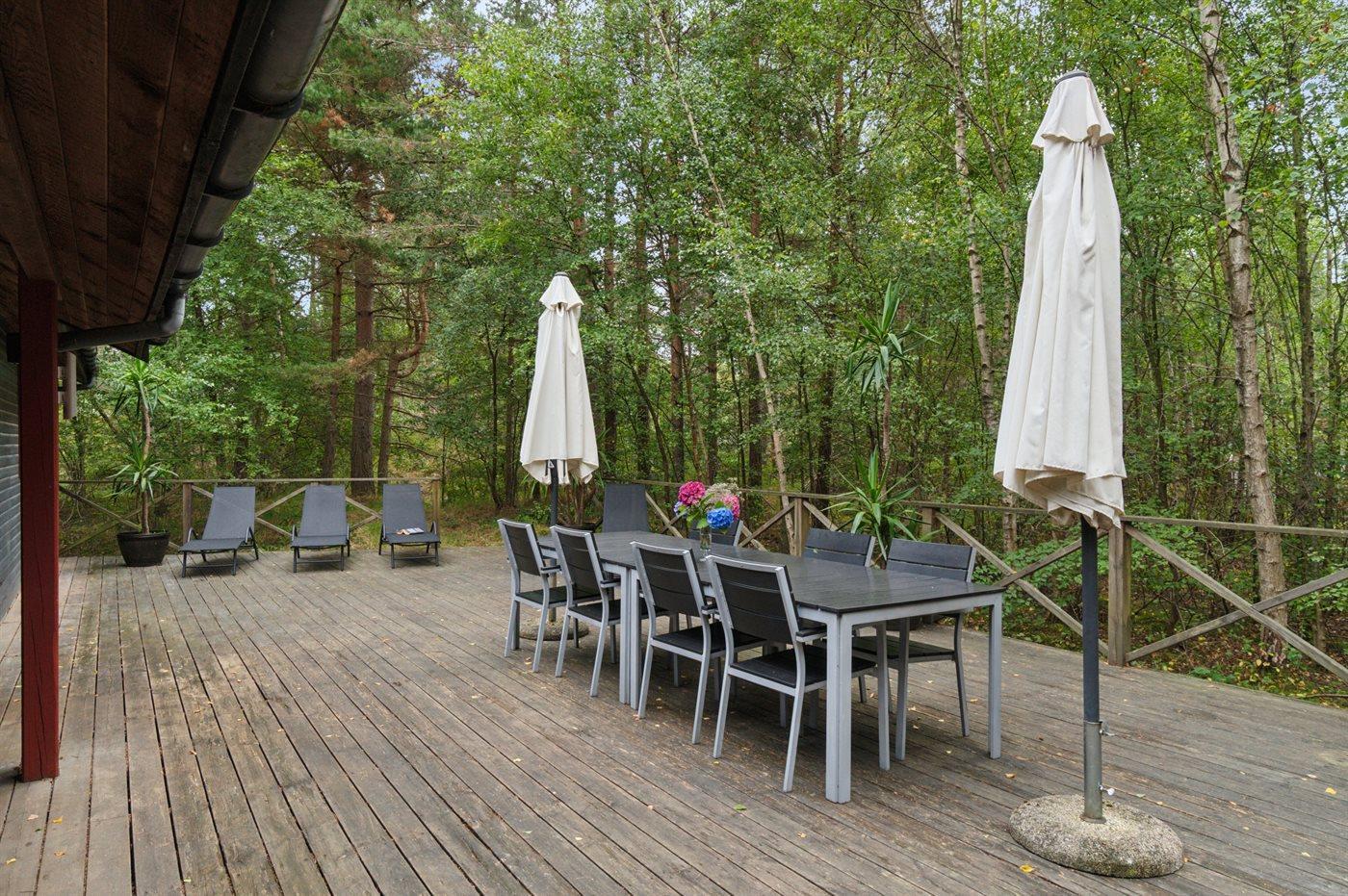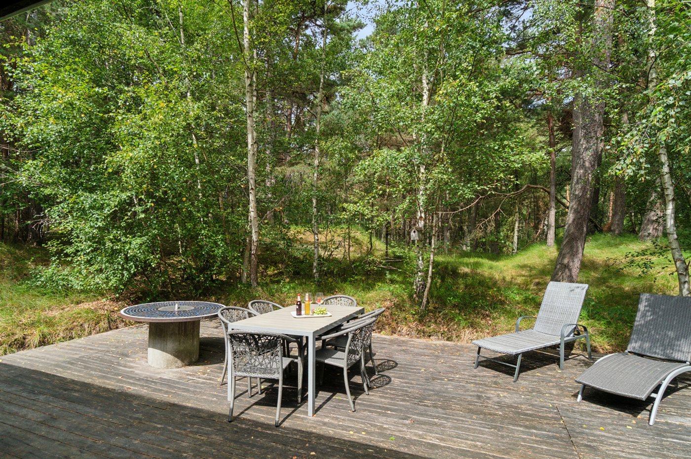 Dieses blau gestrichene Ferienhaus, das von großen Holzterrassen umgeben ist, liegt nur 300 Meter vom lebhaften Zentrum Dueoddes entfernt. Das Haus liegt ungestört auf einem sehr großen und schönen Naturgrundstück mit Kiefern und Birken - zusammen mit zwei Nachbarhäusern.