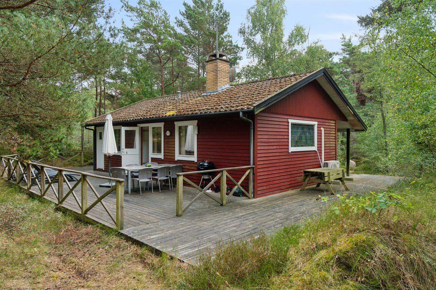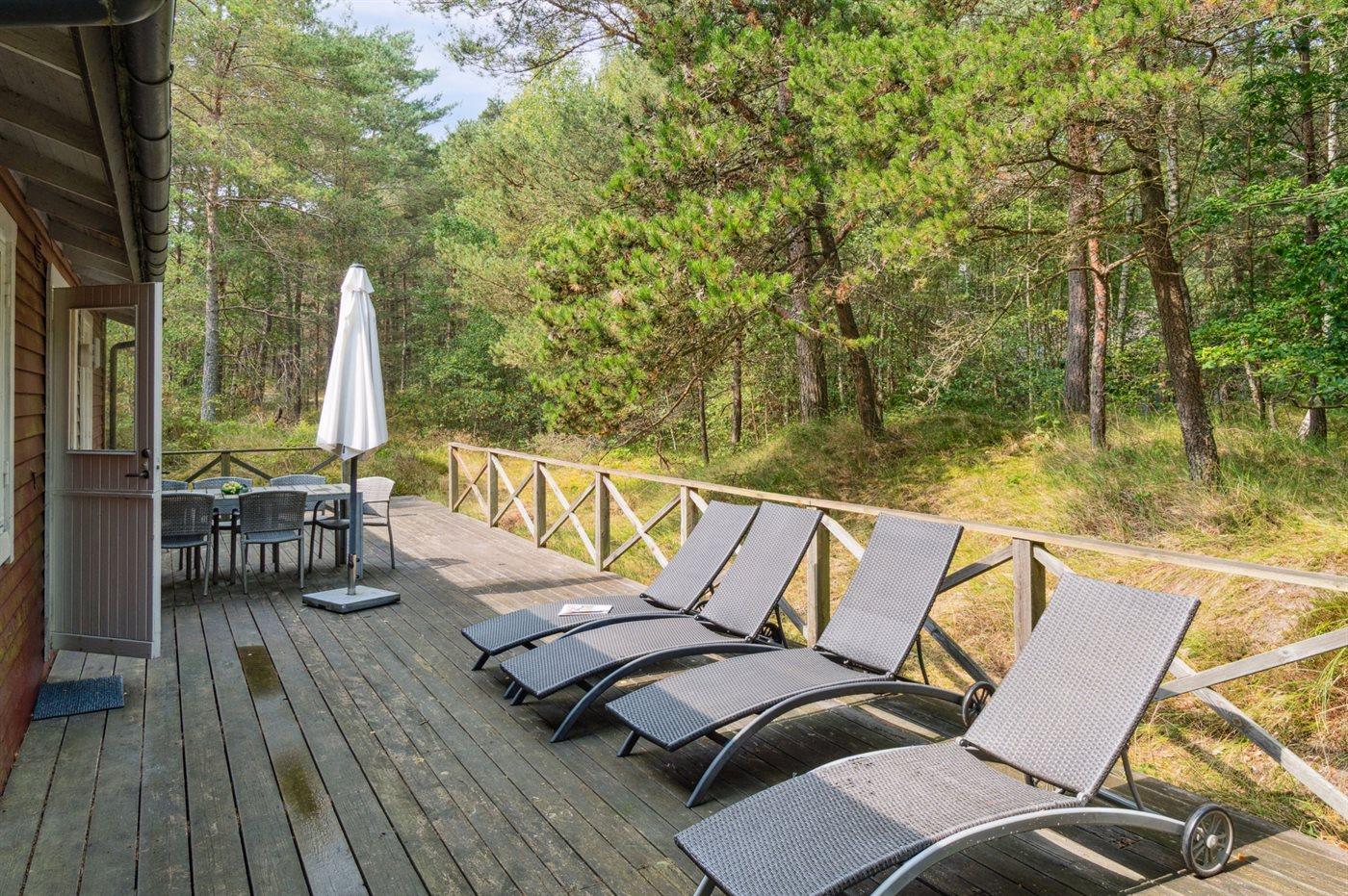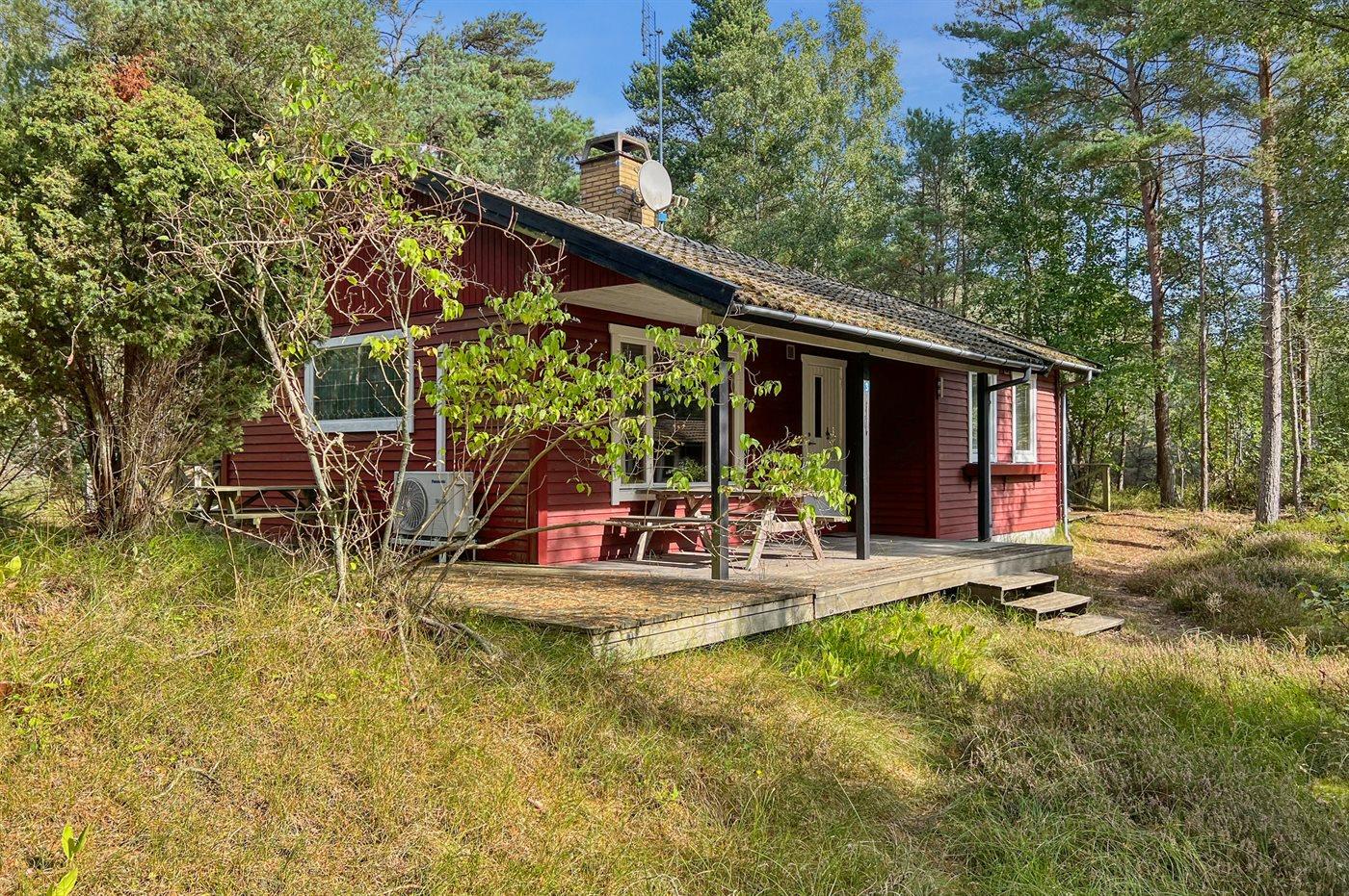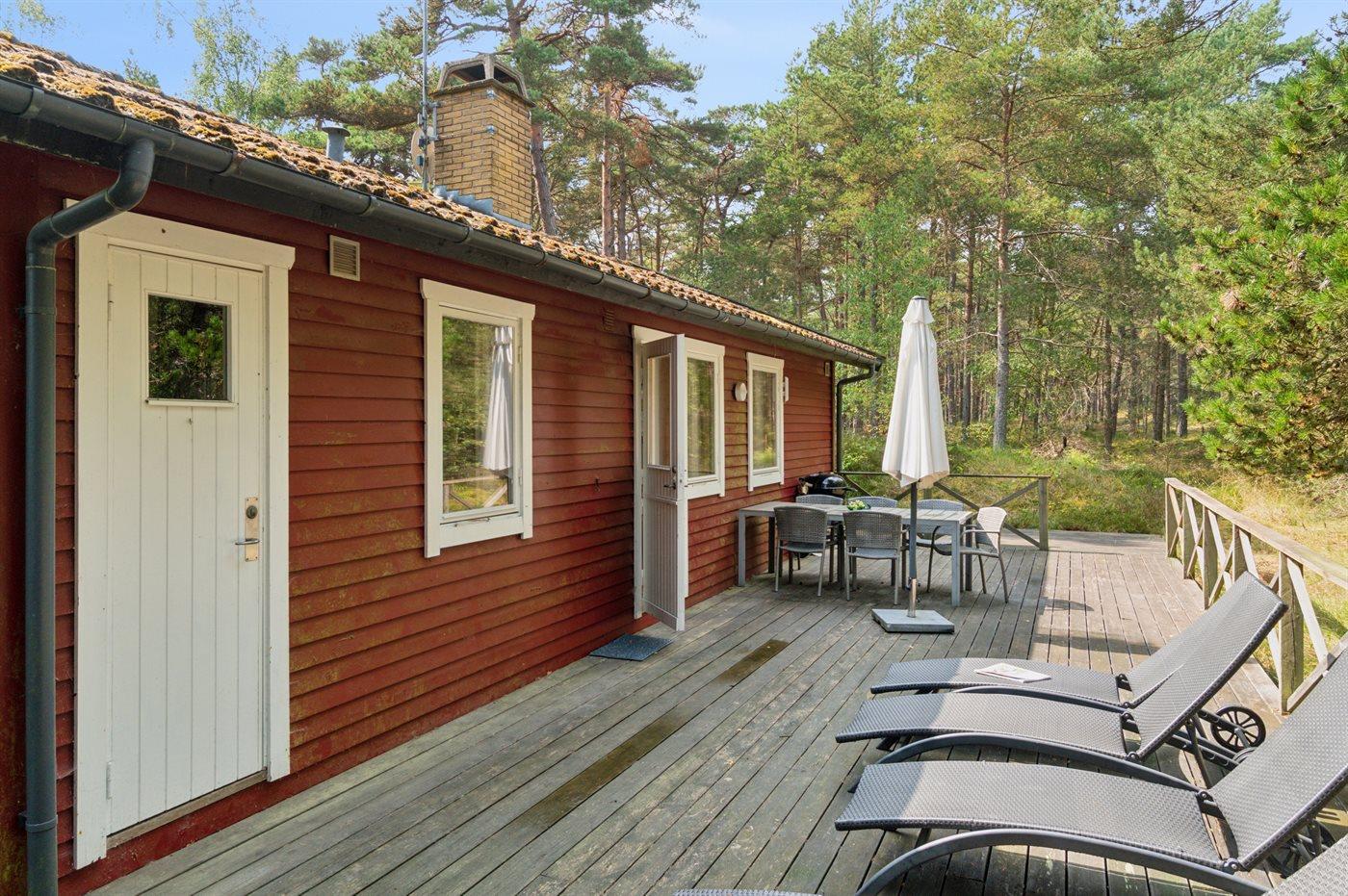 Dieses rot gestrichene Ferienhaus ist von Holzterrassen umgeben, und bietet dir daher die Moglichkeit die Sonne sowohl morgens als auch abends in Ruhe zu genießen. Du findest das Haus im Herzen von Dueodde - auf einem großen und schönen, von Bäumen bewachsenen Naturgrundstück zusammen mit 2 anderen Häusern.