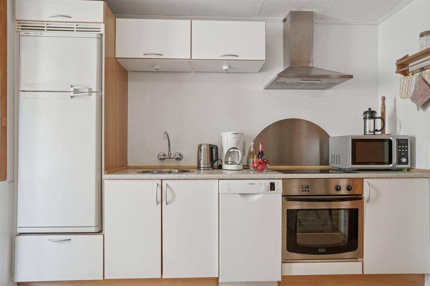 Die Küche ist mit Kühlschrank ausgestattet. Außerdem gibt es 4 Keramik-Kochfelder, Umluftofen, Mikrowelle sowie Geschirrspüler.