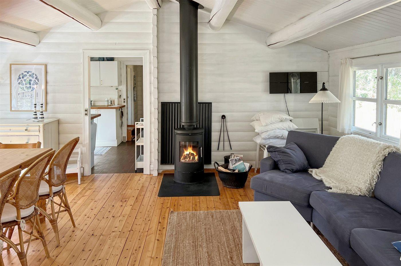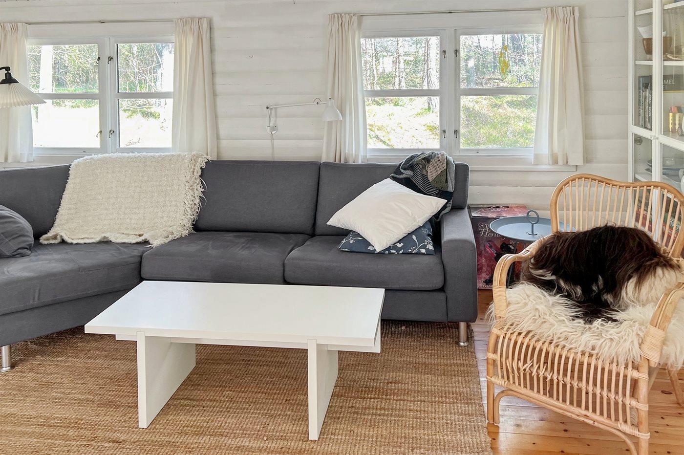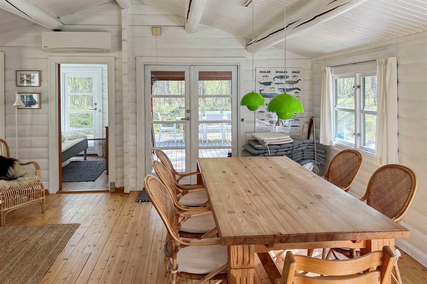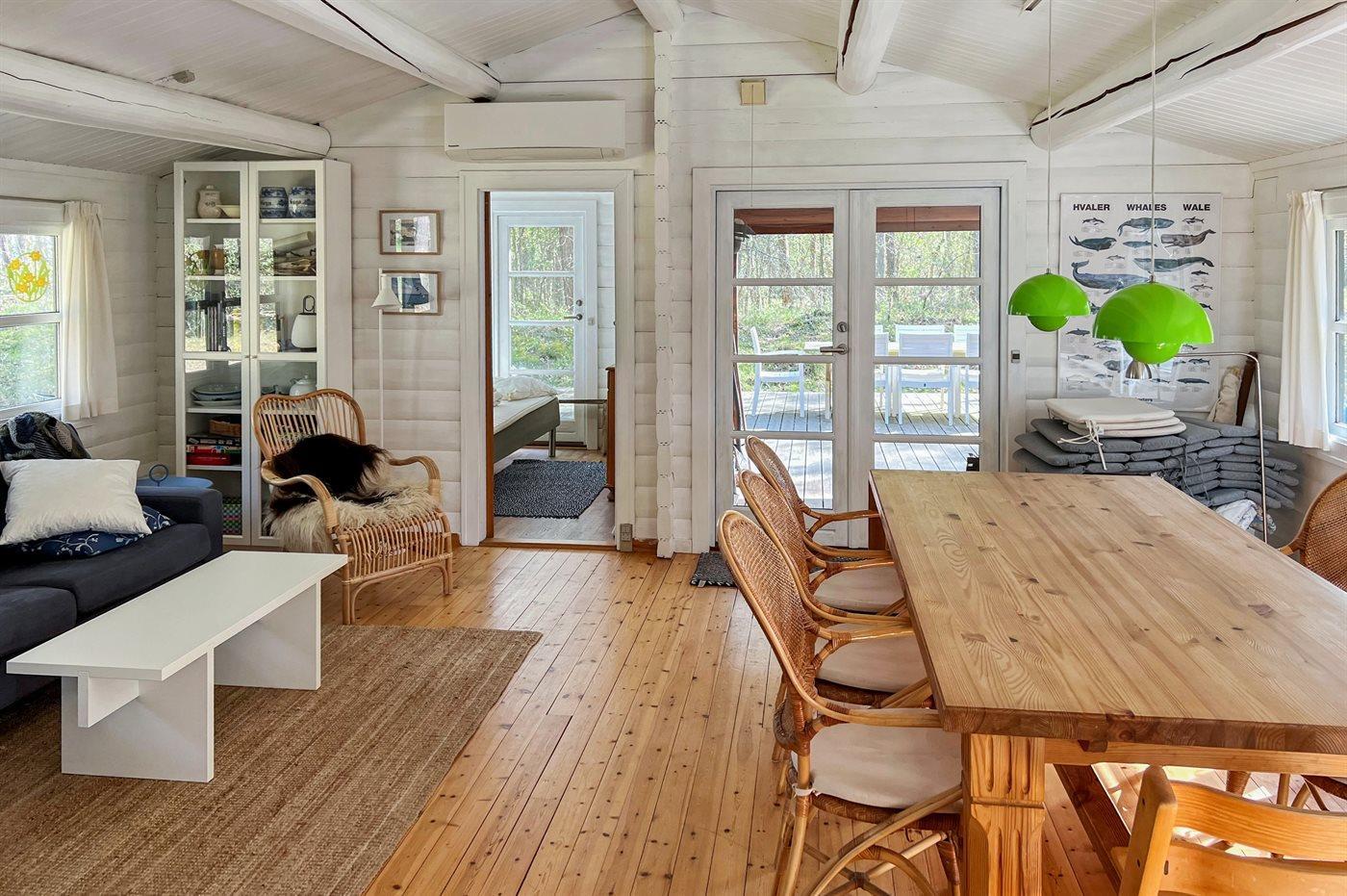 Das Dach ist mit Gras bewachsen, und das Haus liegt auf einem Naturgrundstück. Innen erwartet dich eine helle Einrichtung mit weiß gestrichenen Holzwänden und -decken. Die hellen Holzdielenböden vermitteln ein zeitloses und solides Gefühl – ganz typisch für ein Blockhaus dieser Art, in dem die Nähe zur Natur im Mittelpunkt steht.