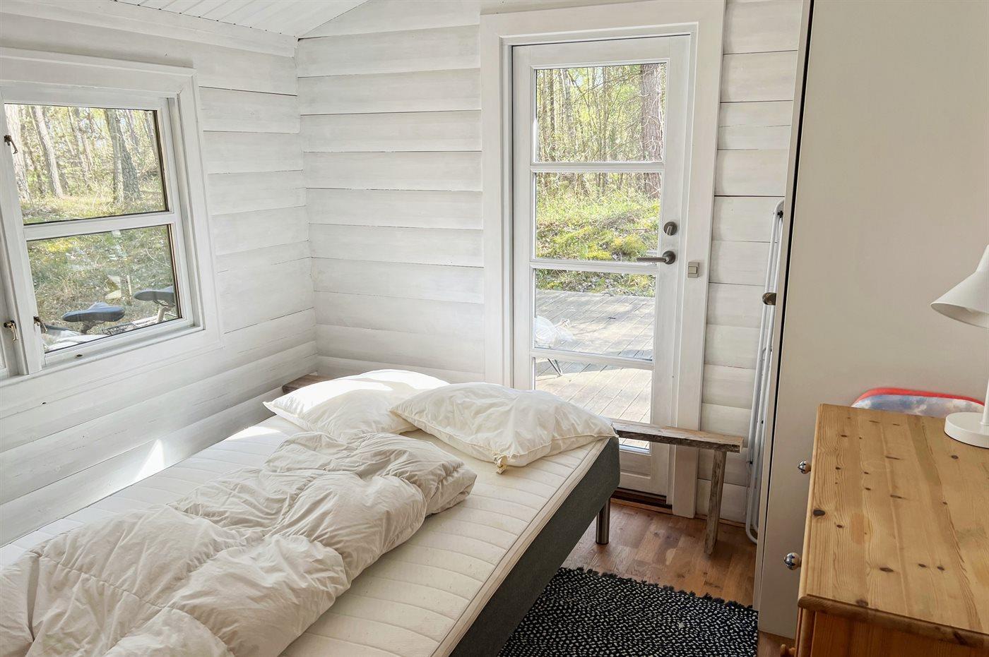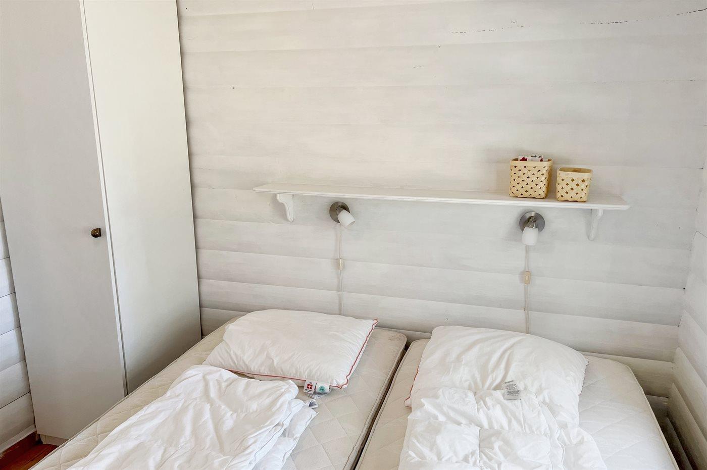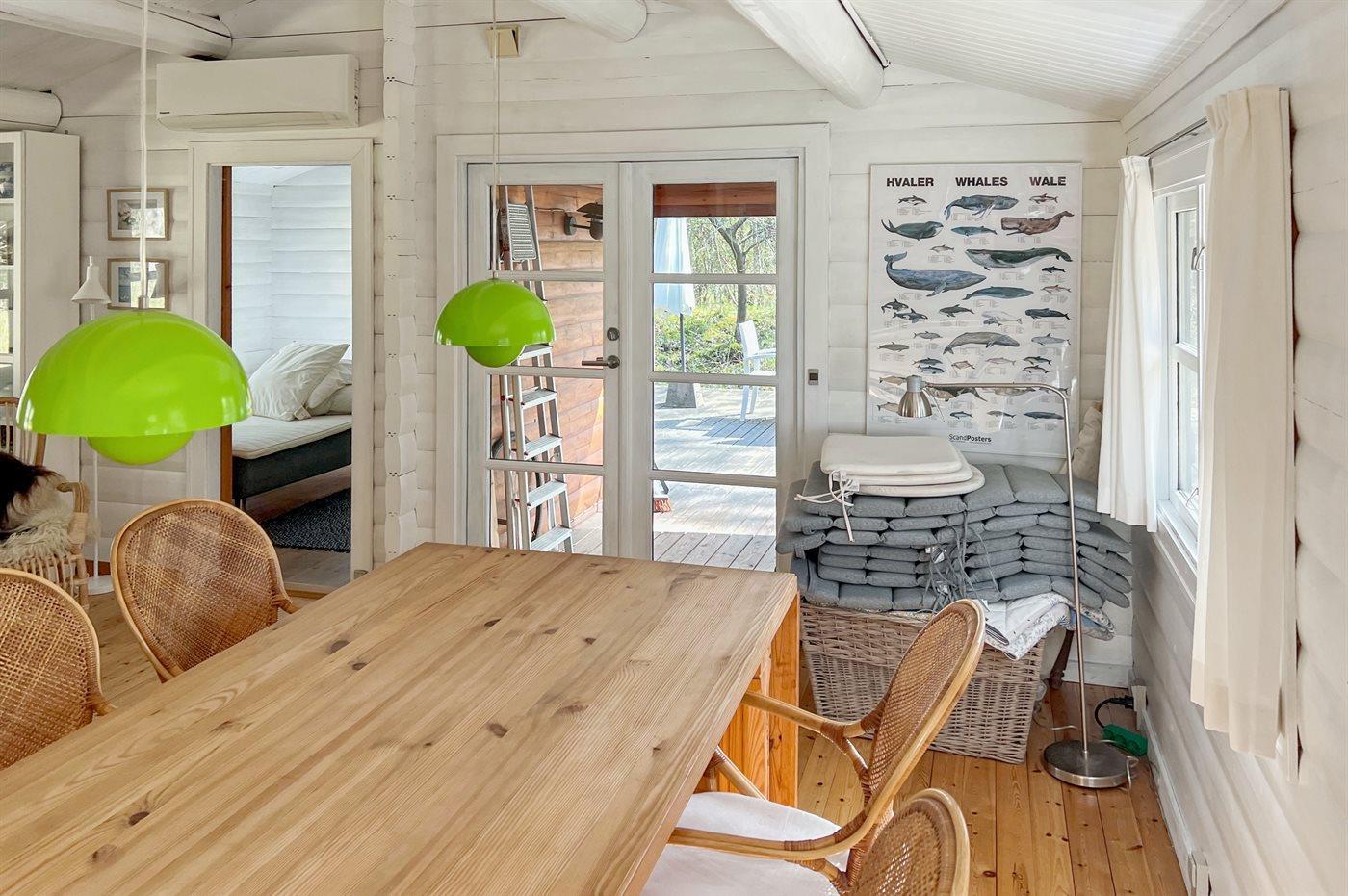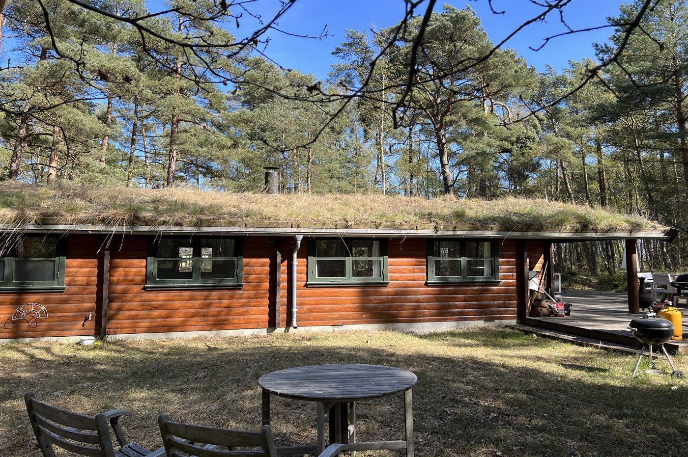 Das Dach ist mit Gras bewachsen, und das Haus liegt auf einem Naturgrundstück. Innen erwartet dich eine helle Einrichtung mit weiß gestrichenen Holzwänden und -decken. Die hellen Holzdielenböden vermitteln ein zeitloses und solides Gefühl – ganz typisch für ein Blockhaus dieser Art, in dem die Nähe zur Natur im Mittelpunkt steht.