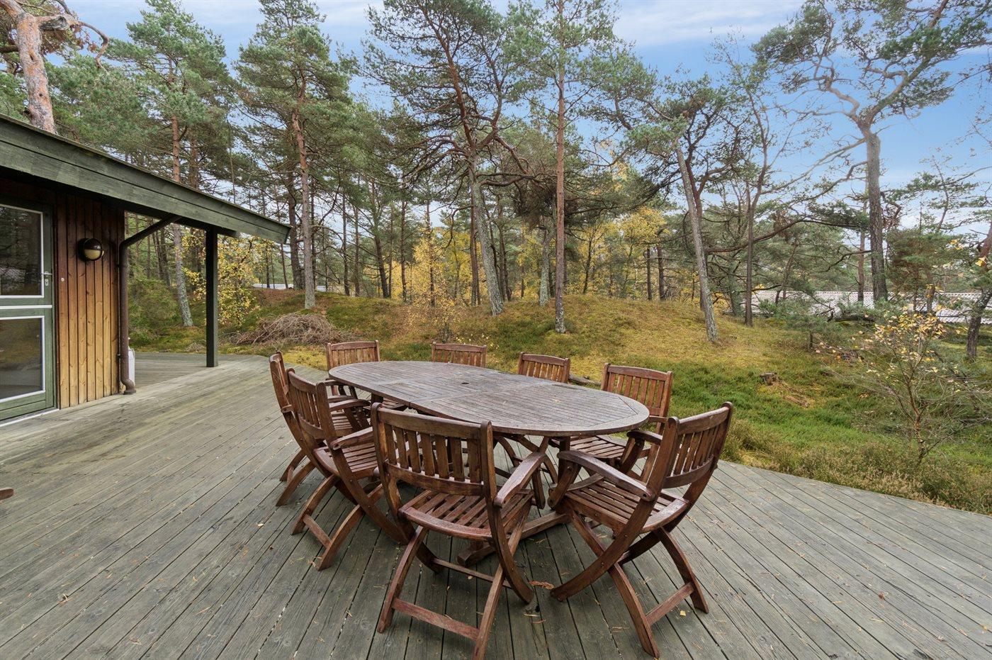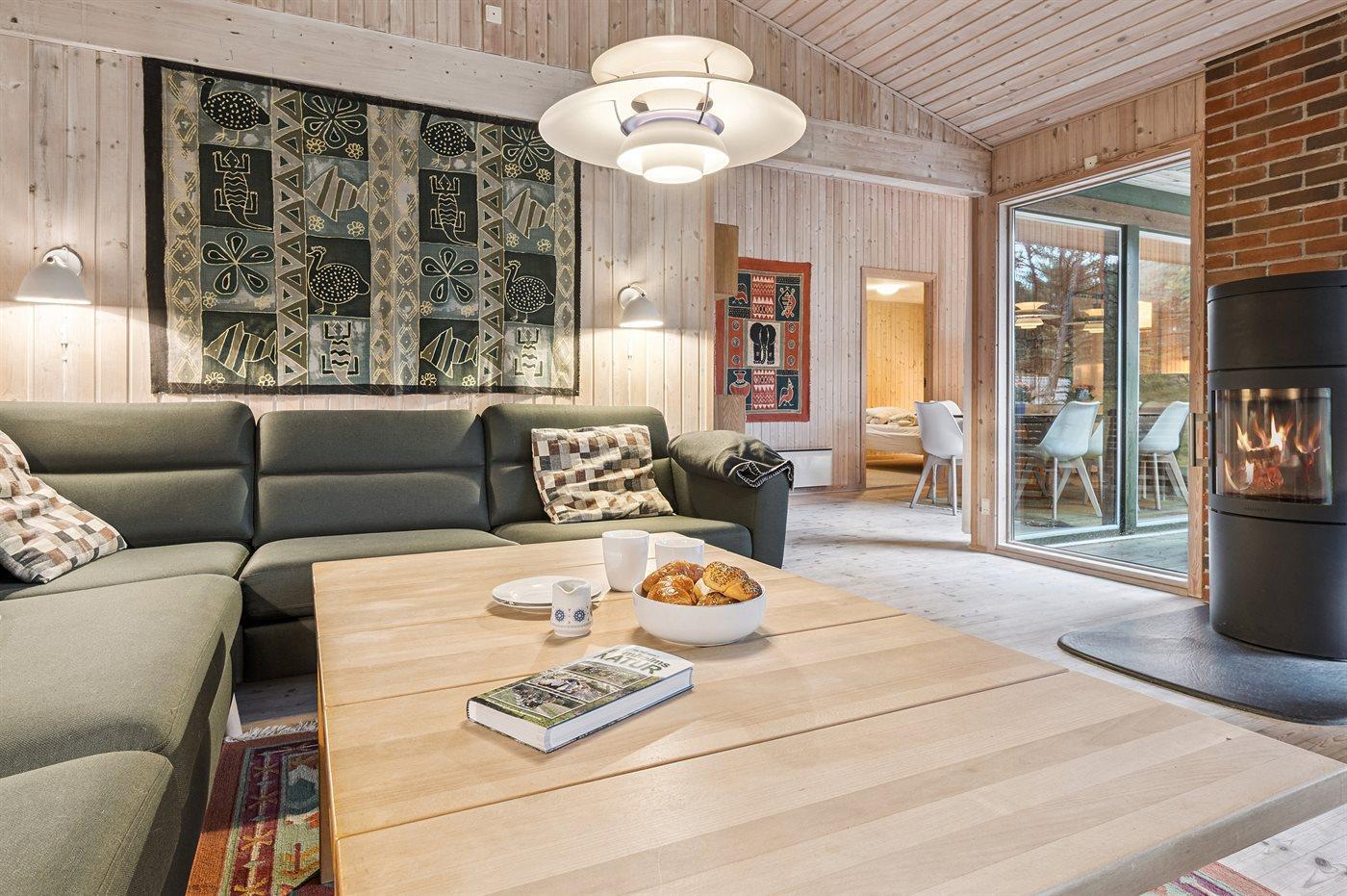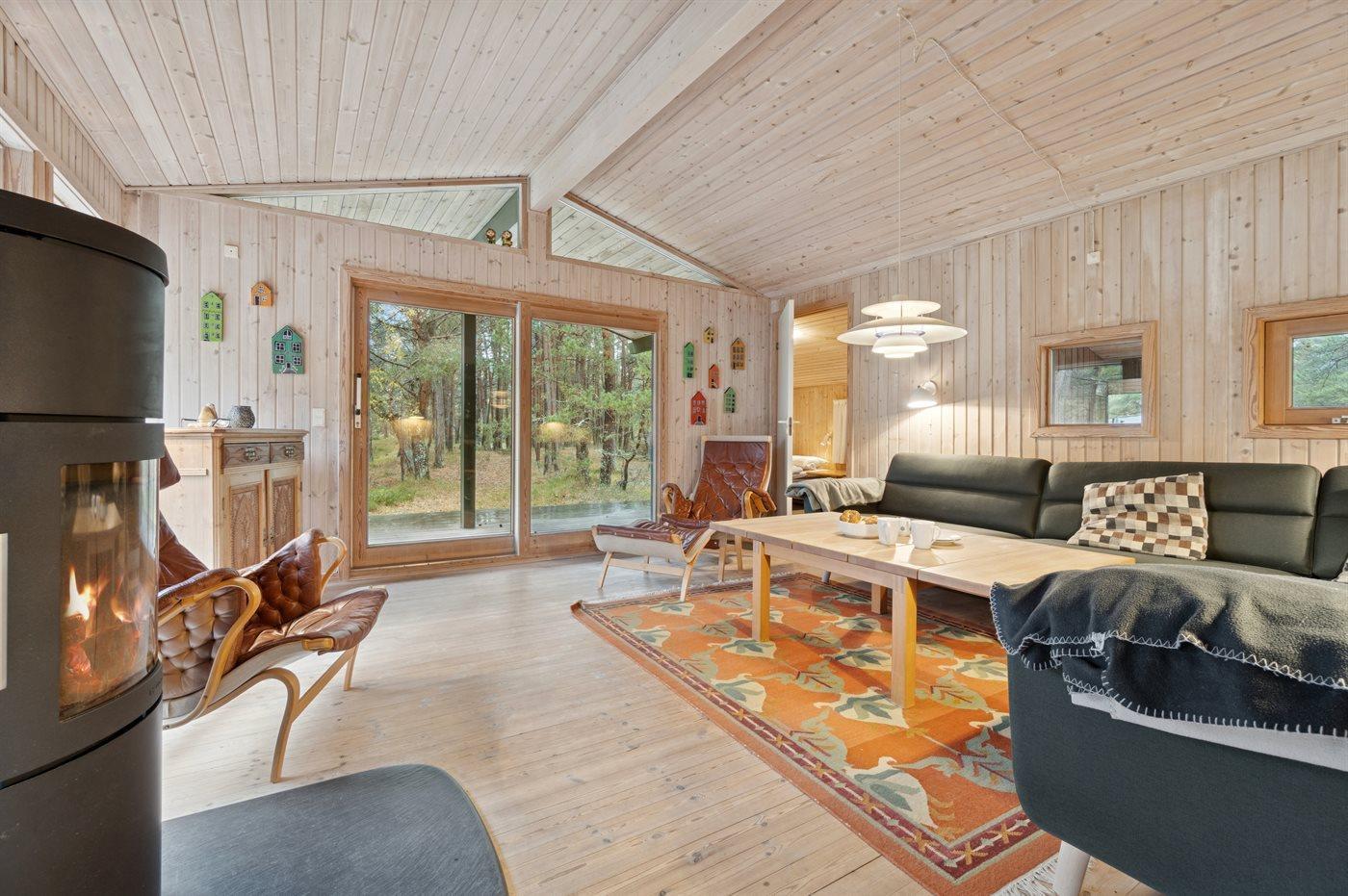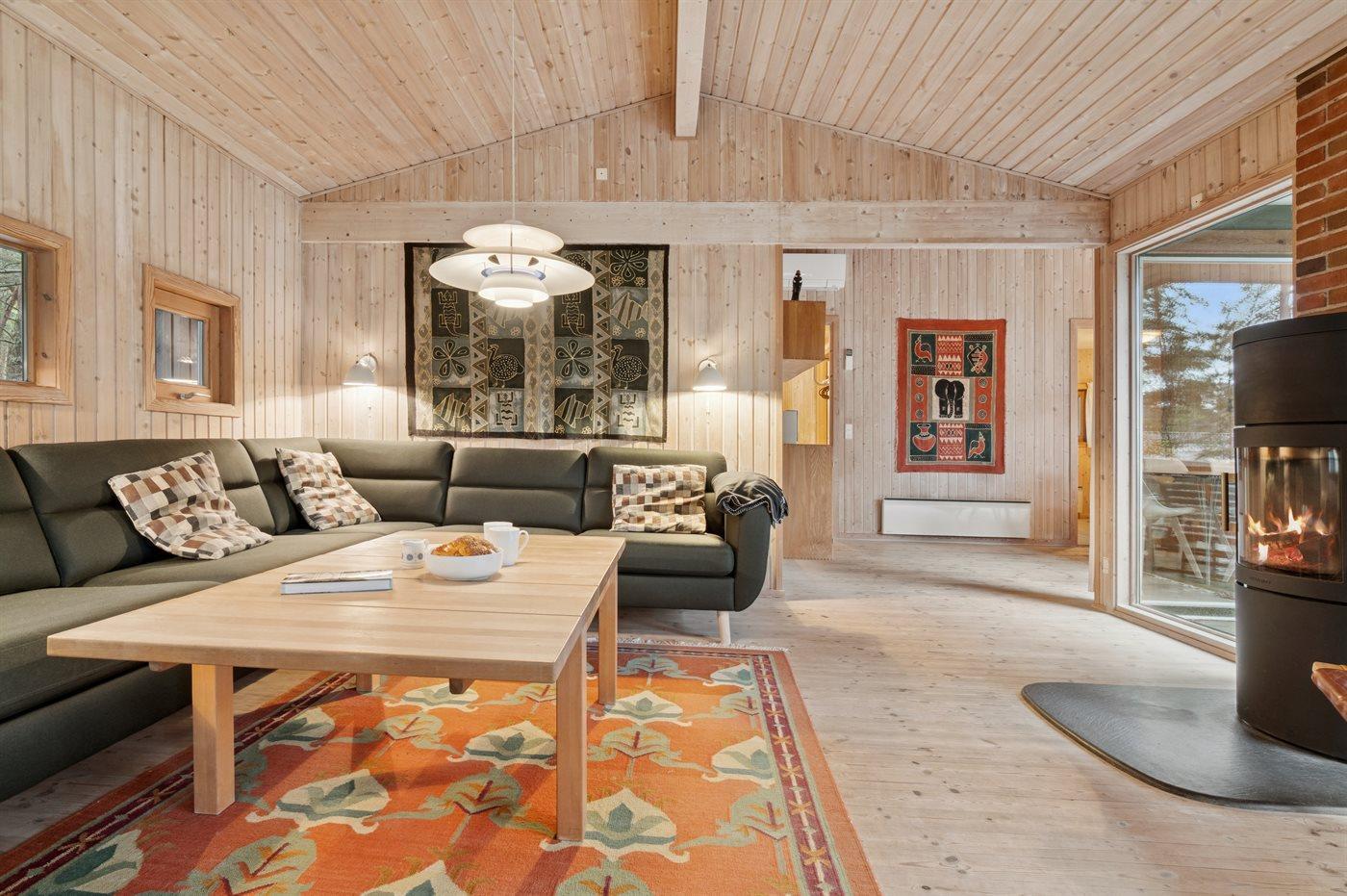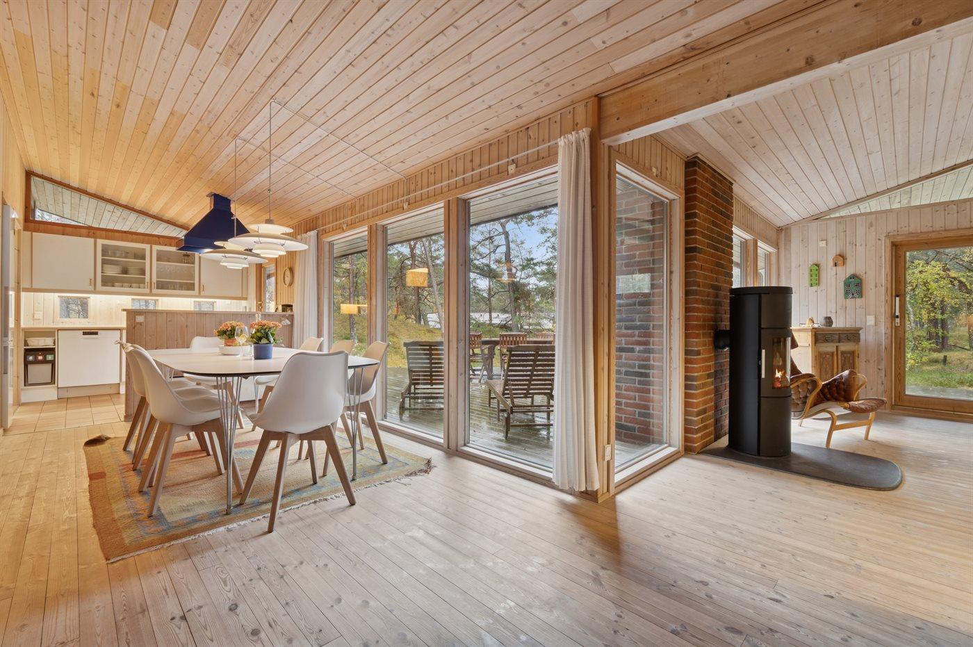 Das Haus ist auf fast allen Seiten, von einer großen, schönen Holzterrasse umgeben, und es gibt auch eine herrliche überdachte Terrasse, auf der du die Abende in Ruhe genießen kannst, nachdem der Tau gefallen ist. Das Wohnzimmer und die Wohnküche sind hell und geräumig, mit einem schönen Essbereich, wo es für die ganze Familie Platz gibt.