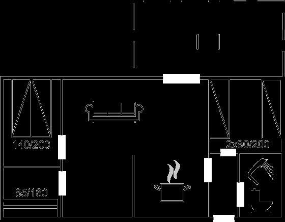 Die Schlafplätze verteilen sich auf 3 Schlafräume. 2 Schlafplätze in einem Doppelbett. 2 Schlafplätze in Einzelbetten. 2 Schlafplätze in einem Etagenbett.