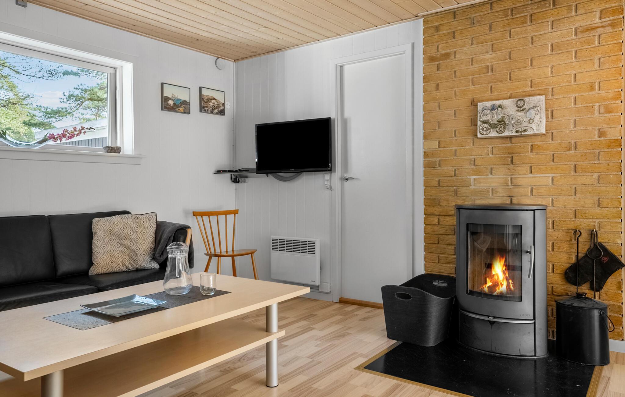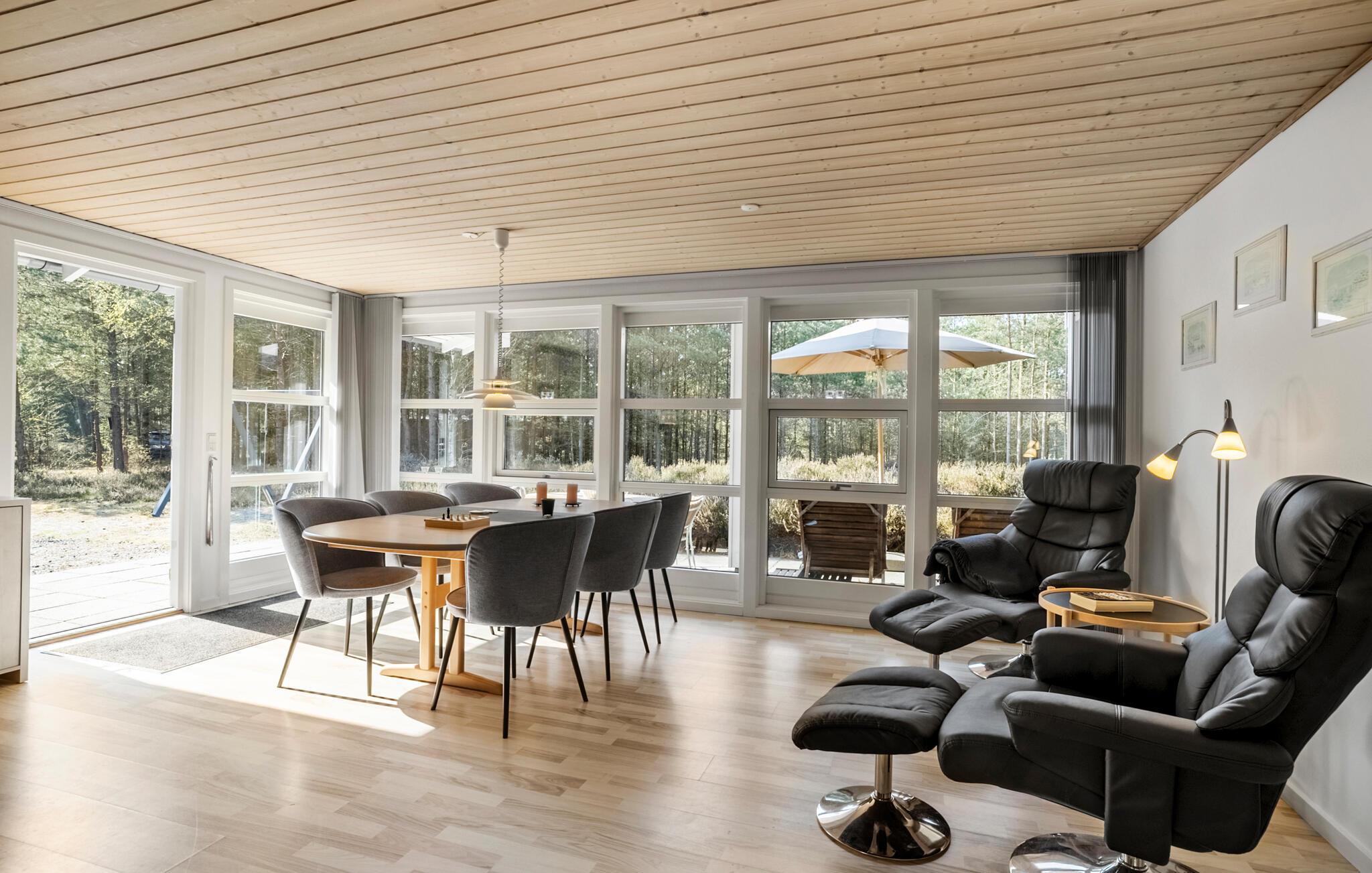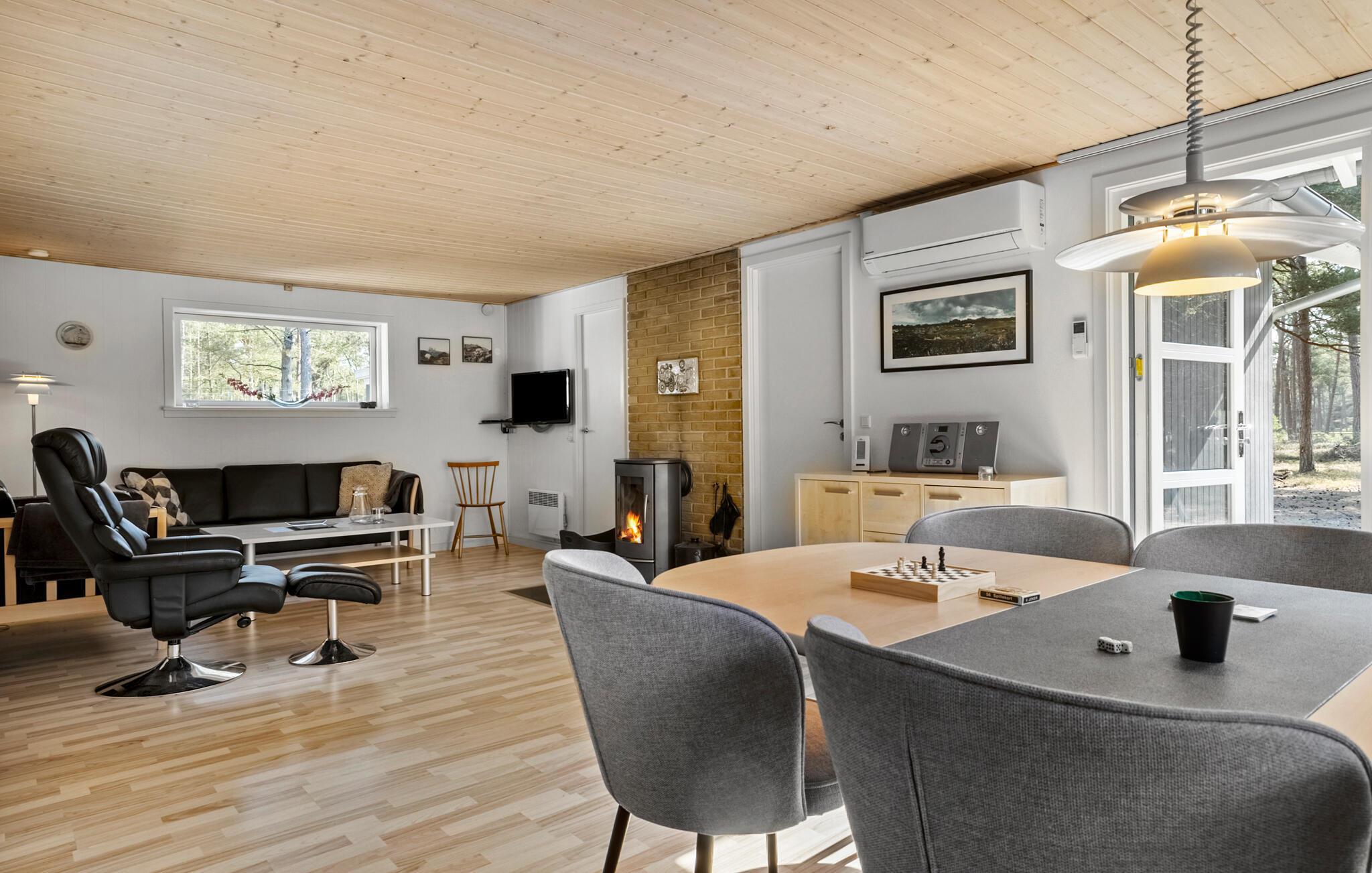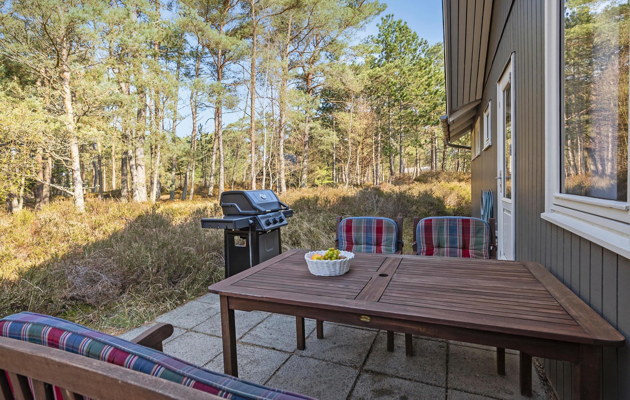 Gemütliches Ferienhaus in Dueodde, umgeben von Kiefern und Dünen, mit Whirlpool und Kaminofen für entspannte Urlaubstage.