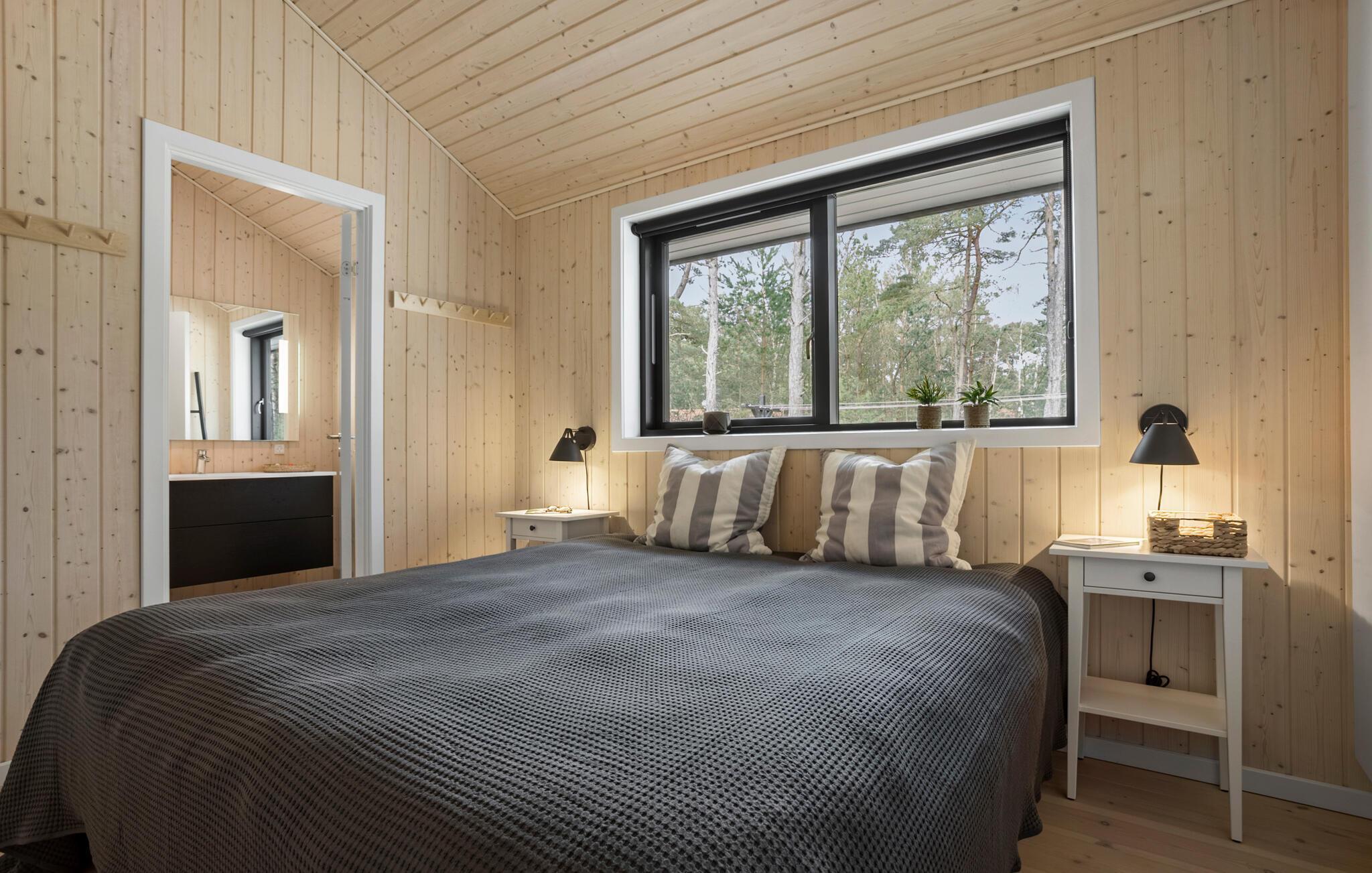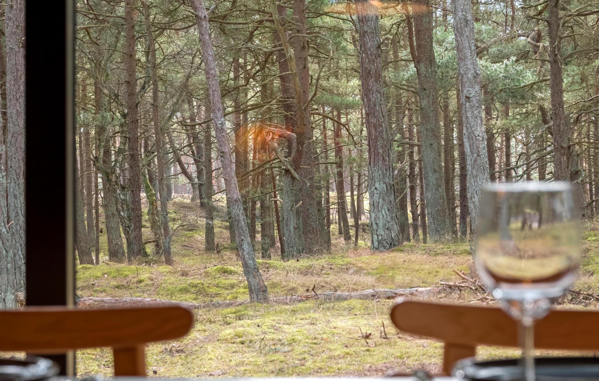 Modernes Ferienhaus auf Bornholm mit Waldblick, Kaminofen und großer Terrasse für erholsame Urlaubstage.
