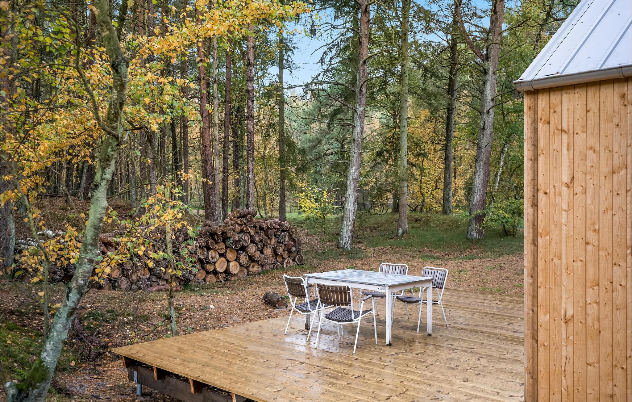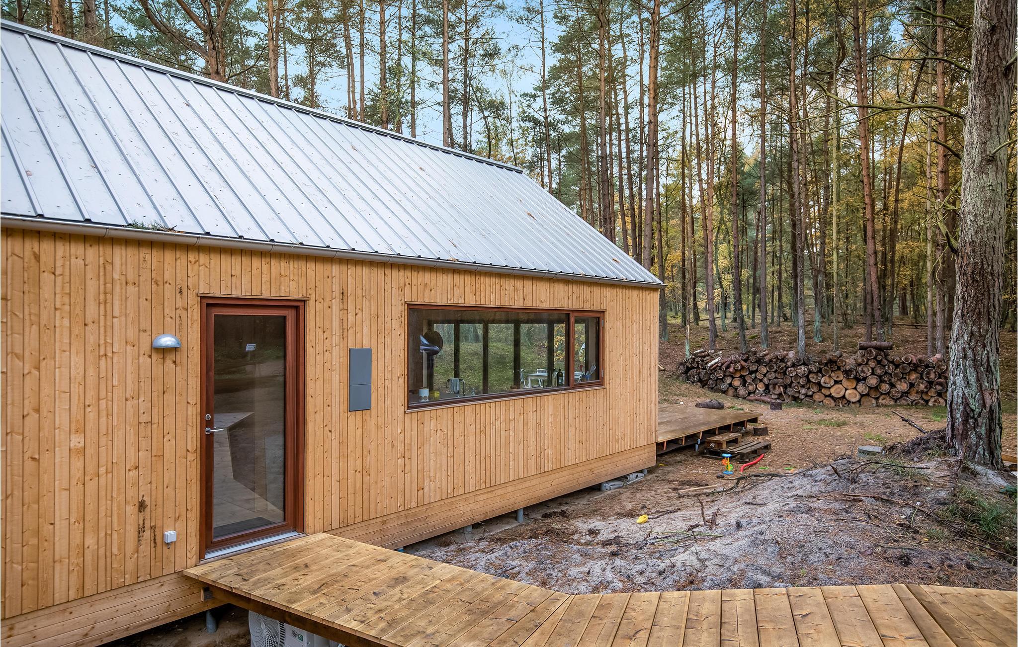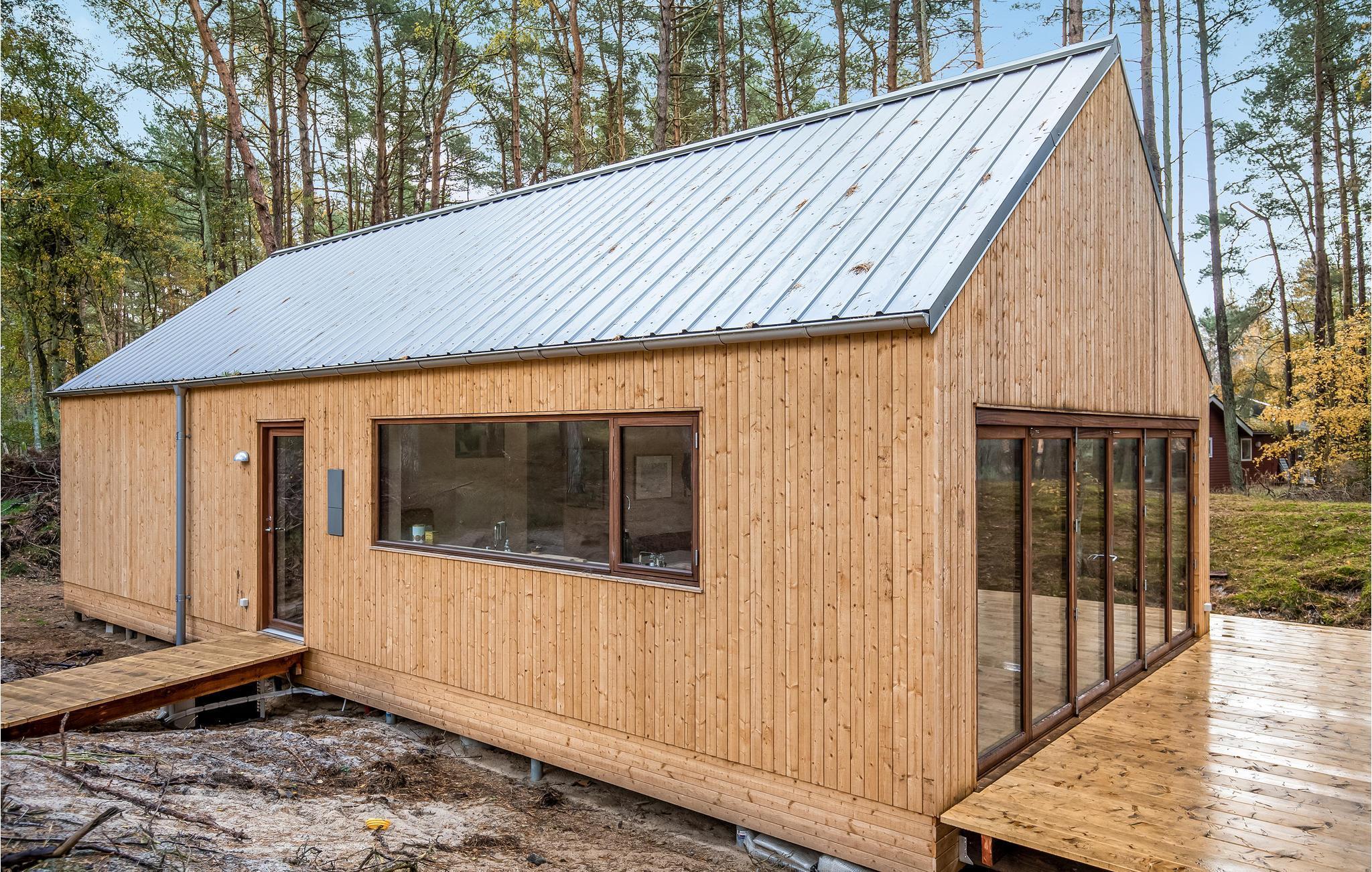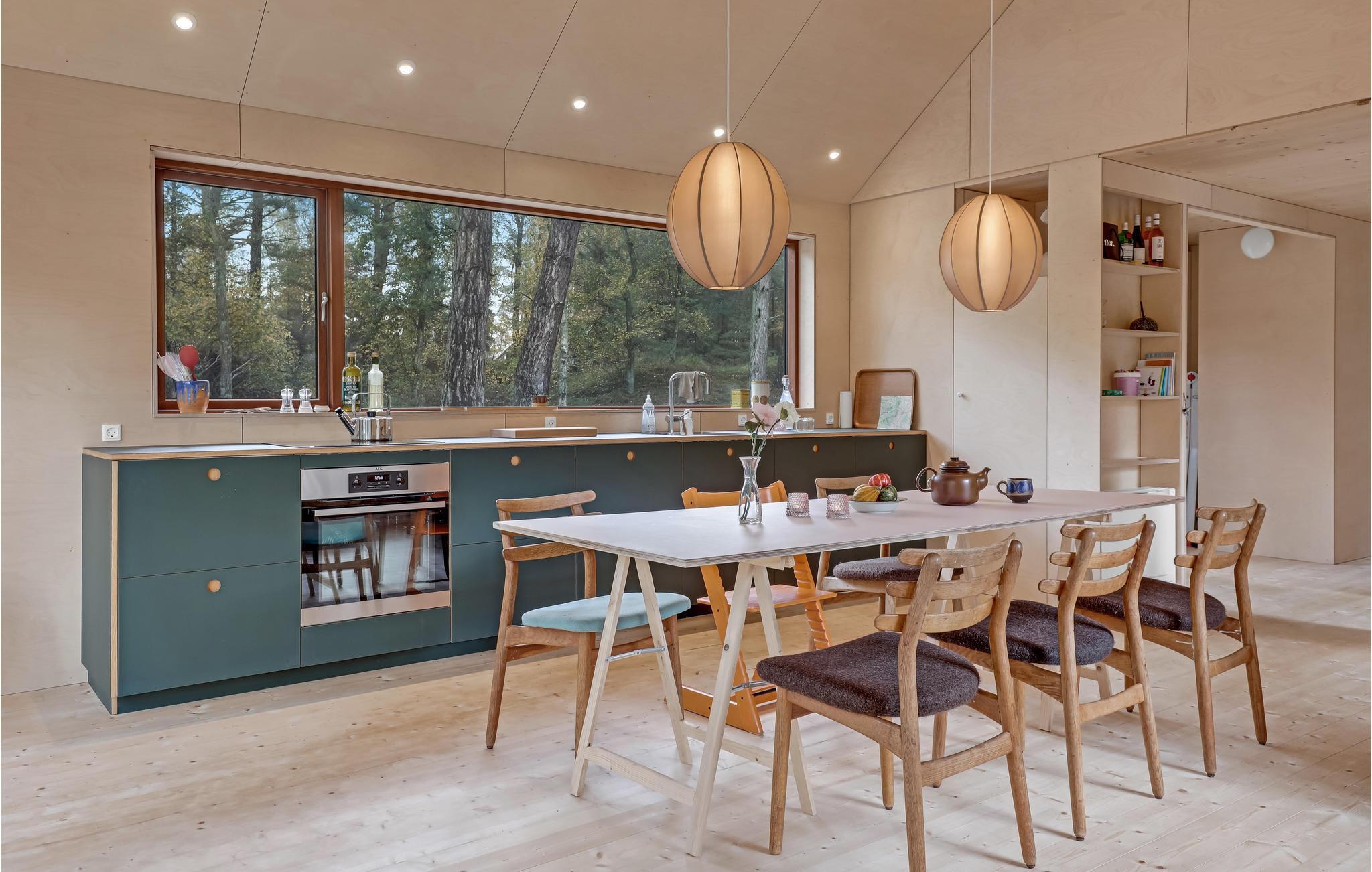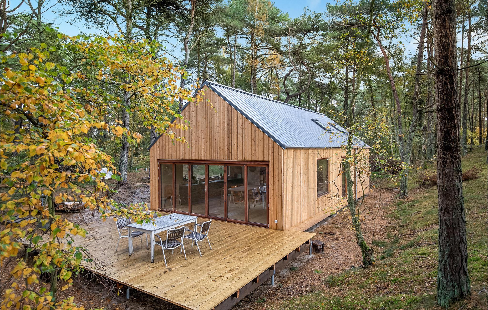 Freuen Sie sich auf einen entspannenden Aufenthalt in diesem modernes, in einem Waldstück gelegenen Ferienhaus. Die vielen Fensterpartien und Türe des Hauses lassen vieles Licht ein und schaffen eine angenehme Atmosphäre und Nähe zur umgebenden Landschaft. Der Mittelpunkt des Hauses ist das große, kombinerte Wohnzimmer und Küche mit Dachschräge, sodass Sie sich in der modern ausgestatteten Küche kulinarisch entfalten und gleichzeitig mit den übrigen Gästen unterhalten können. Am Esstisch können Sie mit Ihrer Familie oder Ihren Freunden schön gemeinsam essen, und an Sommerabenden die Türe aufmachen und sich auf die große Terrase zurückziehen, wo Sie mit Waldblick und Vogelgesang den Tag ausklingen lassen können.