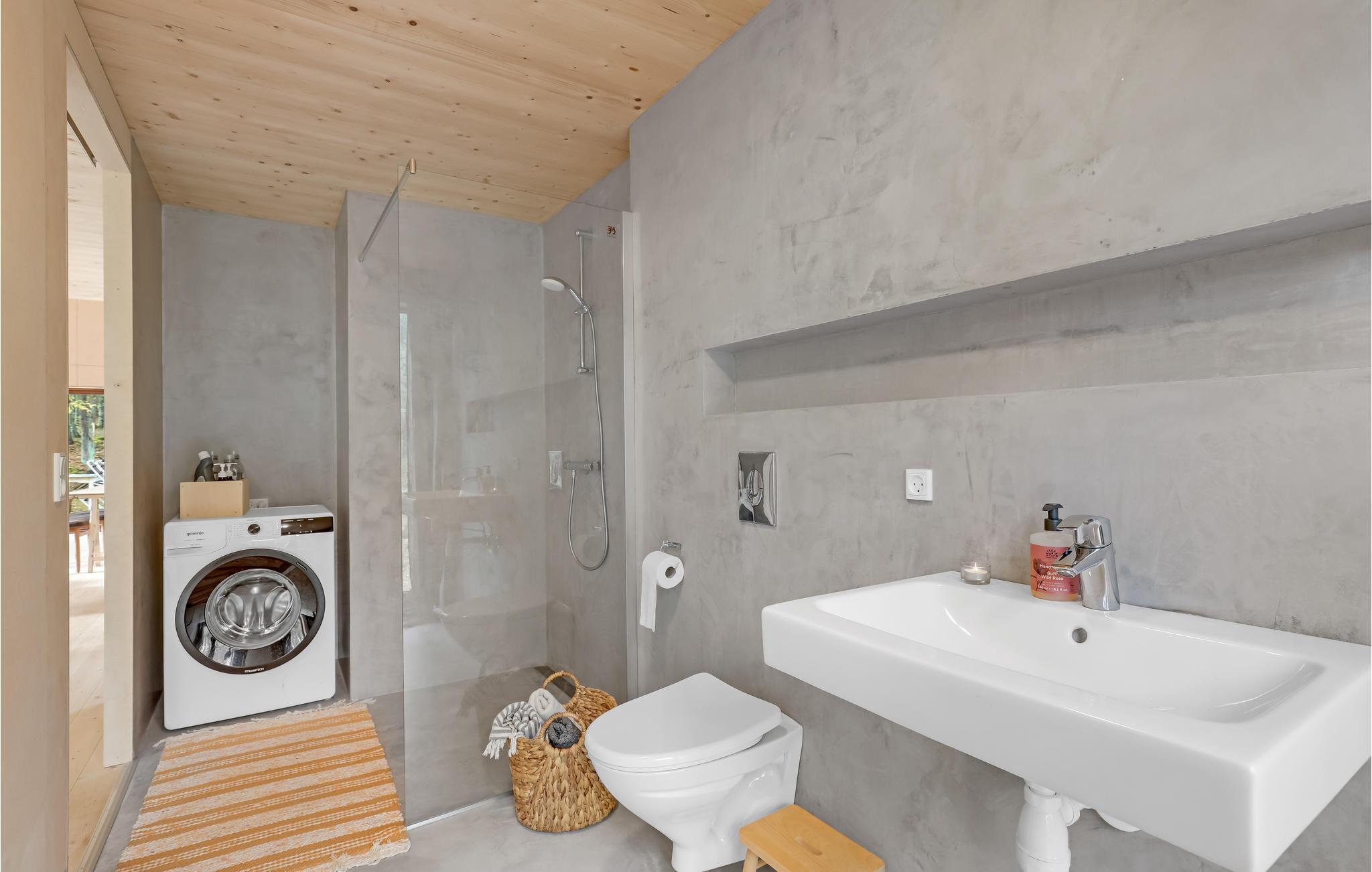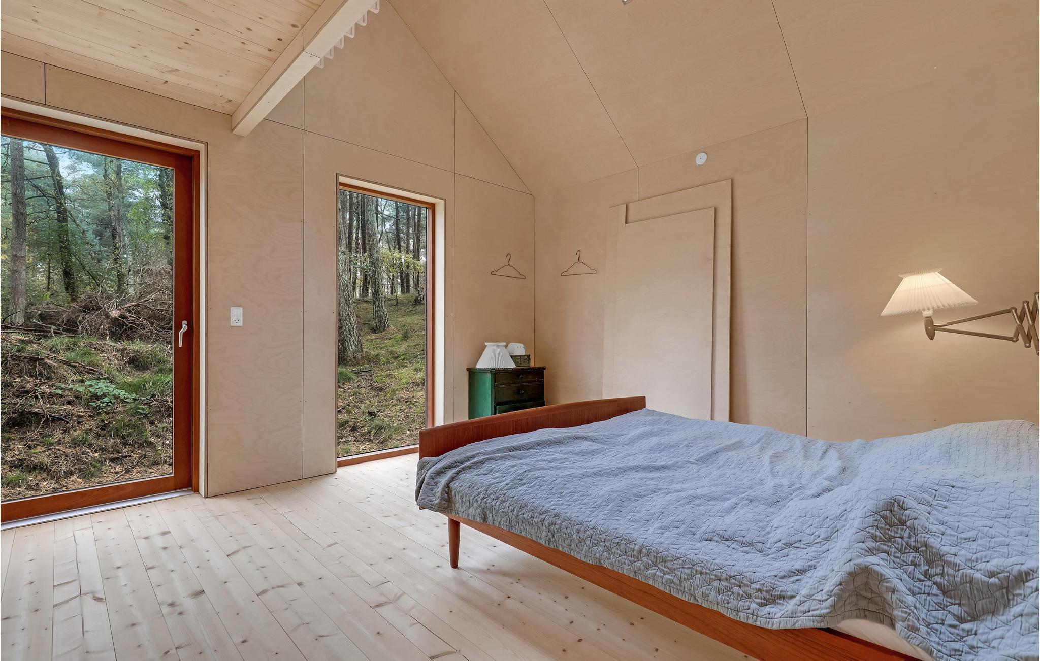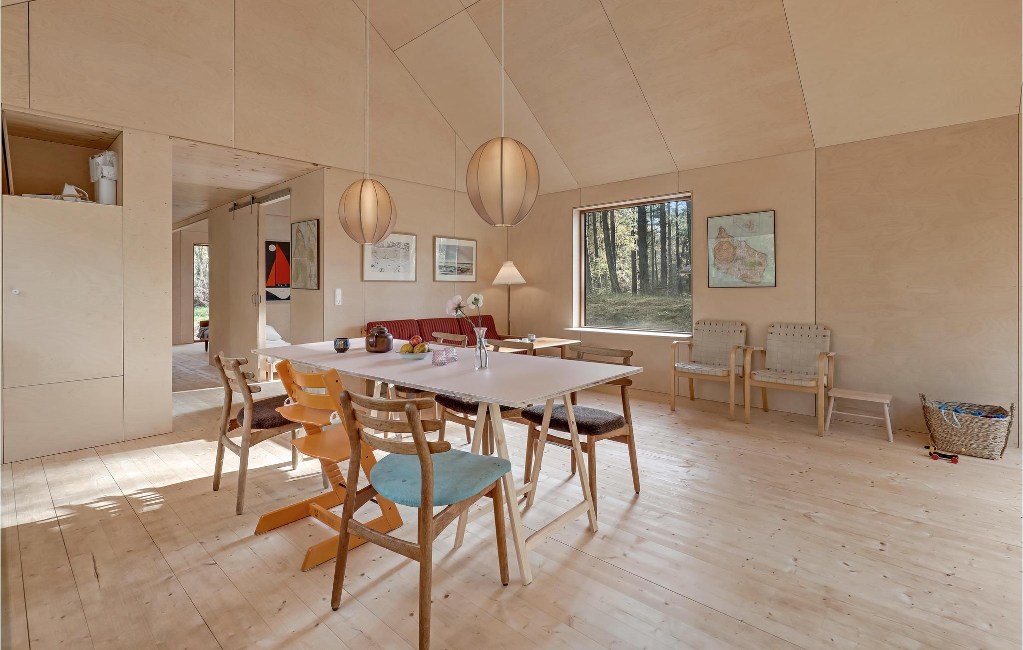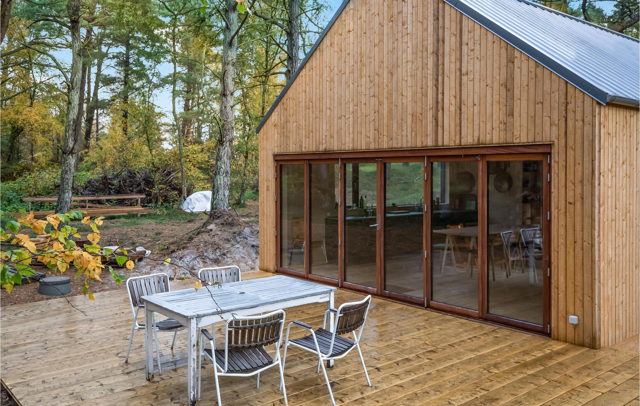 Freuen Sie sich auf einen entspannenden Aufenthalt in diesem modernes, in einem Waldstück gelegenen Ferienhaus. Die vielen Fensterpartien und Türe des Hauses lassen vieles Licht ein und schaffen eine angenehme Atmosphäre und Nähe zur umgebenden Landschaft. Der Mittelpunkt des Hauses ist das große, kombinerte Wohnzimmer und Küche mit Dachschräge, sodass Sie sich in der modern ausgestatteten Küche kulinarisch entfalten und gleichzeitig mit den übrigen Gästen unterhalten können. Am Esstisch können Sie mit Ihrer Familie oder Ihren Freunden schön gemeinsam essen, und an Sommerabenden die Türe aufmachen und sich auf die große Terrase zurückziehen, wo Sie mit Waldblick und Vogelgesang den Tag ausklingen lassen können.