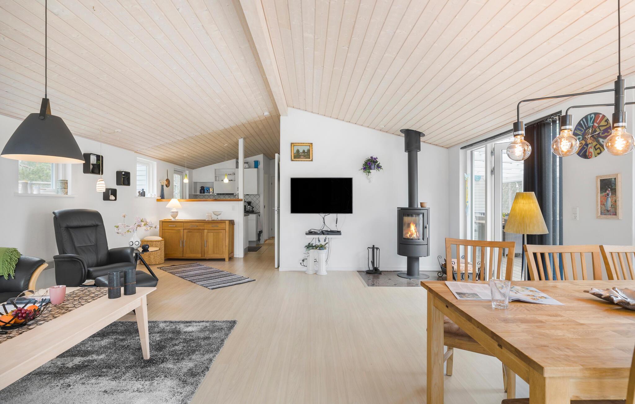Charmantes Holzferienhaus nahe Sandstrand mit moderner Küche und Kaminofen.