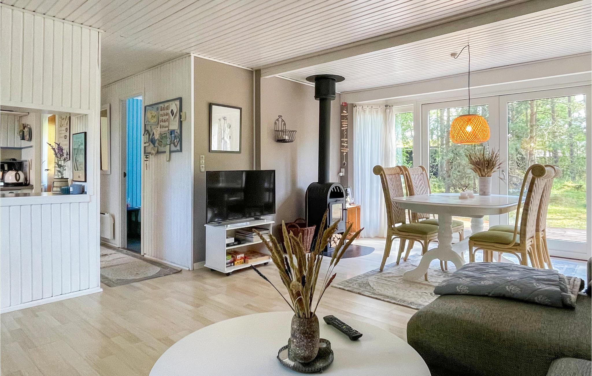 Willkommen in diesem geräumigen, hellen und geschmackvoll eingerichteten Ferienhaus. Sie werden viele gemütliche Stunden im Wohnzimmer verbringen, wo Sie mit Chromecast Filme und Serien auf den Fernseher streamen, Musik hören und an kühlen Tagen dem wärmenden, knisternden Feuer im Ofen lauschen. Hier finden Sie auch einen Essbereich und die charmante, offene Küche vor. Große Fenster lassen viel Licht herein und eröffnen den Blick auf die grüne Umgebung. Im Nebengebäude finden Sie eine Waschmaschine.