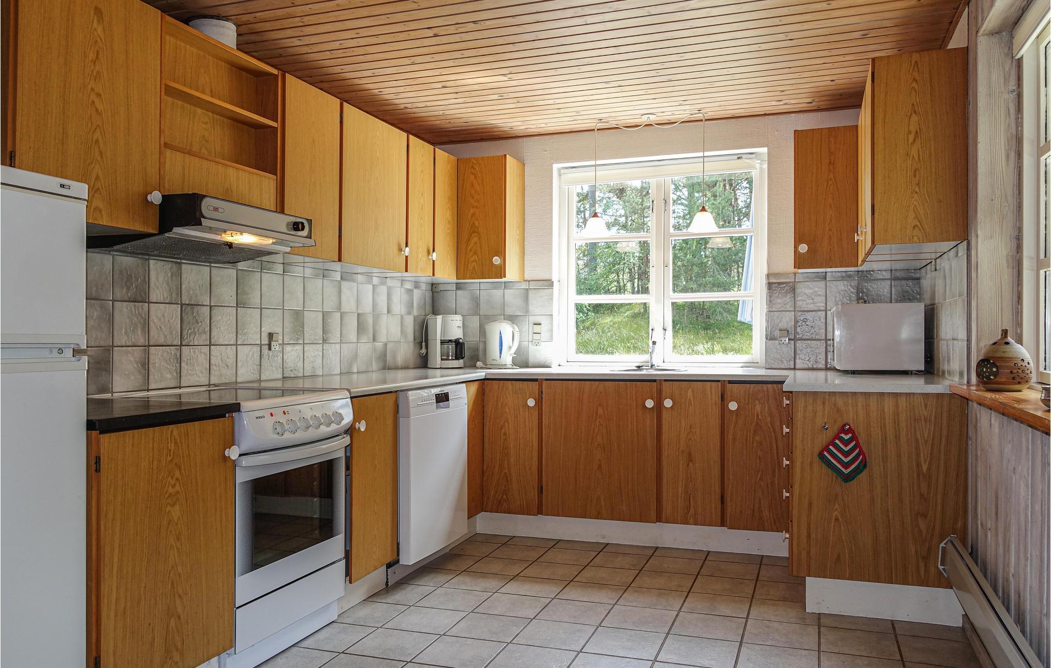 Holzböden, -wände und -decken verleihen diesem Ferienhaus seinen urigen Charme. Das Herzstück des Hauses bildet das großzügige Wohnzimmer, in dem Sie sich bei gemütlichen Gesprächen, Kartenspielen, Lektüre oder einfach nur beim Fernsehen in wahre Urlaubslaune fallen lassen können. Im Winter können Sie die Wärme und die gemütliche Atmosphäre des Kaminofens genießen. In der gut ausgestatteten Küche lässt es sich bestens und vielfältig kochen.