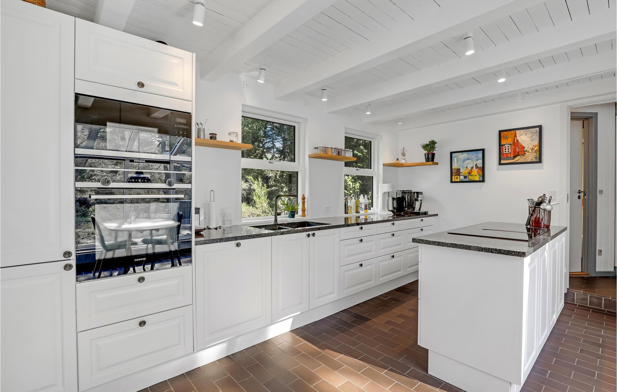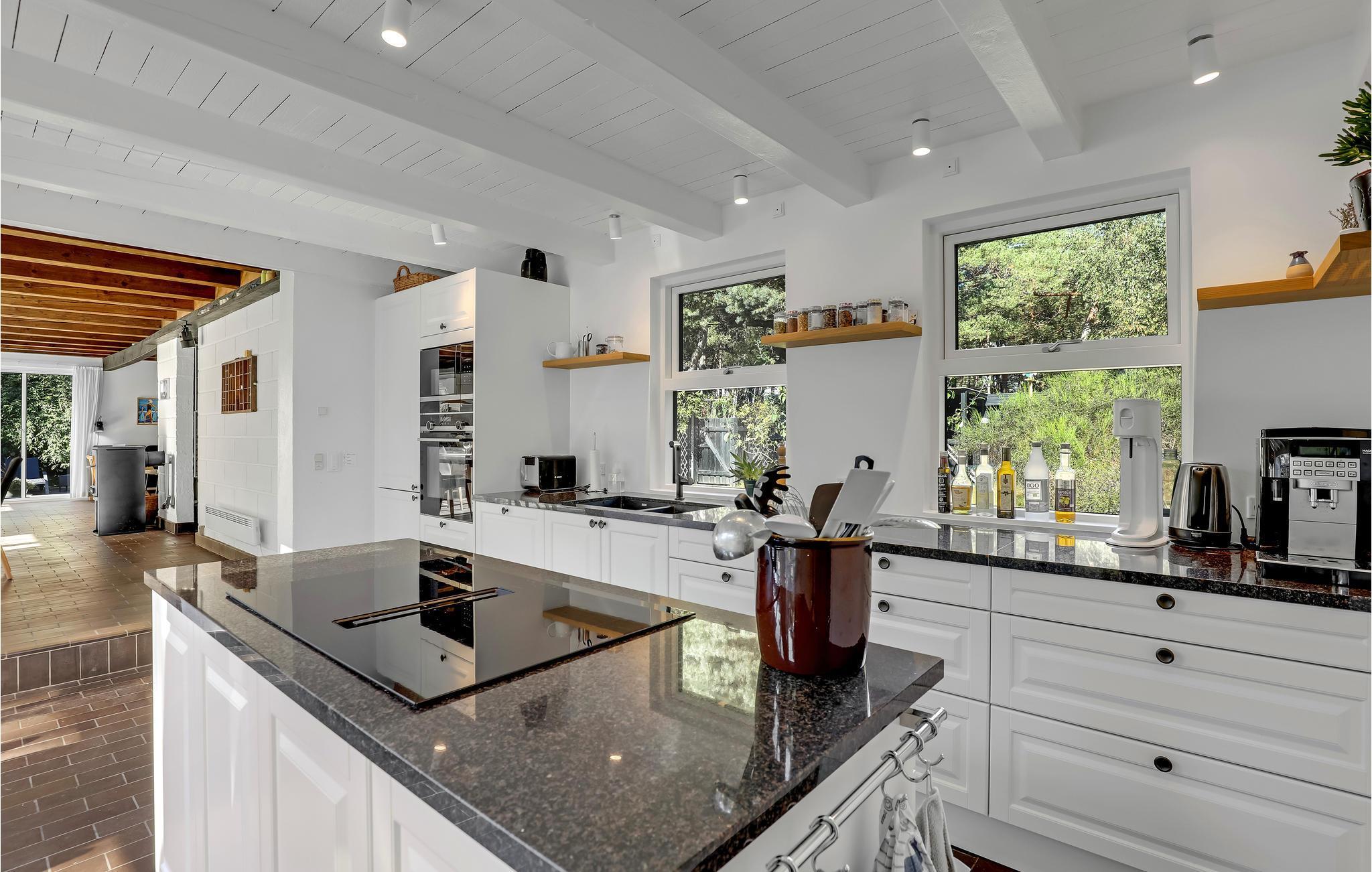 Willkommen in einem Ferienhaus der Extraklasse mit moderner Einrichtung und hochwertigen Möbeln. Hier empfängt Sie eine schöne, offene und gut ausgestattete Küche, in der Sie im Handumdrehen köstliche Gerichte zubereiten können. Im gemütlichen, großen Wohnzimmer können Sie es sich so richtig bequem machen, Filme schauen und im Winter am Ofenherd die Wärme und die gemütliche Atmosphäre genießen. Im neueren Teil des Hauses (mit Fußbodenheizung) befindet sich ein Schlafzimmer mit zwei Einzelbetten und Zugang zur Terrasse sowie ein großes Schlafzimmer mit zwei Betten, einem Arbeitsbereich, TV (nur deutsche Sender) und Zugang zur Terrasse. Im 1. Stock befindet sich ein weiteres gemütliches Schlafzimmer mit zwei Einzelbetten. Das Haus verfügt über zwei Badezimmer mit Fußbodenheizung, eines davon mit Waschmaschine, Trockner und Badewanne.