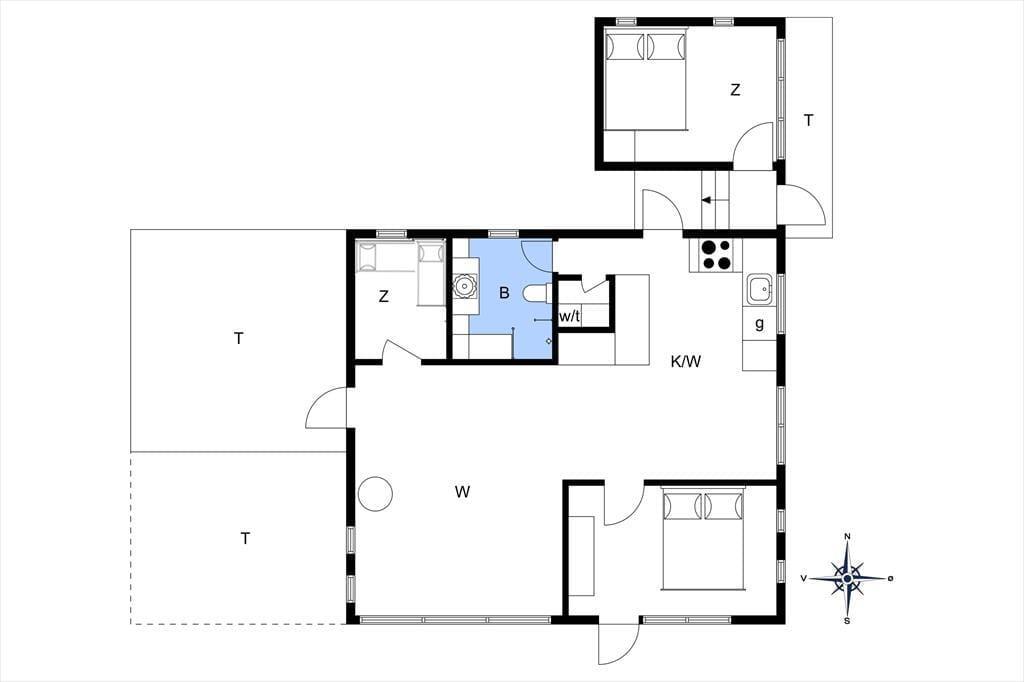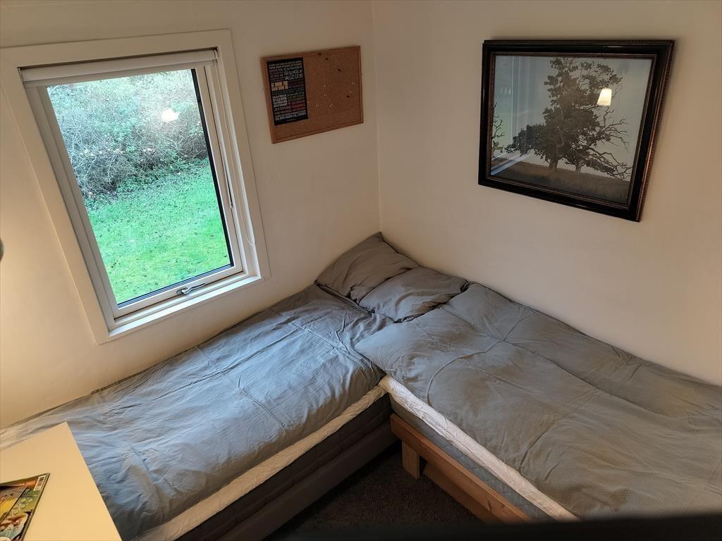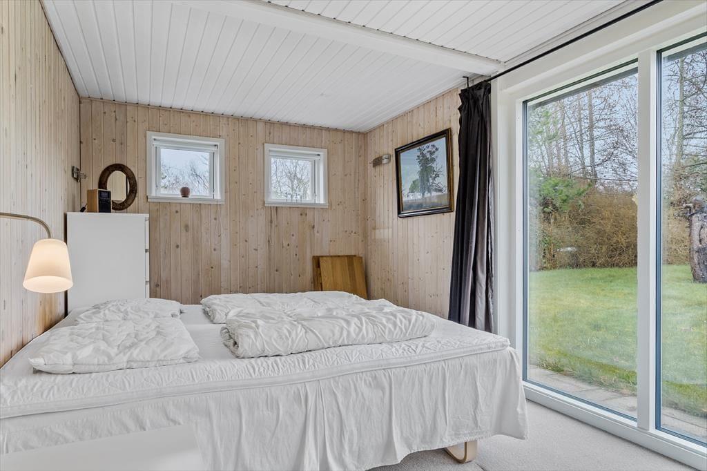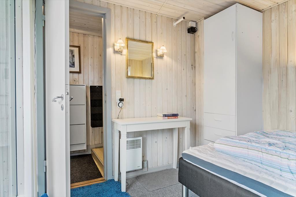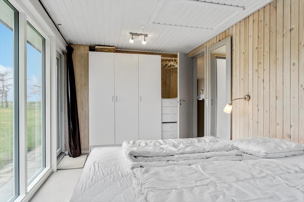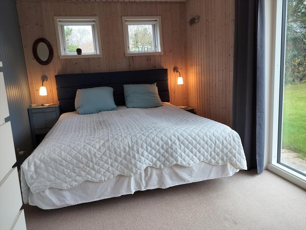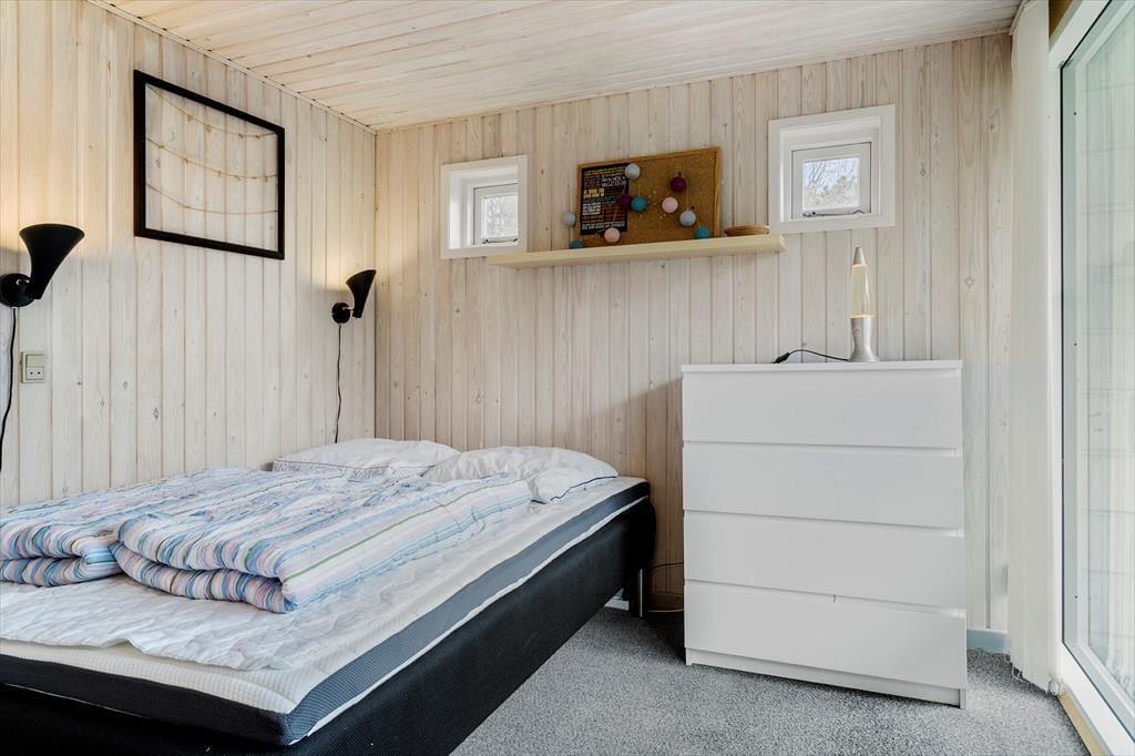 Das Ferienhaus verfügt über drei schöne Schlafzimmer, die Platz für insgesamt 5 Erwachsene und 1 Kind bieten. Vom Wohnzimmer aus gibt es direkten Zugang zu einem Schlafzimmer mit zwei Einzelbetten, viel Stauraum, Nachttischlampen und einem Fenster mit Blick auf den Garten. Im gegenüberliegenden Eck des Wohnzimmers und der Küche liegt das zweite Schlafzimmer mit einem Doppelbett und großen, südlich ausgerichteten bodentiefen Fenstern. Dieses Schlafzimmer strahlt Ferienhausgemütlichkeit aus und vermittelt eine Verbindung zur Natur, da eine Glastür in den Garten führt. Auch hier gibt es viel Stauraum. Das dritte Schlafzimmer befindet sich in einem Anbau, der mit dem Eingangsbereich und dem Haupthaus verbunden ist. Dieses Zimmer verfügt über ein 140 x 200 cm großes Doppelbett, Stauraum und einen Schreibtisch. Wie in den anderen Schlafzimmern gibt es auch hier schöne Fenster und einen Teppichboden.