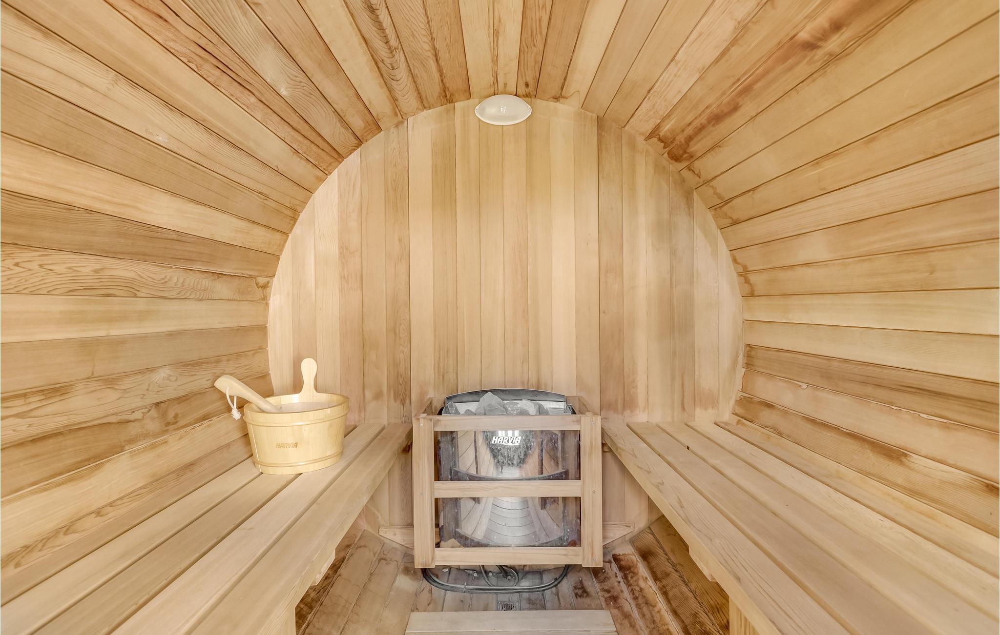 Der Garten ist mit Bäumen und Büschen begrünt und es gibt mehrere Terassenareale, die teilweise überdacht sind. In Verlängerung mit der Terrasse liegt eine Außensauna, so dass Sie in der kalten Jahreszeit ein Winterbad mit der wärmenden Sauna kombinieren können.